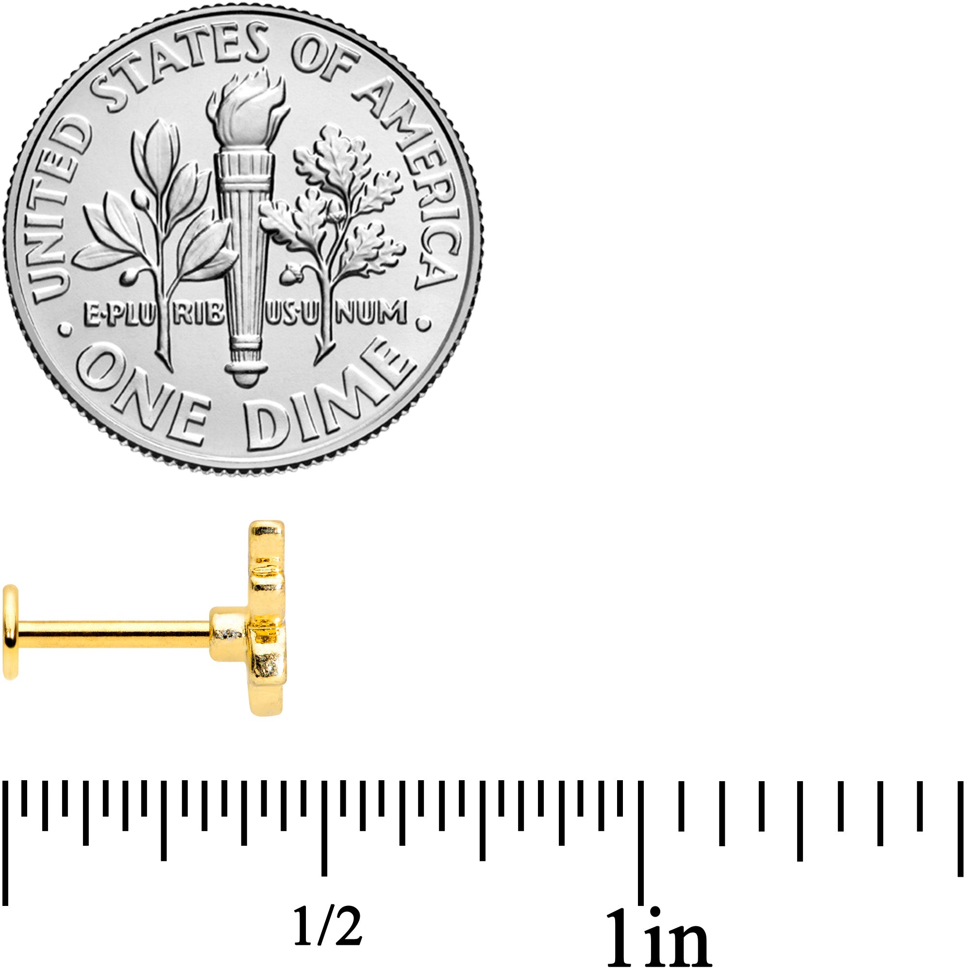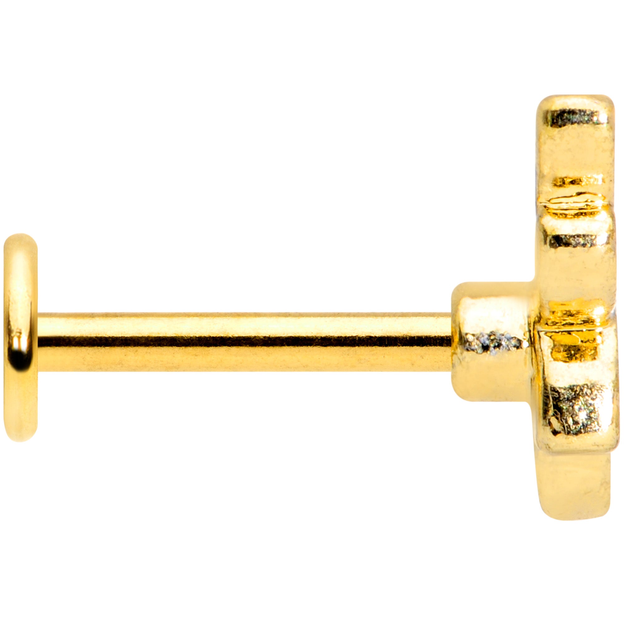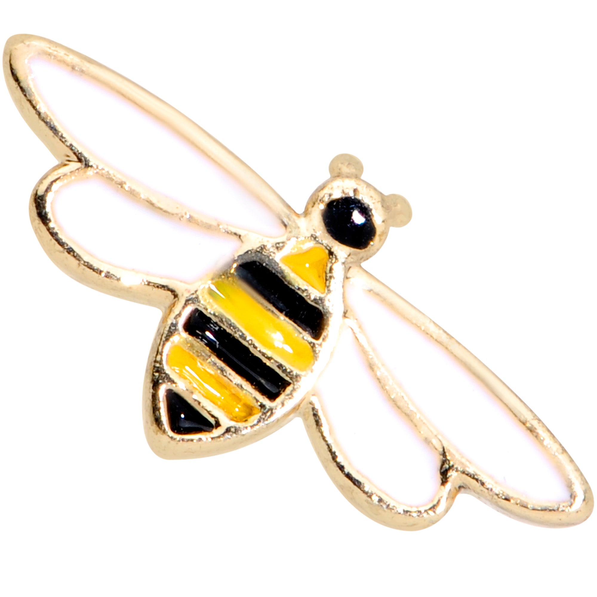 Honey, you're going to go absolutely buggy for this 16 gauge lip ring! It's made with an 8mm gold tone PVD over 316L surgical grade stainless steel straight barbell with a flat disc ends. The front features this elegantly simple yellow and black striped bee charm. And you can wear it in multiple piercings including lip, monroe, and cartilage piercings like the helix, tragus, and conch piercings. Catch a buzz with this elegantly entomological cartilage earring.