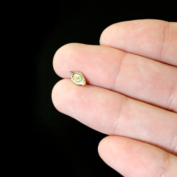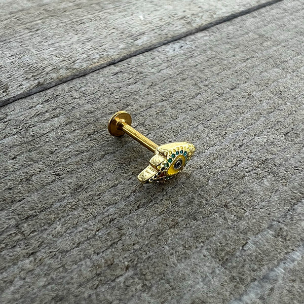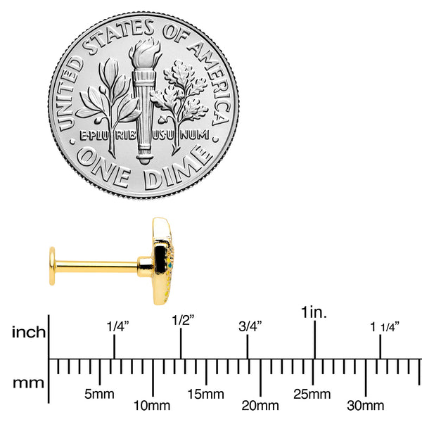 The feather left behind on this 16 gauge lip ring came from one bold bird! It's made with an 8mm gold tone PVD over 316L surgical grade stainless steel straight post with a flat disc end. It features a peacock feather charm, in bright shades of green and yellow. The central portion of the feather features blue embellishment for a truly eye-catching look. You can even flaunt this feather in multiple piercings including lip, monroe, tragus, helix, and some conch piercings. You'll want to preen like a pretty peacock when you're rocking this fabulous feather cartilage jewelry!