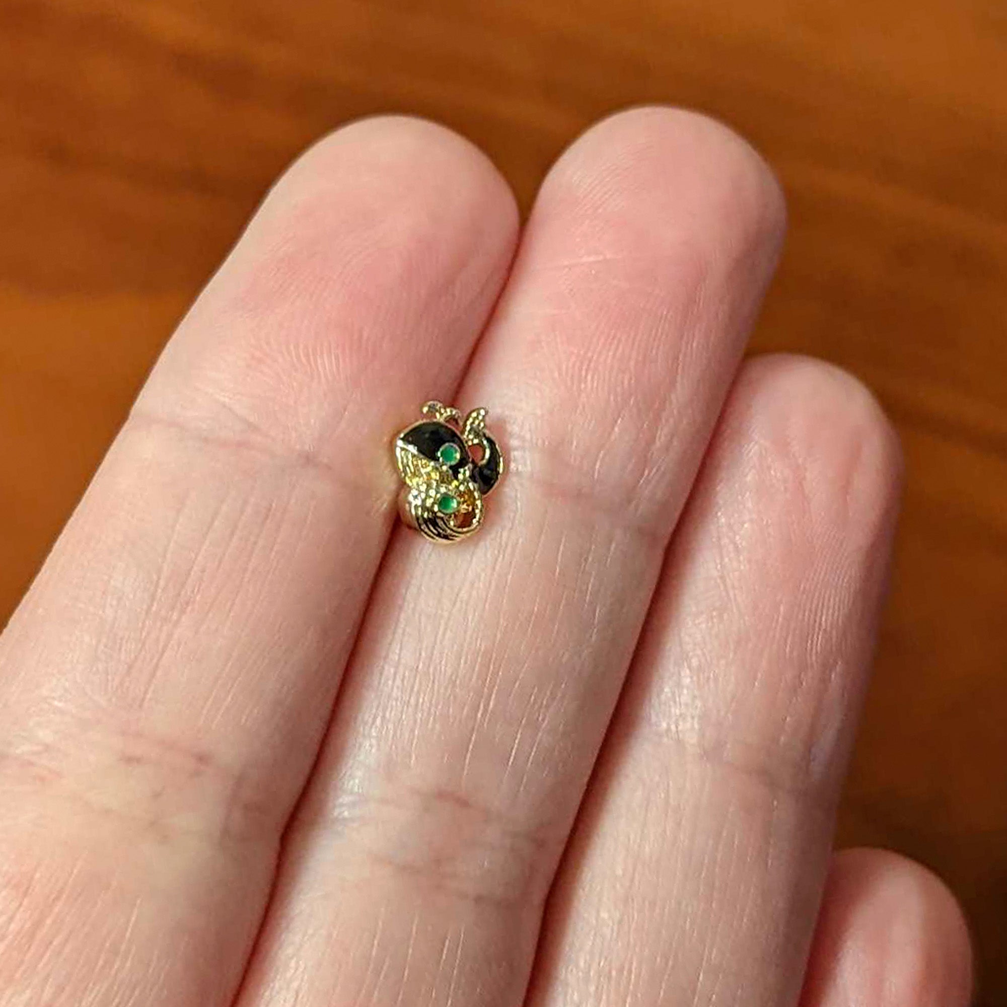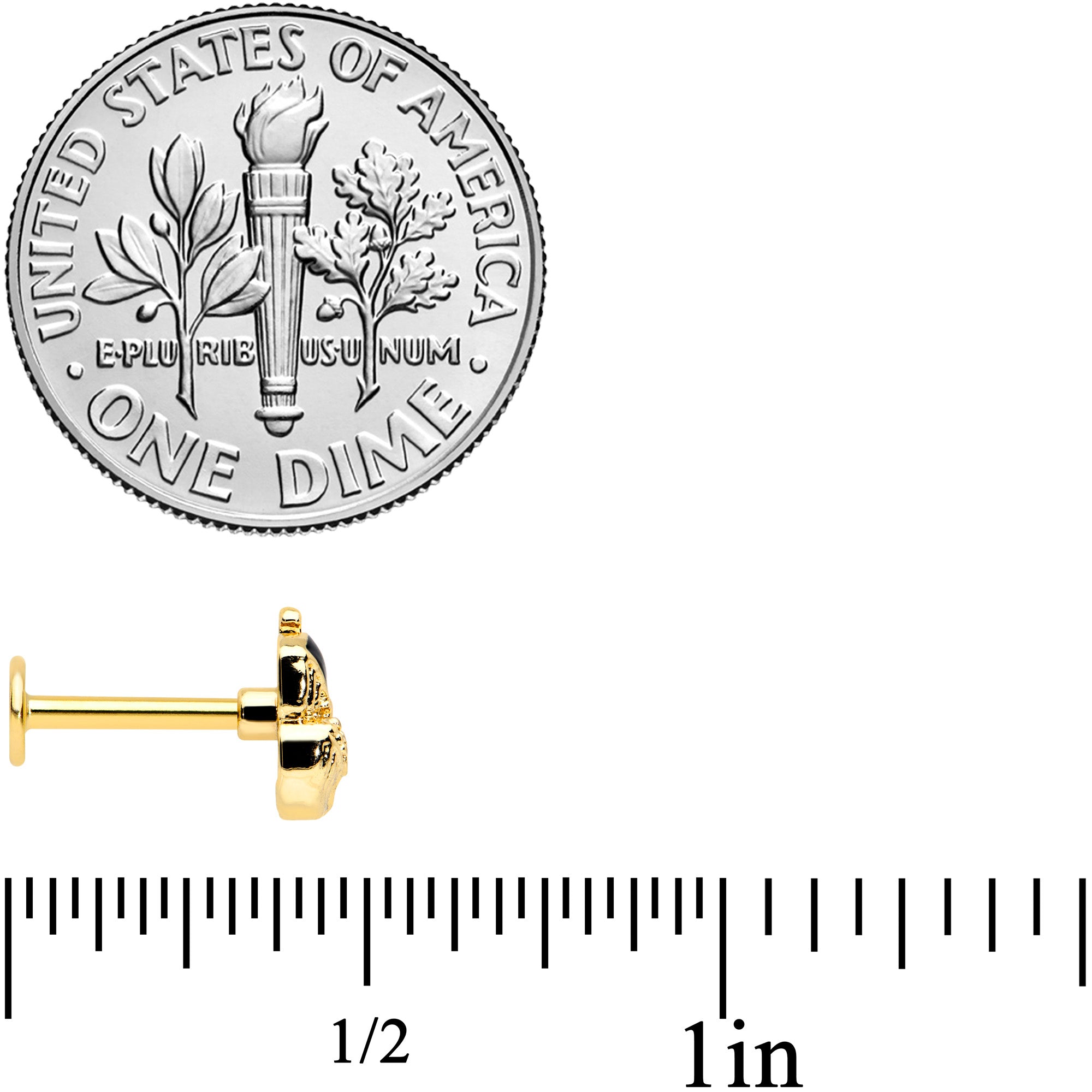The whales on this 16 gauge lip ring show that style runs in the family! It's made with an 8mm gold tone PVD over 316L surgical grade stainless steel straight barbell with a flat disc end. It features a whale charm, with a mother whale and baby. The mother has black embellishment and a green eye while the baby is set with textured detailing and also has a green eye embellishment. You can even rock them in multiple piercings including lip, monroe, tragus, helix, and some conch piercings. Show your love for these gorgeous creatures family-style with this wonderful whale-themed cartilage piercing jewelry!