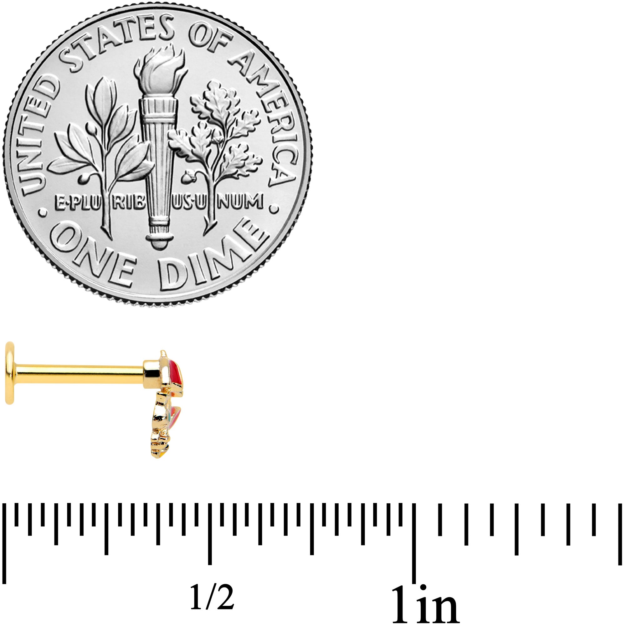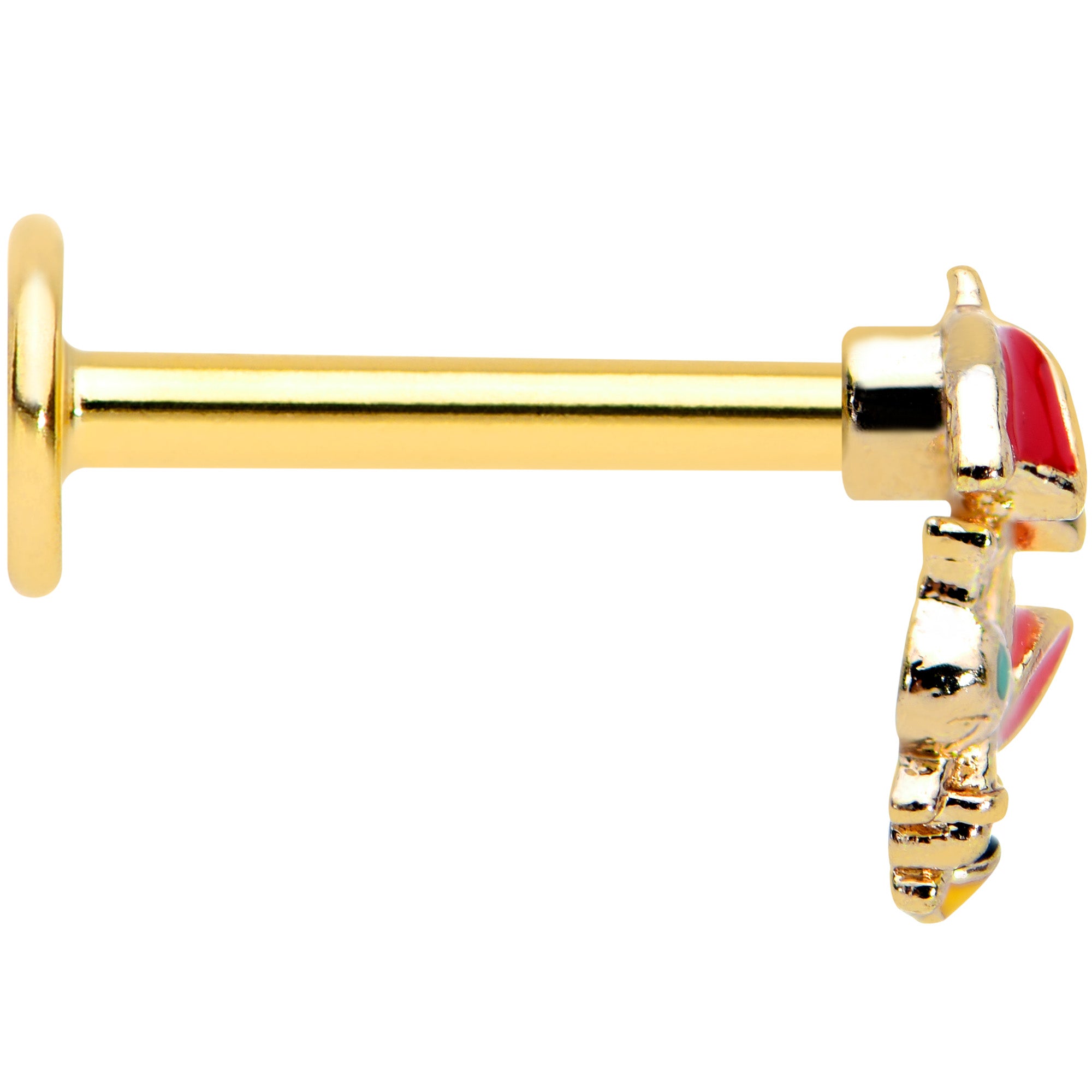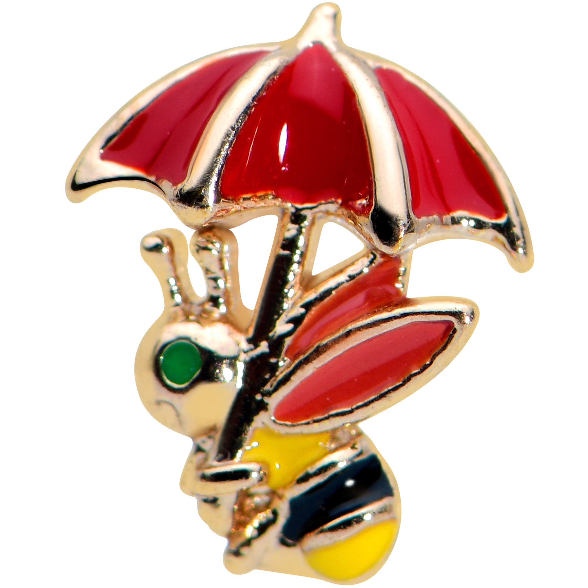 Even rainy days can bee beautiful, like on this 16 gauge lip ring! It's made with an 8mm gold tone PVD over 316L surgical grade stainless steel straight barbell with a flat disc end. It features a bee charm, inlaid in yellow and black. The bee is carrying a red umbrella and features matching red embellishment on its wings. It also features a green eye for an added touch of style and color! You can even wear it in multiple piercings including lip, monroe, tragus, helix, and some conch piercings. This is one honey of a cartilage piercing ring!