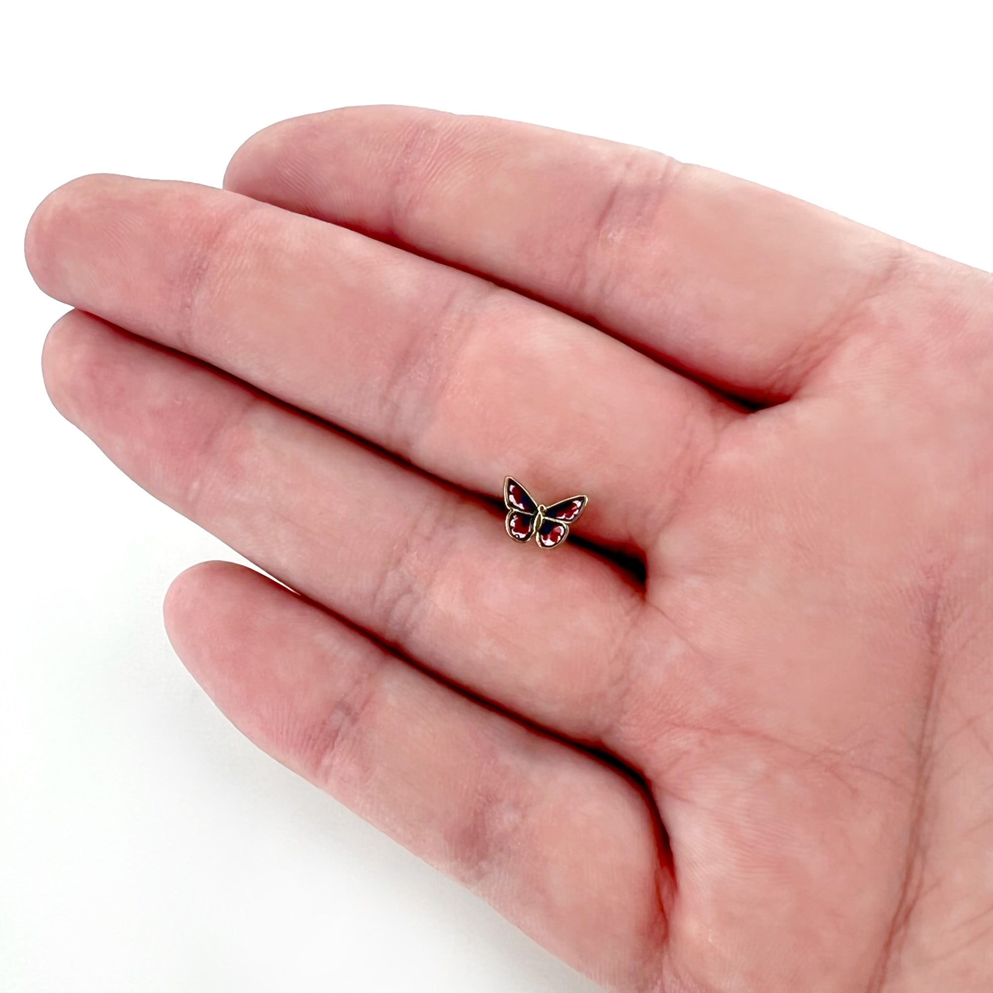 Spread your wings in striking color with this 16 gauge lip ring! It's made with an 8mm gold tone PVD over 316L surgical grade stainless steel straight post with a flat disc back. It features a butterfly charm, the wings inlaid in red and blue on a white background. You can even wear it in multiple piercings including lip, monroe, tragus, helix, and some conch piercings. You'll be ready to morph into something new and lovely with this butterfly cartilage jewelry.