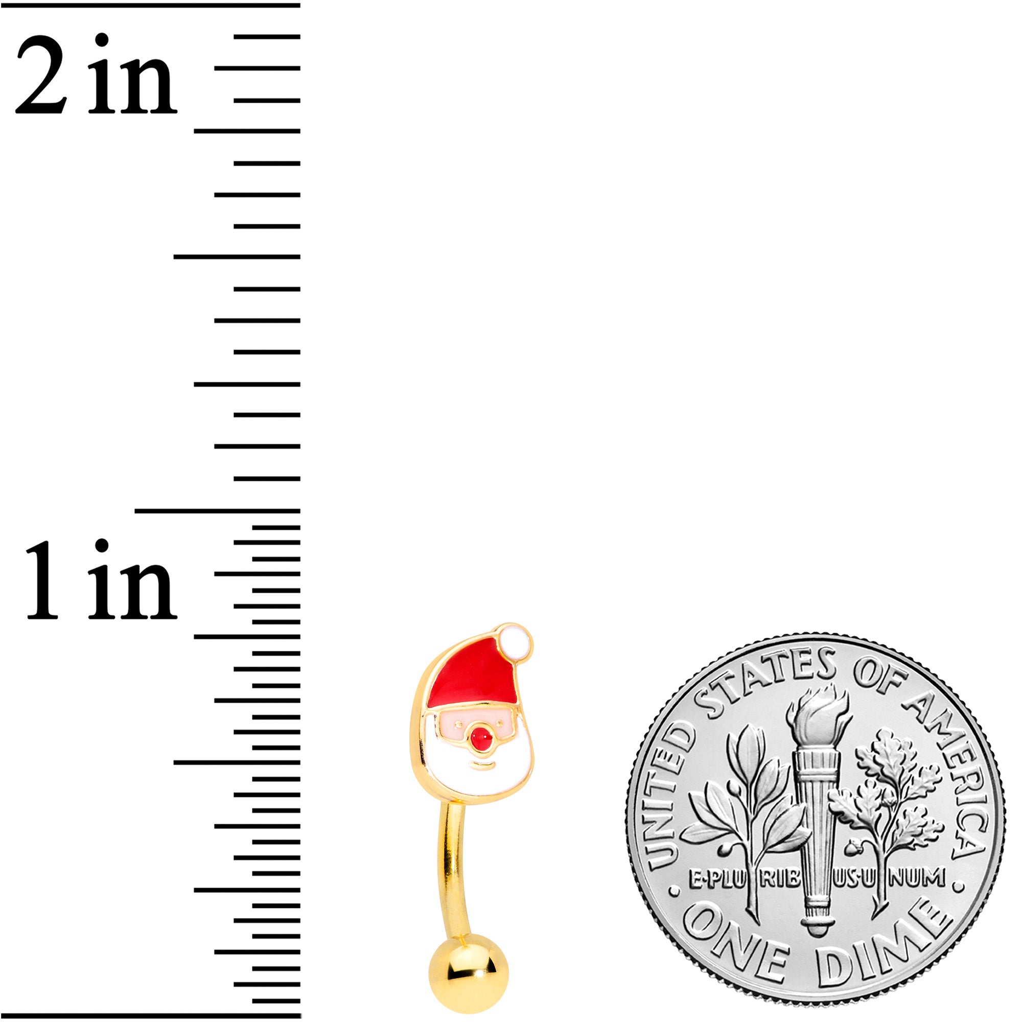 Make Santa the star of your eyebrow piercing with this 16 gauge eyebrow jewelry! It's made with an 8mm gold tone PVD over 316L surgical grade stainless steel curved barbell with a 3mm bottom ball end. The top end features a Santa Claus charm, with a red hat and matching red nose. You can even wear it in multiple piercings including tragus, helix, rook, and daith piercings. Let Santa be a holiday star with this festive cartilage ring!