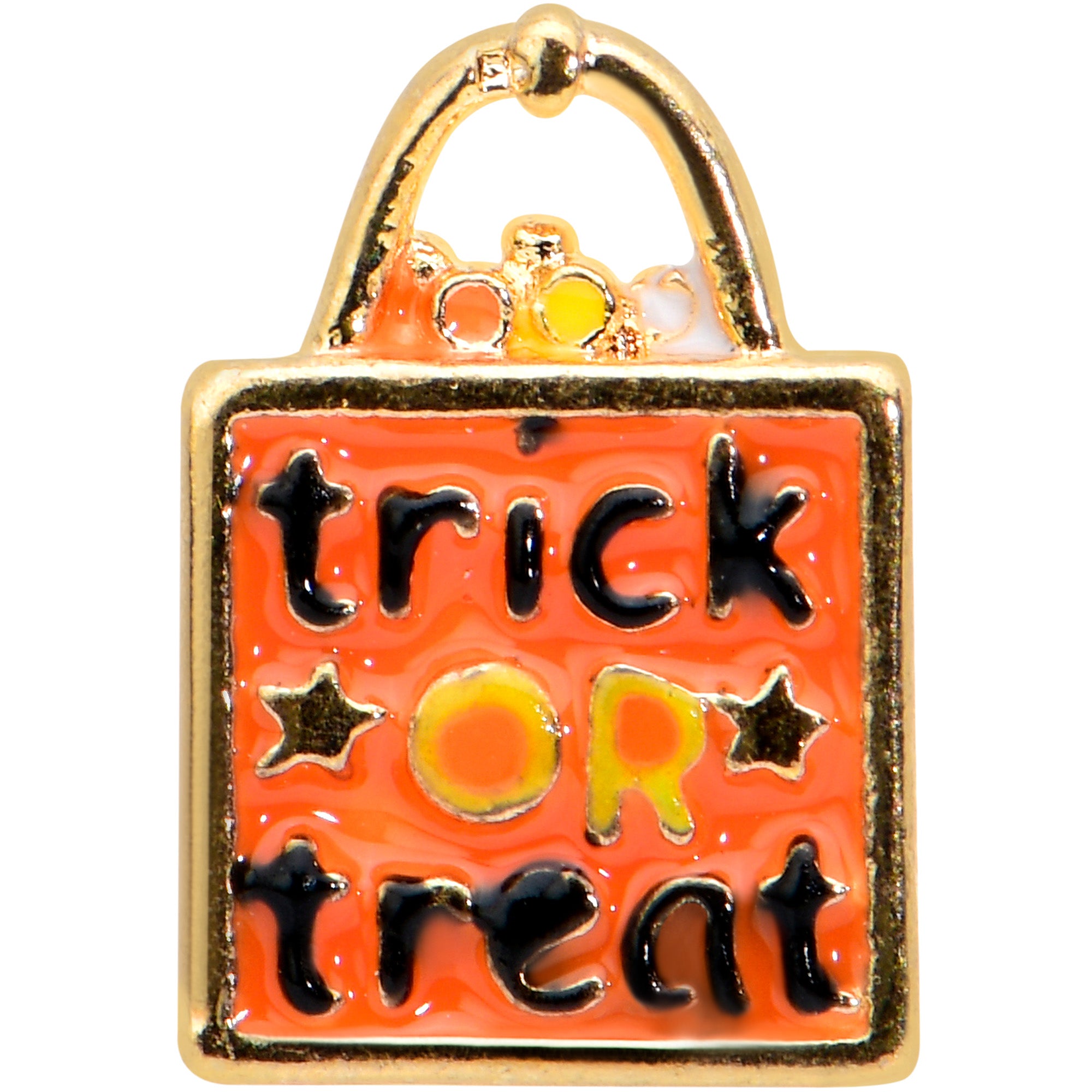 This Halloween, get all the treats when you're rocking this 16 gauge lip ring! It's made with an 8mm gold tone PVD over 316L surgical grade stainless steel straight barbell with a flat disc end. It features a trick or treat bag charm, inlaid in orange. You can even boast this bag in multiple piercings including lip, monroe, tragus, helix, and some conch piercings. Trick or treat with style with this Halloween cartilage jewelry!