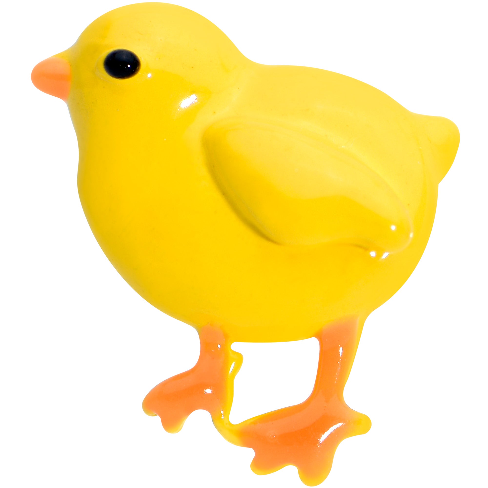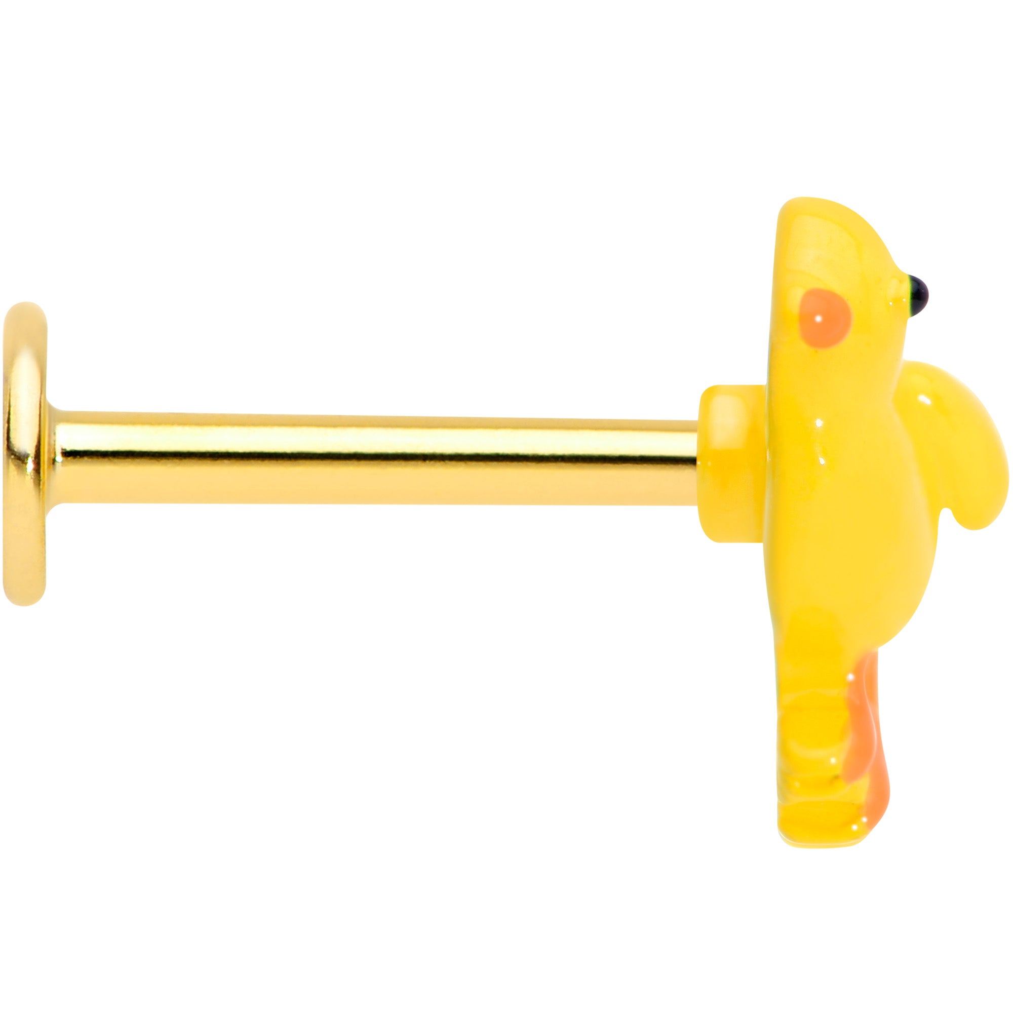 Why be a hot chick when you can be an absolutely adorable chick....like on this 16 gauge lip ring? It's made with an 8mm gold tone PVD over 316L surgical grade stainless steel straight barbell with a flat disc end. It features a yellow Easter chick charm. The chick is embellished with a black eye and realistically orange legs and feet. You can even boast this bird in multiple piercings including lip, monroe, tragus, helix, and some conch piercings. Hatch a sweet new look for Easter with this bewitching baby bird cartilage jewelry!