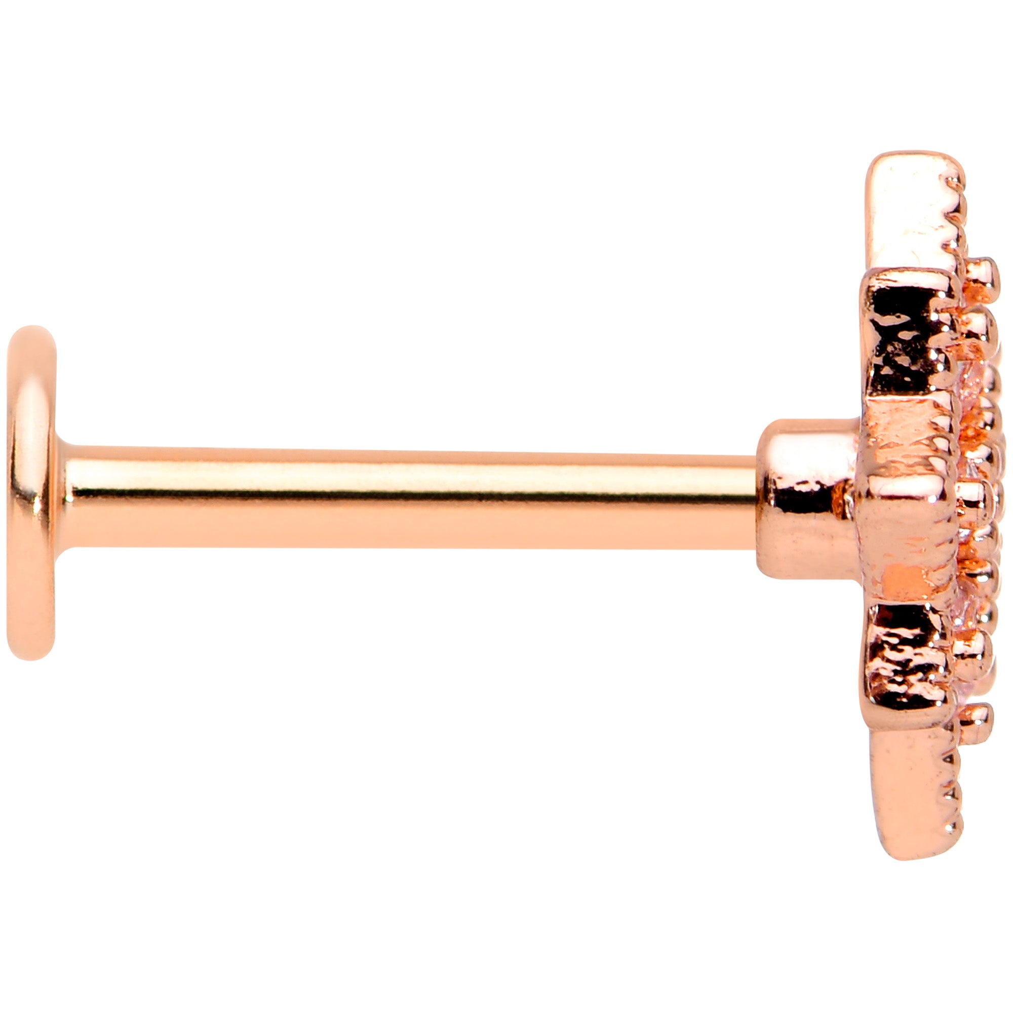 Be a star in the universe like the star on this 16 gauge lip ring! It's made with an 8mm rose gold tone PVD over 316L surgical grade stainless steel straight barbell with a flat disc end. It features an eight-pointed star charm. The star features a clear gems set on each point and is set at the center with a green gem for a gorgeous color contrast. And you can sport this star in multiple piercings including lip, monroe, tragus, helix, and some conch piercings. Let your cartilage piercings be stars with this splendid star cartilage jewelry!