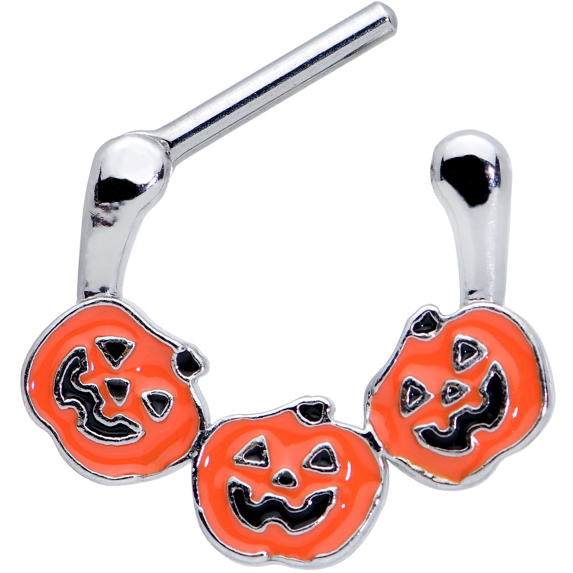 The three pumpkins on this 16 gauge cartilage jewelry are sure to have your piercings ready for Halloween! It's made with an 8mm durable 316L surgical grade stainless steel hinged straight barbell. It features three orange jack o'lanterns, with their spooky expressions inlaid in black to make them extra visible. It also features a hinged clicker design that makes insertion and removal a snap and you can rock it in multiple piercings including helix, tragus, and daith. This Halloween, get a whole spooky pumpkin patch in one with this creepy pumpkin cartilage piercing ring!
