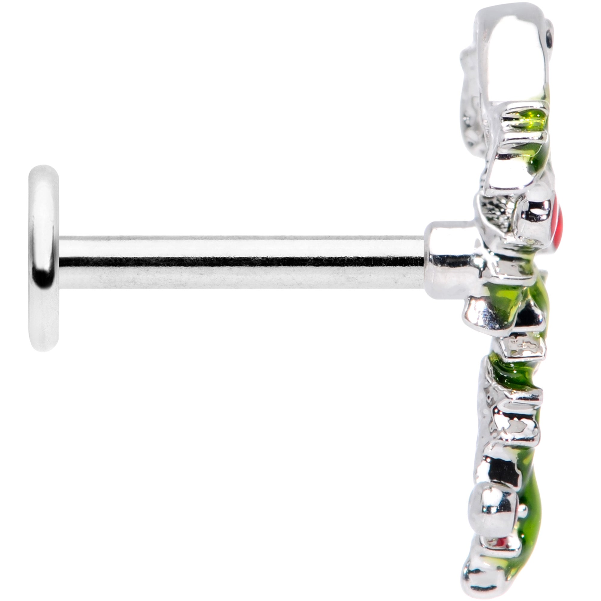 Bedeck your cartilage piercing with Christmas candy on this 16 gauge lip ring! It's made with an 8mm durable 316L surgical grade stainless steel straight barbell with a flat disc end. It features a candy cane charm, wound with a green strand of holly. The holly is embellished with pink cubic zirconia gems for a colorful replacement for holly berries! And you can wear it in multiple piercings including lip, monroe, tragus, helix, and some conch piercings. This candy cane is one that you'll want to keep around all year long!