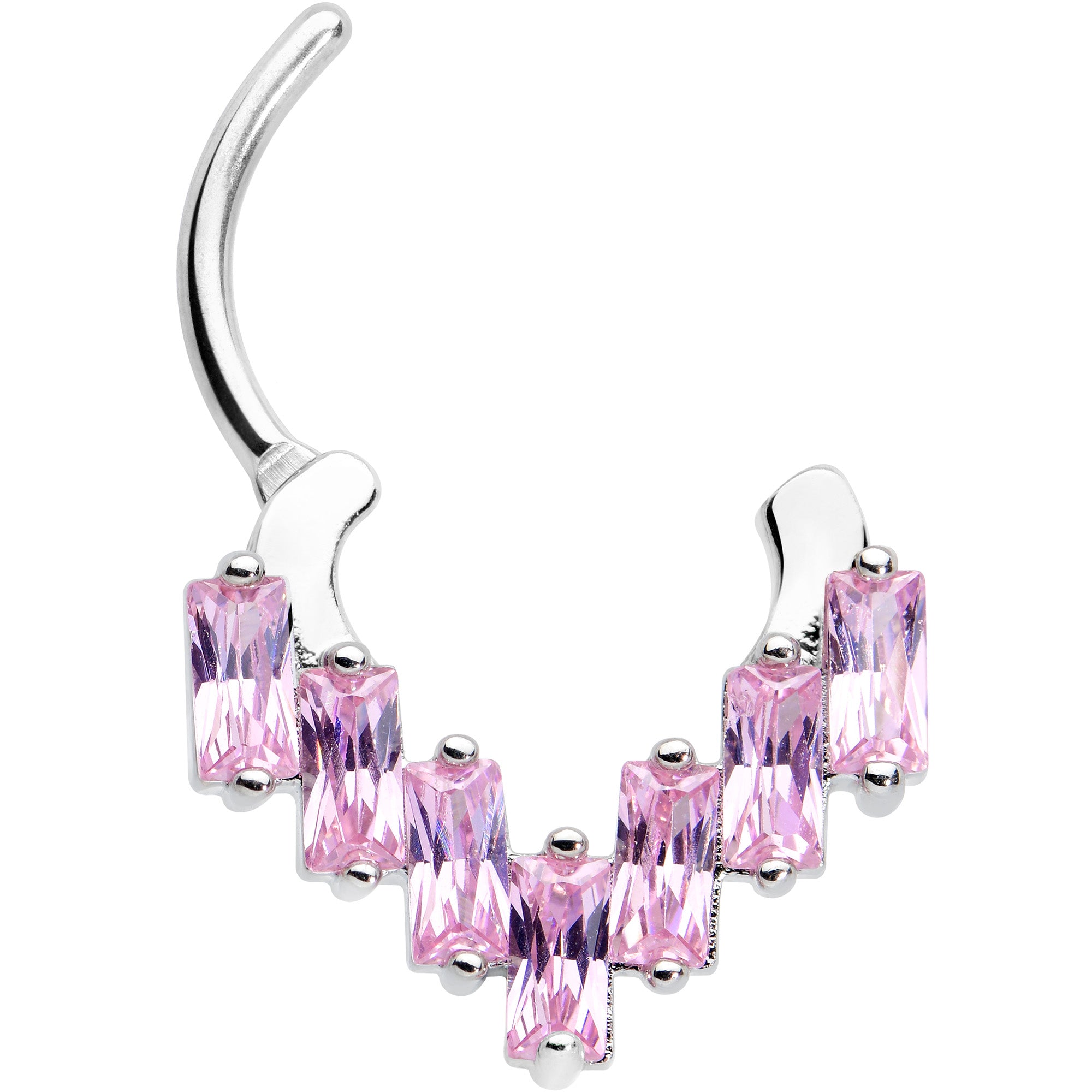 Your cartilage piercings will be dripping with elegance when you're rocking this 16 gauge cartilage jewelry! It's made with an 8mm durable 316L surgical grade stainless steel hinged curved barbell. It features a chevron of vertical pink cubic zirconia gems for a look that's utterly opulent. It also features a clicker design that makes insertion and removal a snap and you can rock it in multiple piercings including tragus, daith, and helix. Take your look sky high with the over the top elegance of this cartilage clicker ring!
