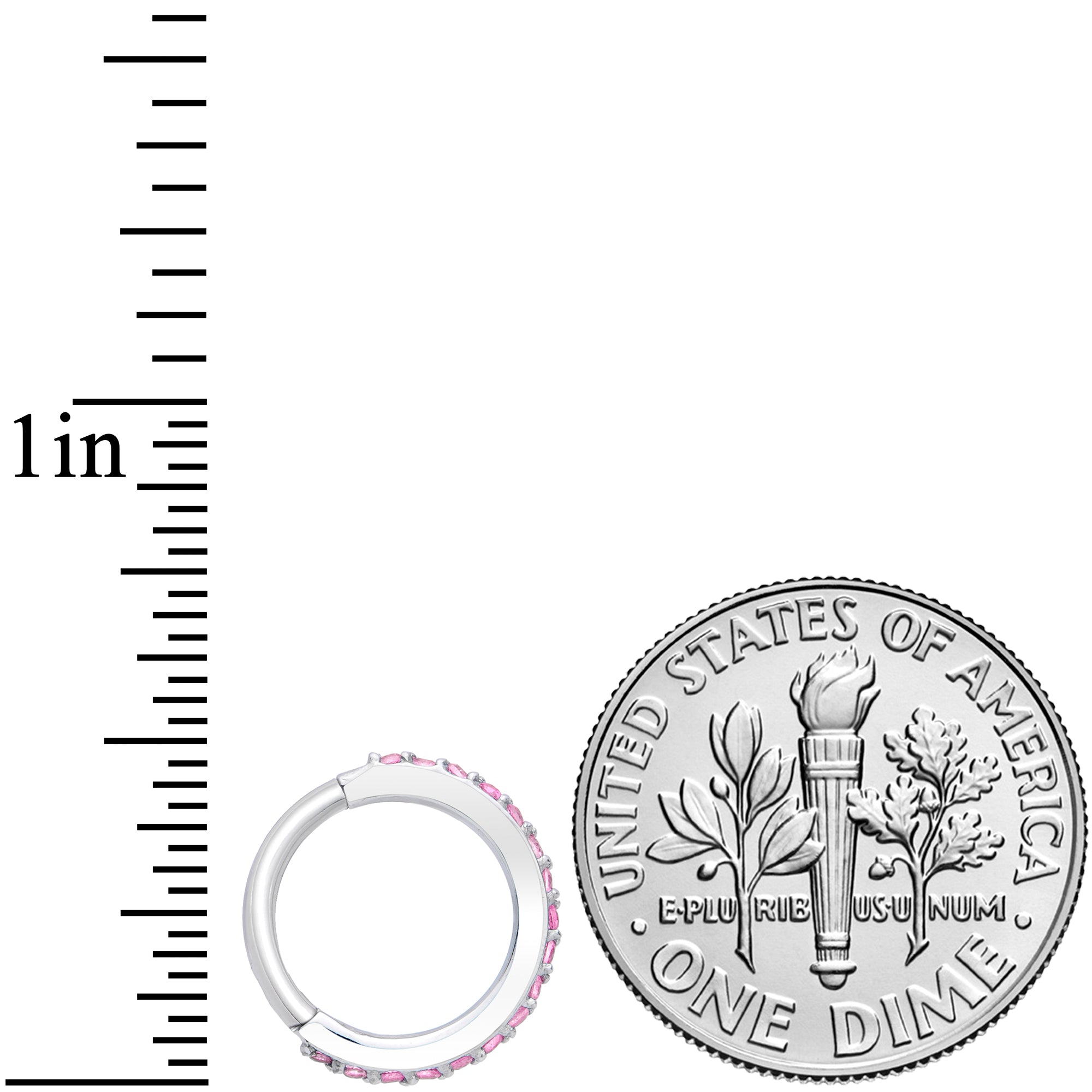 Add a touch of simple glamour to your cartilage piercings with this 16 gauge clicker ring! It's made with an 8mm durable 316L surgical grade stainless steel hinged circular ring. The rim is paved all the way around with tiny pink cubic zirconia gems for a look that is luxurious. It also features a hinged, non-removable segment that makes it easier to insert and remove. This feature is one you'll love because it works so well in multiple cartilage piercings including the helix, daith, tragus, rook, and more. Add some sumptuous style to the cartilage piercing of your choice with this gorgeous glamorous cartilage ring!