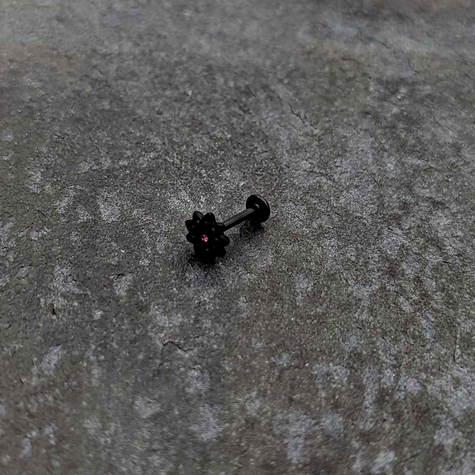 Some flowers blossom in the dark like this 16 gauge lip ring! It's made with an 8mm black PVD over 316L surgical grade stainless steel straight post with a flat disc end. It features a detailed flower charm, with petals in the deepest black. It features texture embellishment and the flower is set at the center with a pink gem for stunning color contrast. You can even rock it in multiple piercings including lip, monroe, tragus, helix, and some conch piercings. Let your piercings bloom at night when you're rocking this striking starry flower cartilage piercing ring.