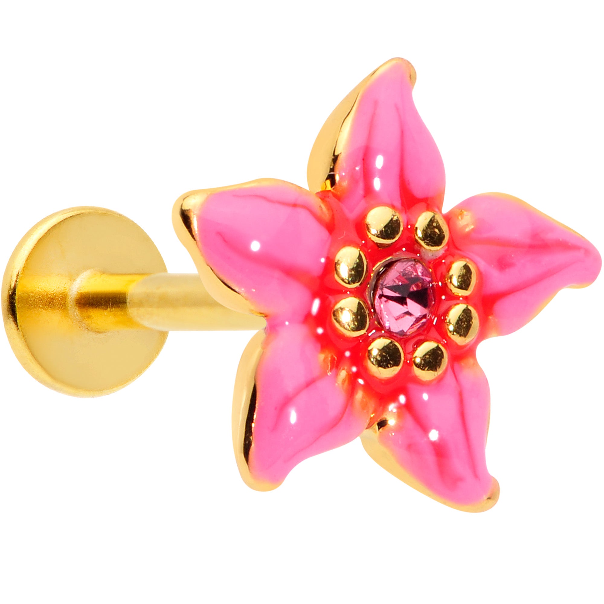 16G 5/16 Pink Gem Gold Tone Exotic Flower Labret Monroe Tragus