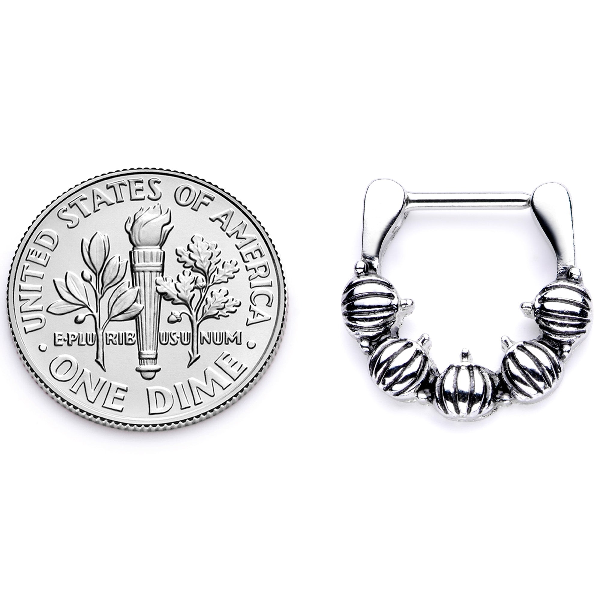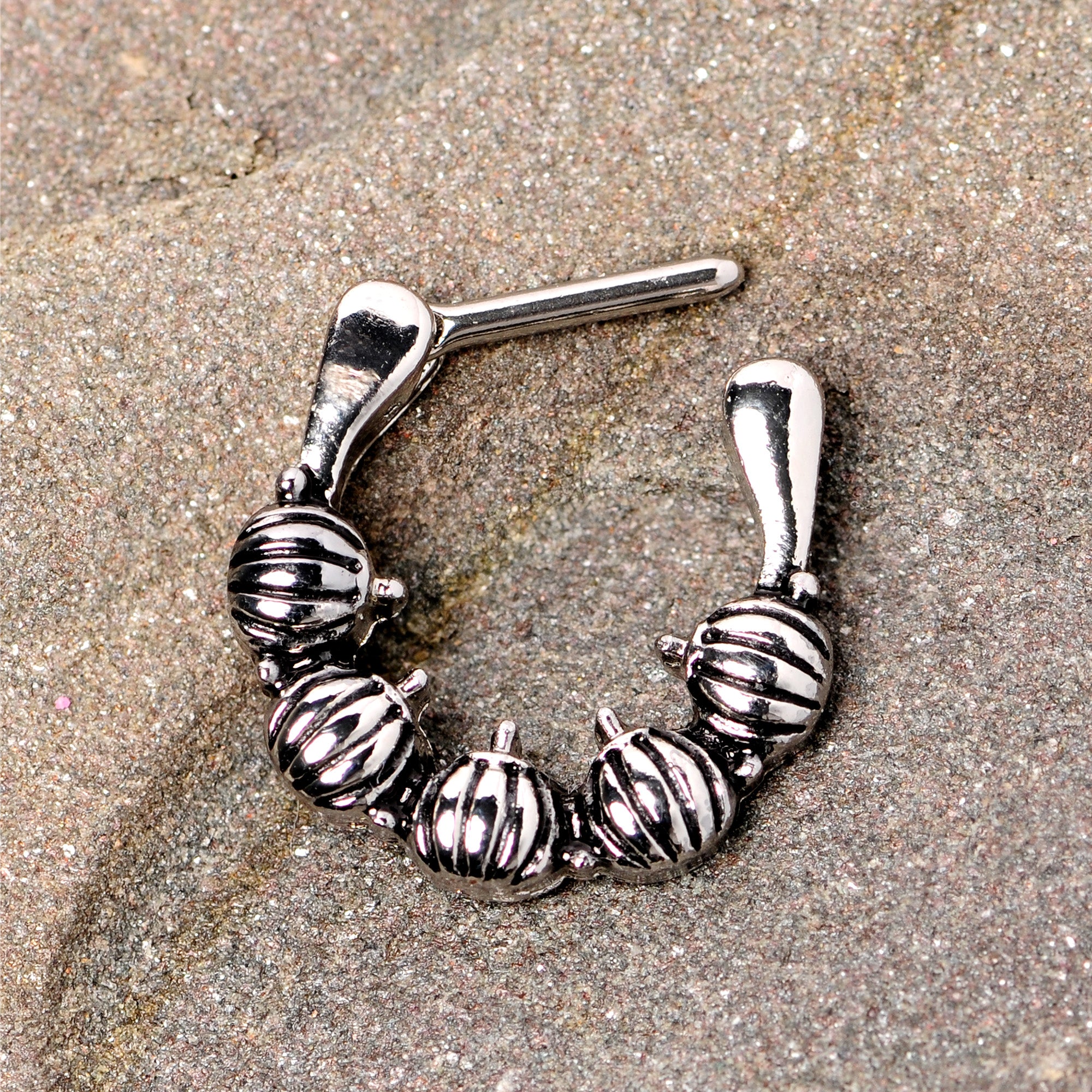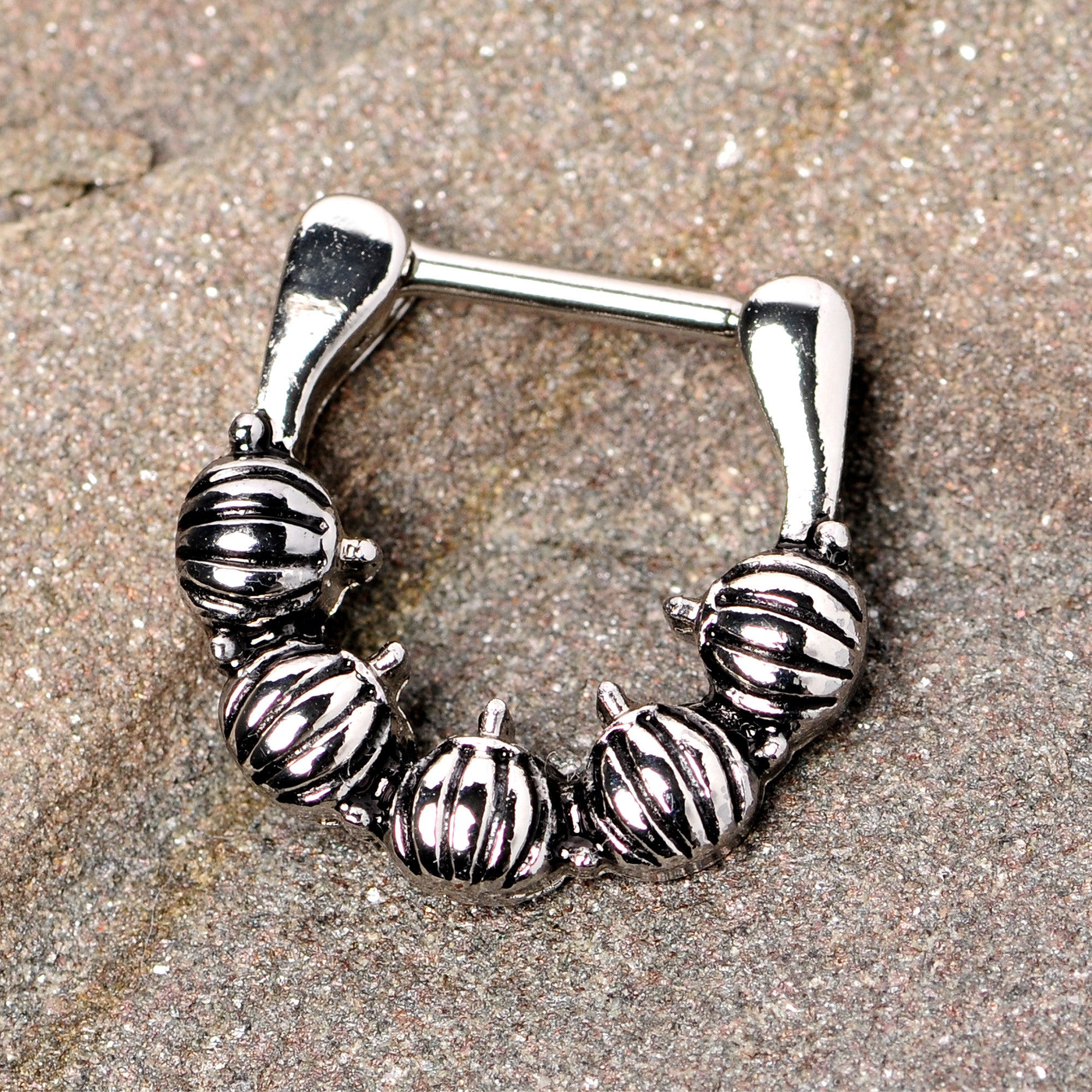 Perfect for autumn, now you can carry a pumpkin patch with you while staying warm and cozy inside! This 16 gauge cartilage earring is made with an 8mm durable 316L surgical grade stainless steel hinged straight barbell and features a simple ring of pumpkins. Even better, this cartilage ring works well in multiple piercings including some septum piercings as well as cartilage piercings like the tragus, helix, and rook piercings. This pumpkin patch is practically perfect!