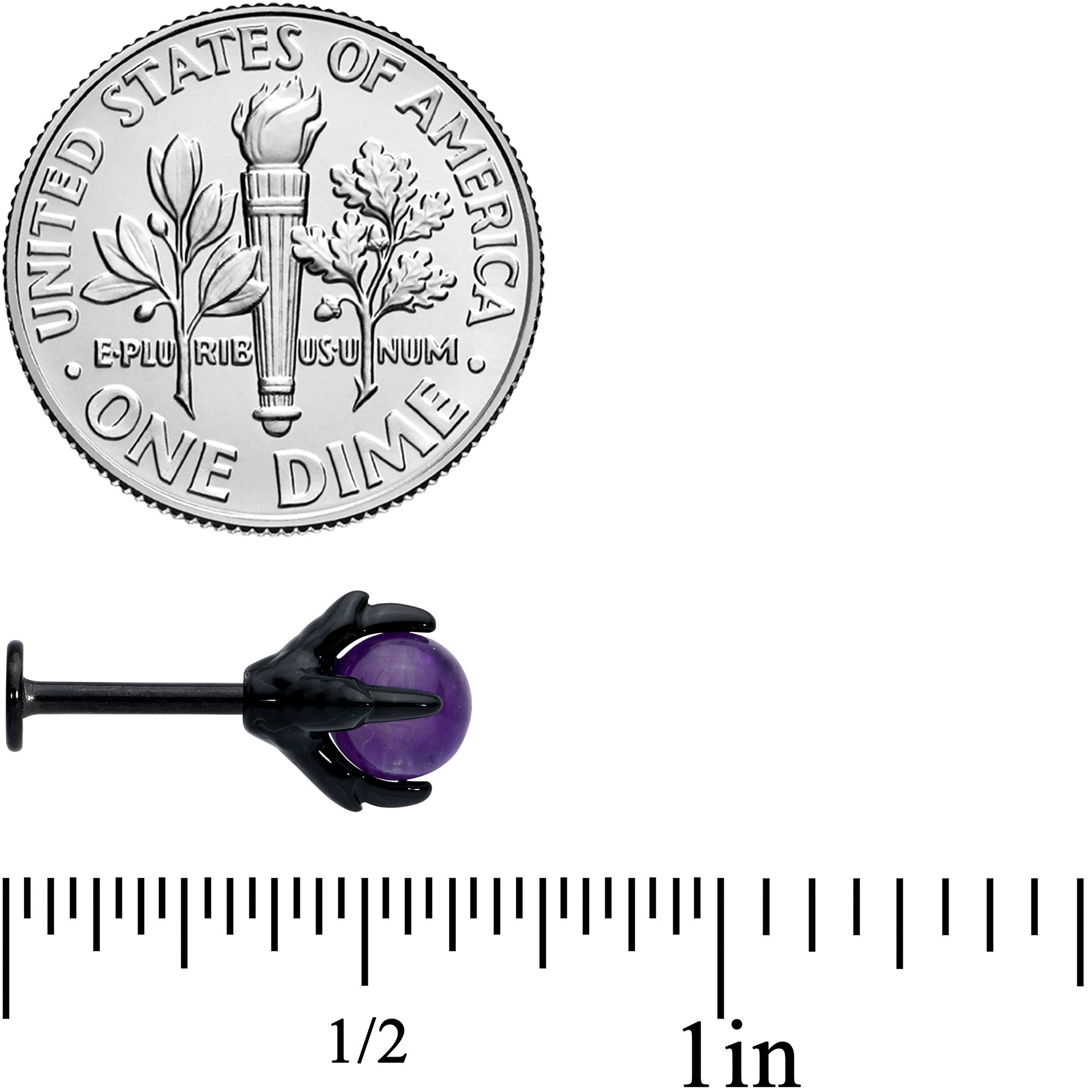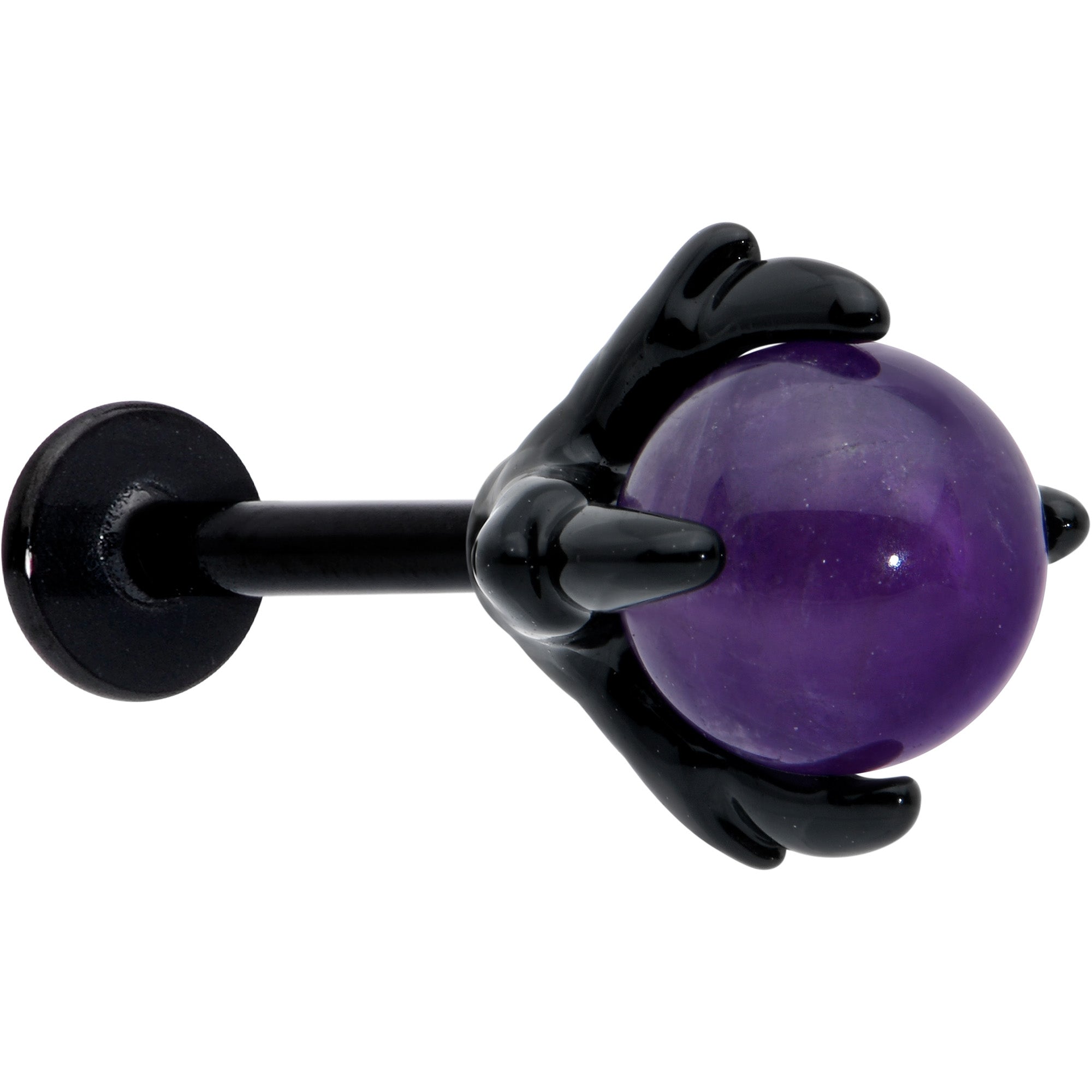 Add some creepy color to your look with this 16 gauge lip ring! It's made with an 8mm black PVD over 316L surgical grade stainless steel straight barbell with a flat disc end. It features a clawed hand clutching an amethyst stone ball. You can even wear this hand in multiple piercings including lip, monroe, tragus, helix, and some conch piercings! You'll be having a ball as well with this creepy cool claw hand in your cartilage piercings!