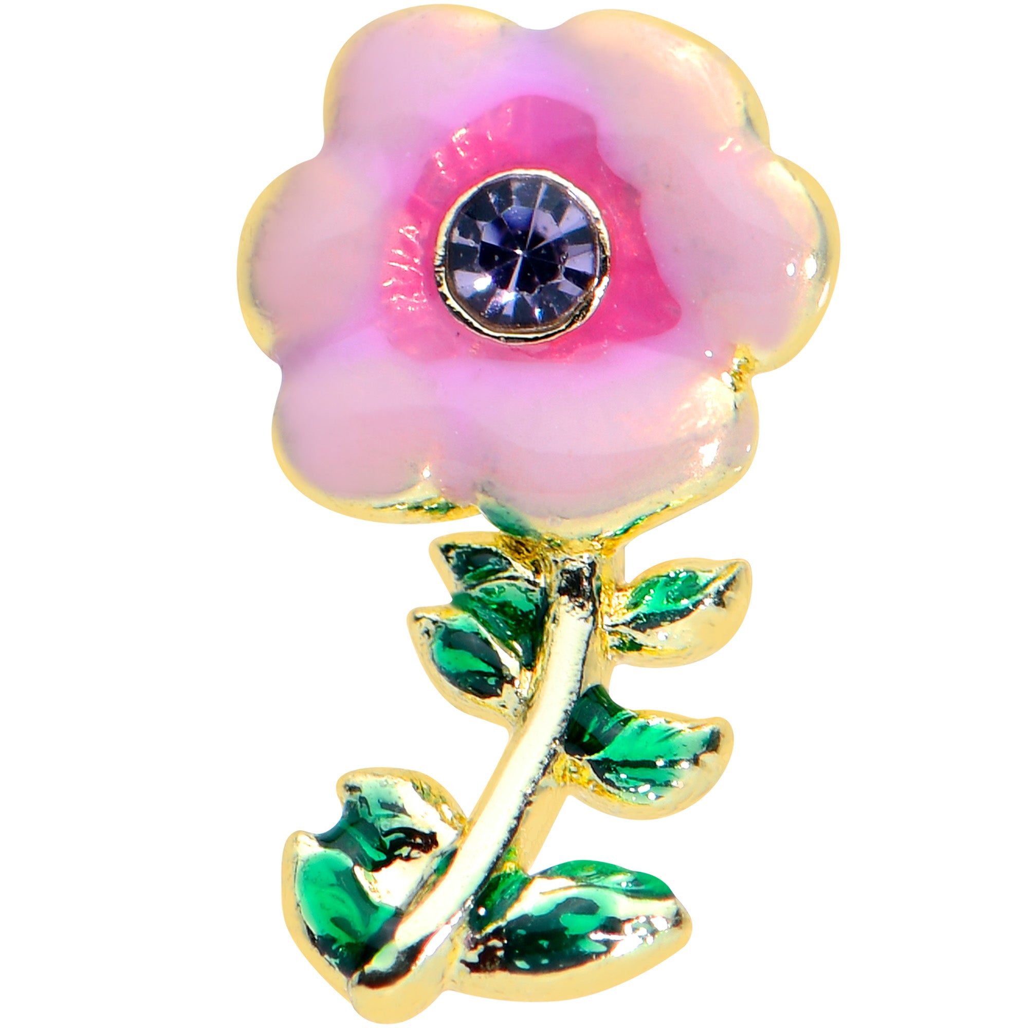 The flower on this 16 gauge lip ring has burst into beautiful bloom! It's made with an 8mm gold tone PVD over 316L surgical grade stainless steel straight straight barbell with a flat disc end. It features a large pink flower charm with a purple cubic zirconia gem set at its center. Beneath it is a spray of leaves, inlaid in green for a cohesive and realistic look. You can even flaunt this flower in multiple piercings including lip, monroe, tragus, helix, and some conch piercings. Give your cartilage piercings a touch of floral fantasy with this blooming beautiful cartilage jewelry.