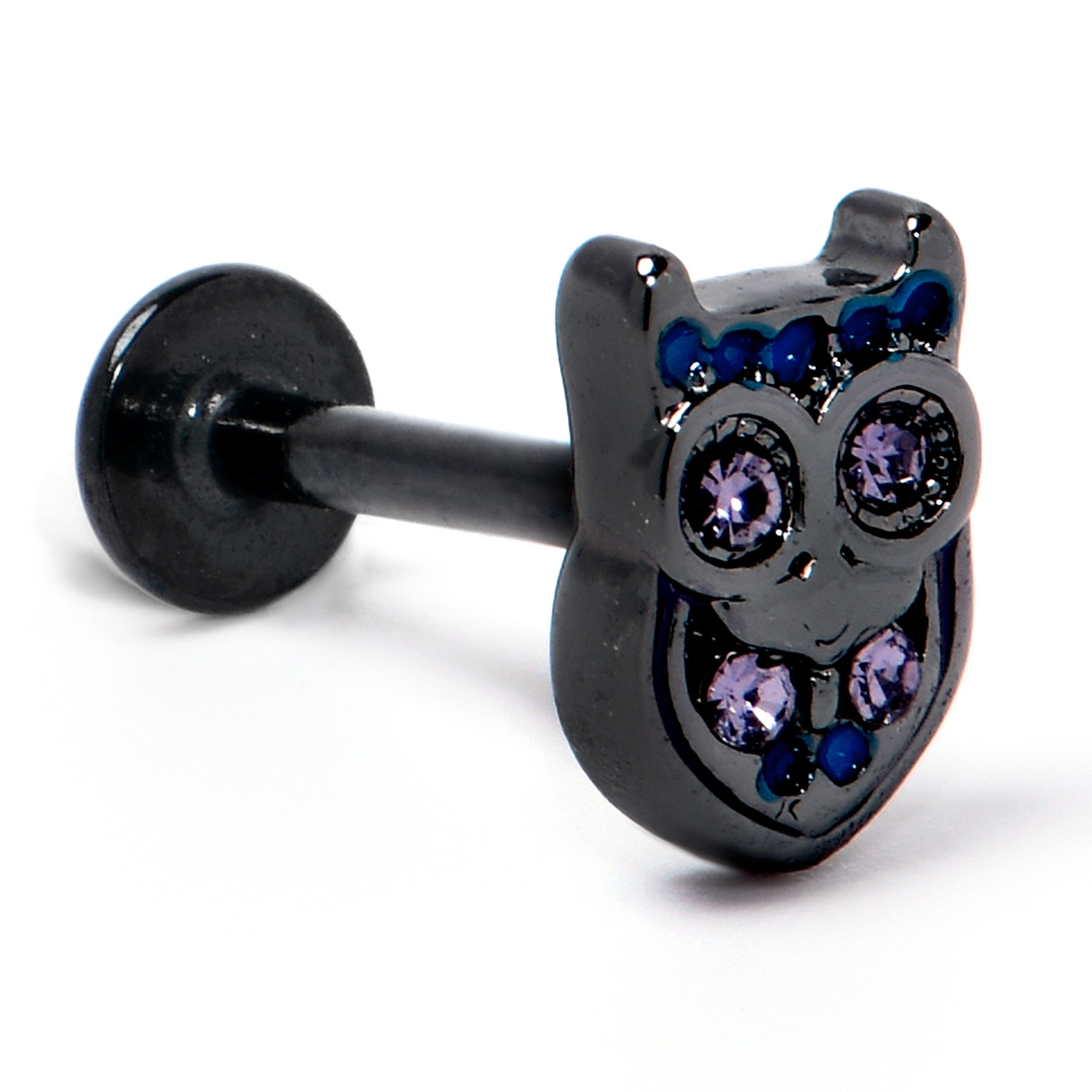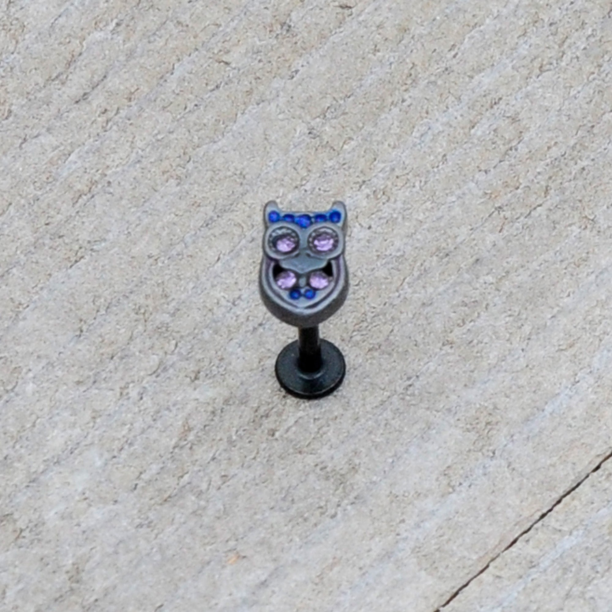 This 16 gauge lip ring is sure to make you want to hoot. It is made with an 8mm black PVD over 316L surgical grade stainless steel straight post with a flat disc end. It features an owl charm with purple gem eyes and blue inlay and purple gem embellishments. You can even rock it in multiple piercings including lip, monroe, tragus, helix, and some conch piercings. If you are all about owls, this avian cartilage piercing ring is sure to make your heart take flight.