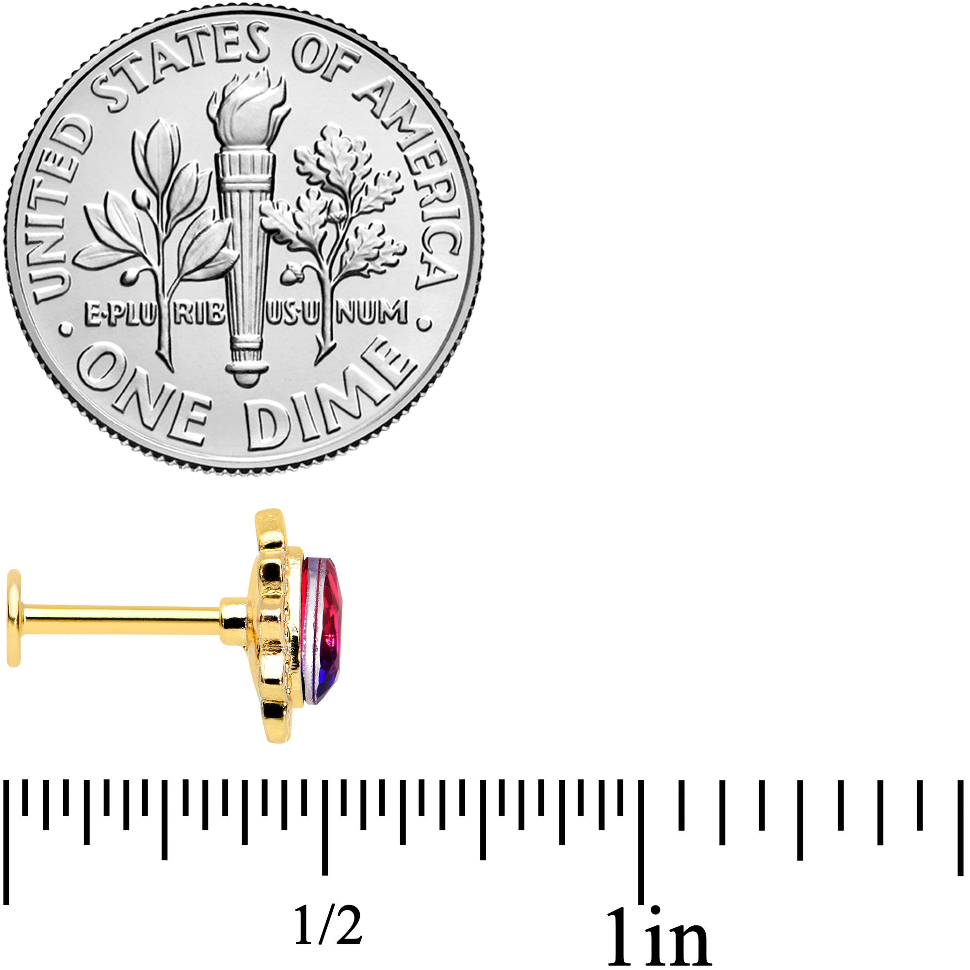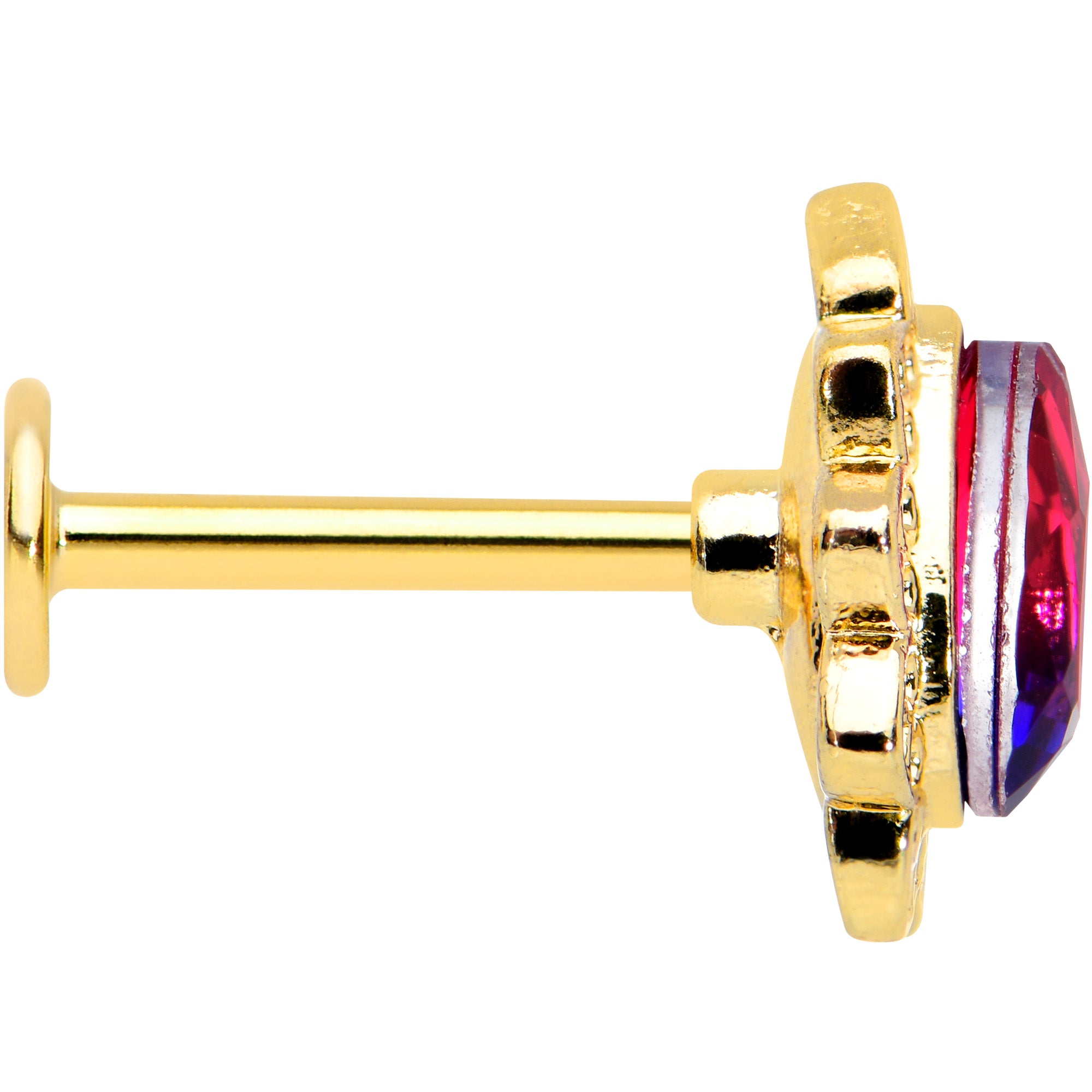 You'll be shedding no tears when you check out this 16 gauge lip ring! It's made with an 8mm gold tone PVD over 316L surgical grade stainless steel straight barbell with a flat disc end. It features a purple tourmaline drop charm, with filigree detailing around the edges. You can even rock it in multiple piercings including lip, monroe, tragus, helix, and some conch piercings! You don't have to cry for new cartilage piercing jewelry when you have this elegant tragus ring!