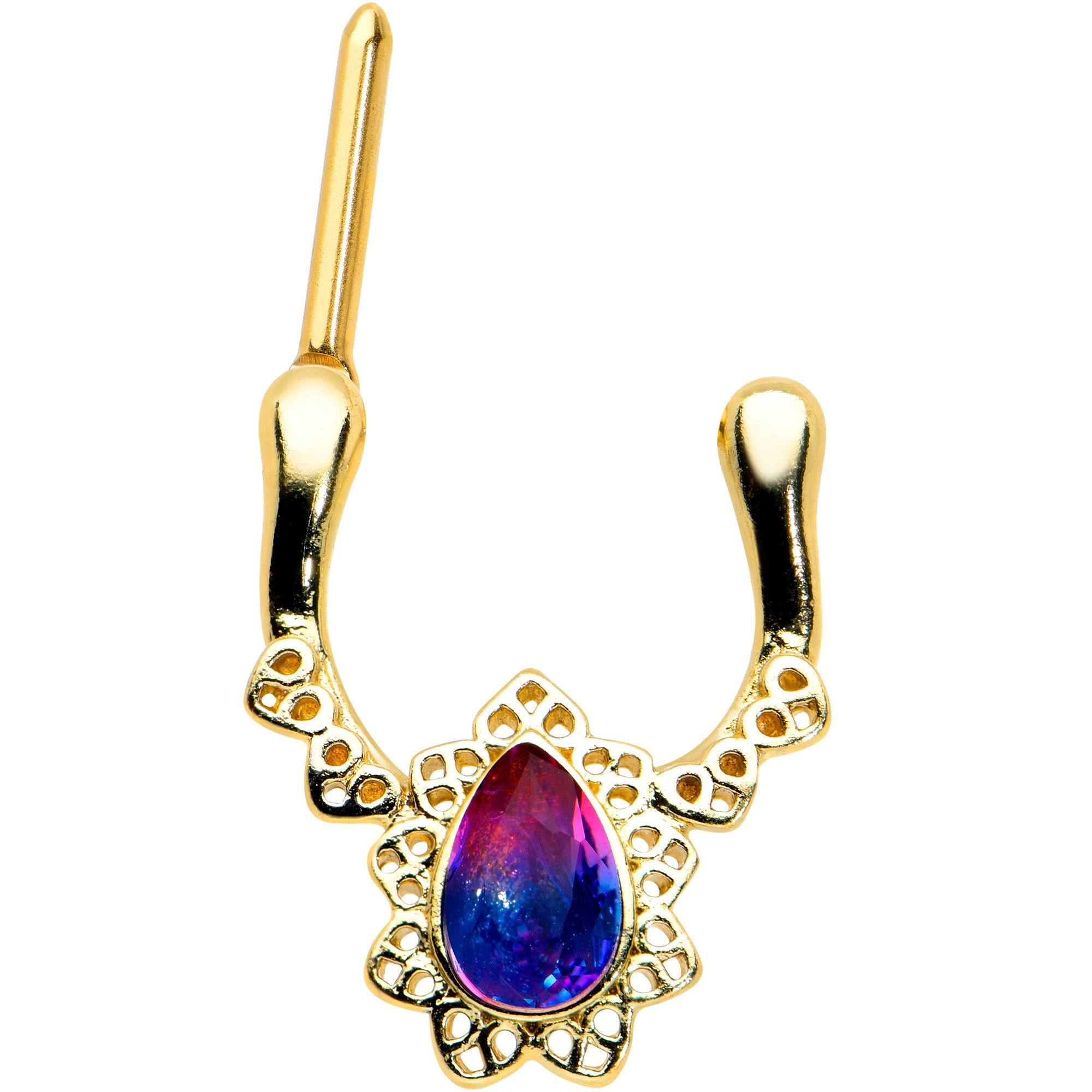 You'll be shedding no tears when you check out this 16 gauge cartilage jewelry! It's made with an 8mm gold tone PVD over 316L surgical grade stainless steel hinged straight barbell. The bottom curve features a drop shaped purple tourmaline charm, with lace-inspired detailing around the edges. The hinged clicker design makes insertion and removal a snap and you can even rock it in multiple piercings including tragus, helix, and some conch piercings. You don't have to cry for new cartilage piercing jewelry when you have this elegant cartilage clicker ring!