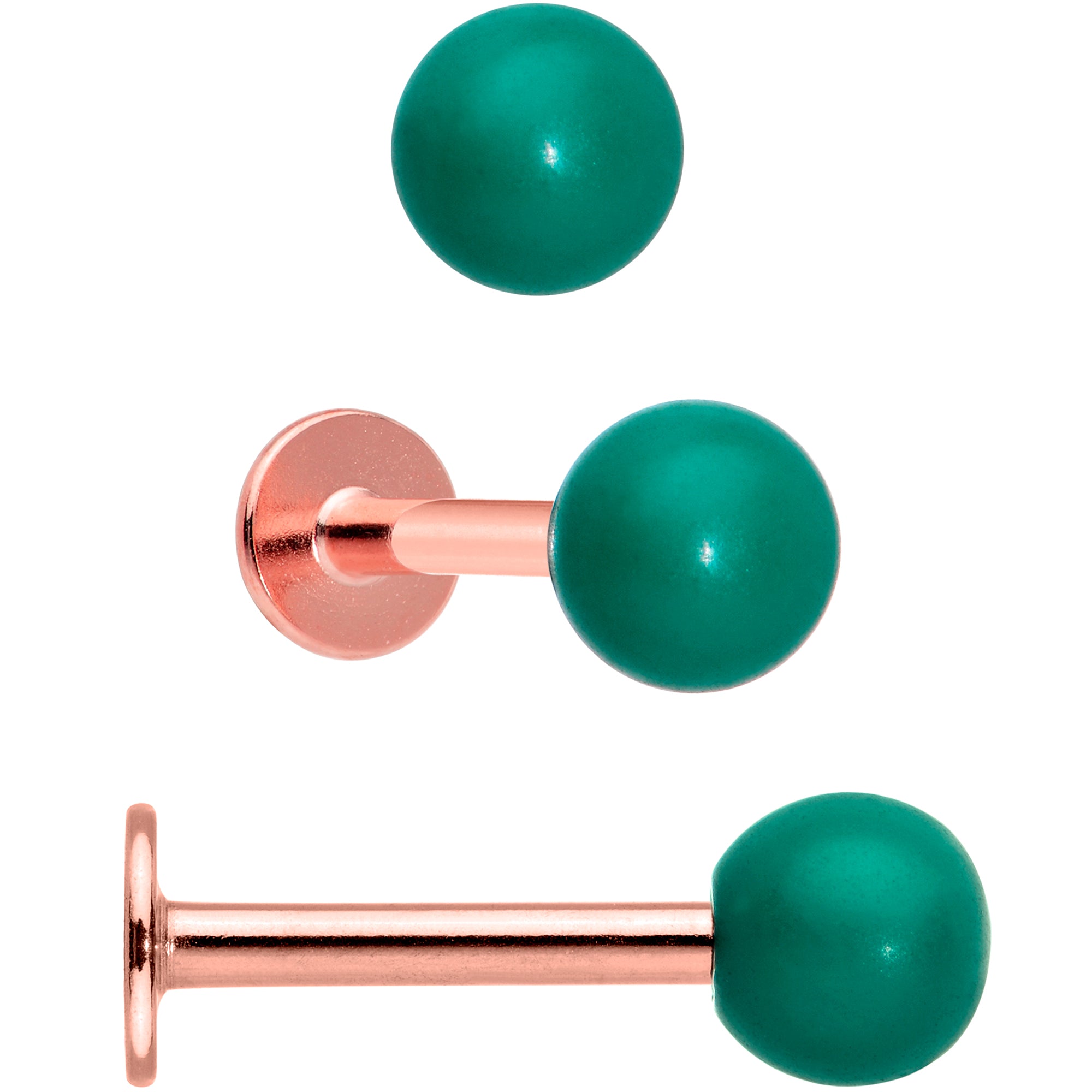 You'll have all the days of Christmas covered with this set of 16 gauge lip rings! They are made with 8mm rose gold tone PVD over 316L surgical grade stainless steel straight barbells with flat disc ends. One features a Christmas tree charm, embellished with red gem ornaments and a green star topper. The second features a snowman charm, wearing a jaunty red hat and a happy smile. The third features a ball ends in festive holiday green. You can even rock these rings in multiple piercings including lip, monroe, tragus, helix, and some conch piercings. You'll be all dressed for the season and ready to go with this festive set of cartilage rings! Sold as a set of three.