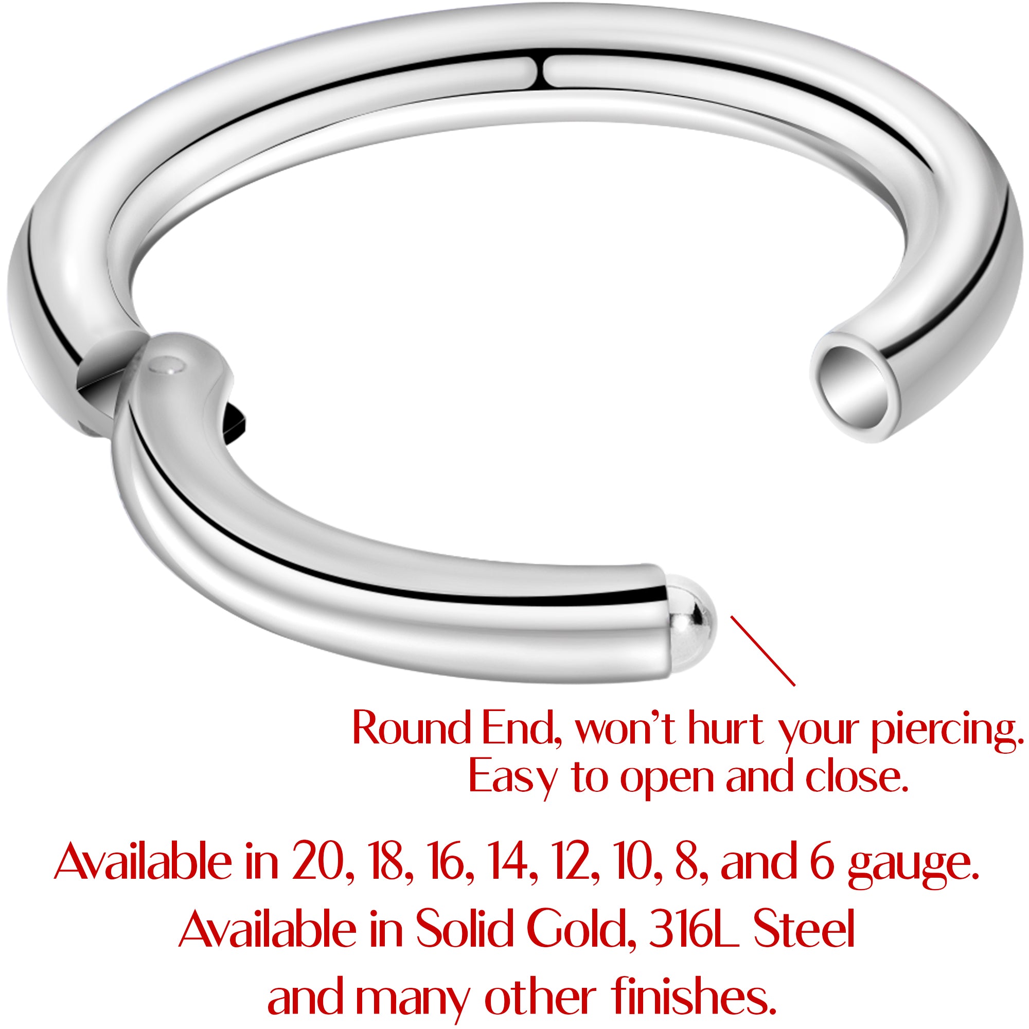 Hypoallergenic jewelry for sensitive skinIf you are in need of a simple, yet classically fashionable addition to your style, this 16 gauge circular ring is just the solution. Designed for a seamless fit, this hinged segment ring is the perfect versatile piece of body jewelry since it can fit in many different piercing locations, namely the lip, nose, and ears. The 5/16" diameter circular barbell of this segment ring is made from strong and durable 316L surgical grade stainless steel.