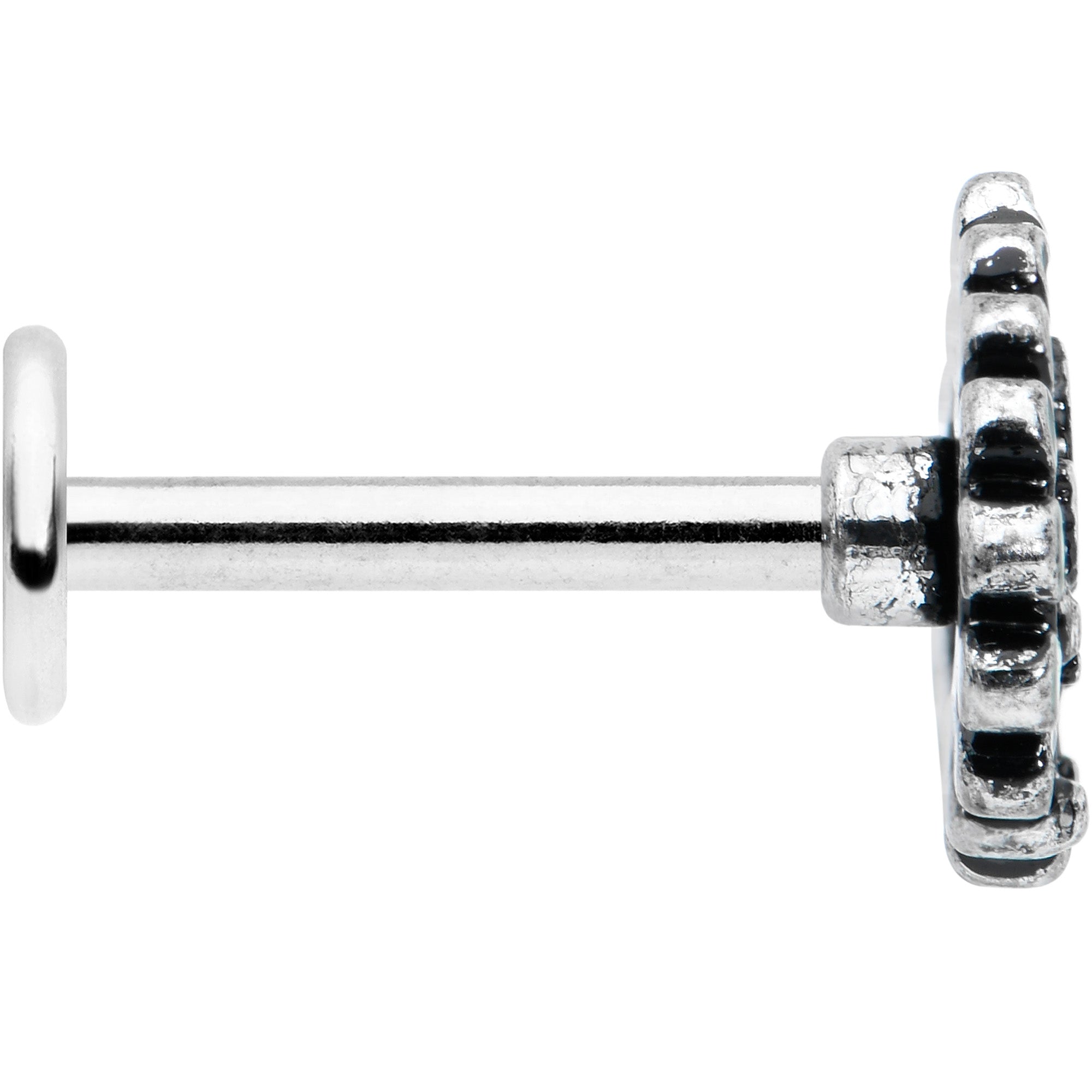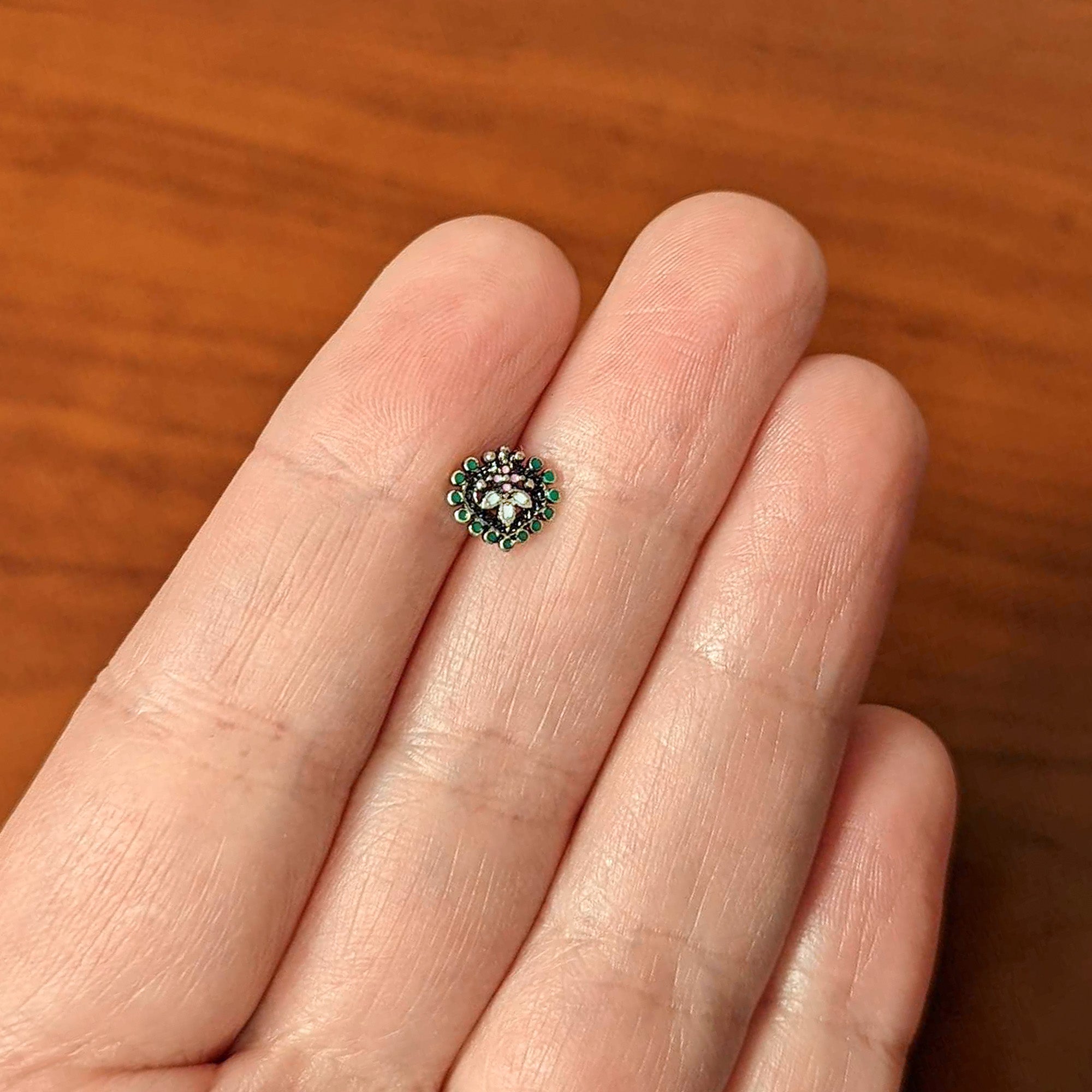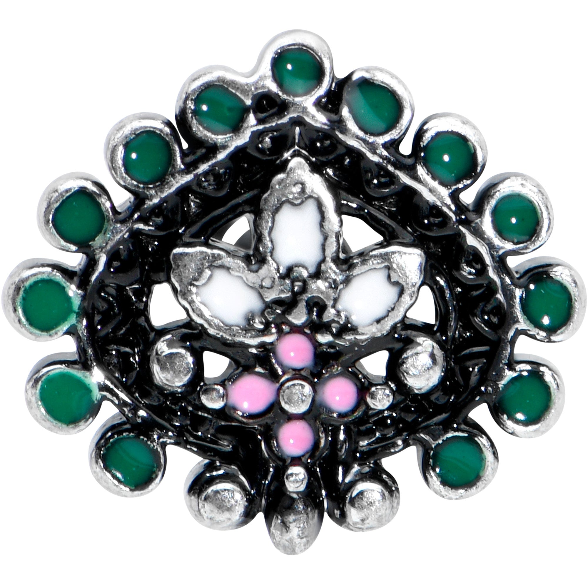 Stylize your look with this 16 gauge lip ring! It's made with an 8mm durable 316L surgical grade stainless steel straight barbell with a flat disc end. It features a leaf charm composed of colorful ovals. The central ovals are set with white and pink inlay and the whole charm is surrounded by green embellishment. It's further embellished with textured detailing, burnished to make all the details pop and you can rock it in multiple piercings including lip, monroe, tragus, helix, and some conch piercings. Add some abstract style to your look with this elegant, opulent cartilage piercing ring.