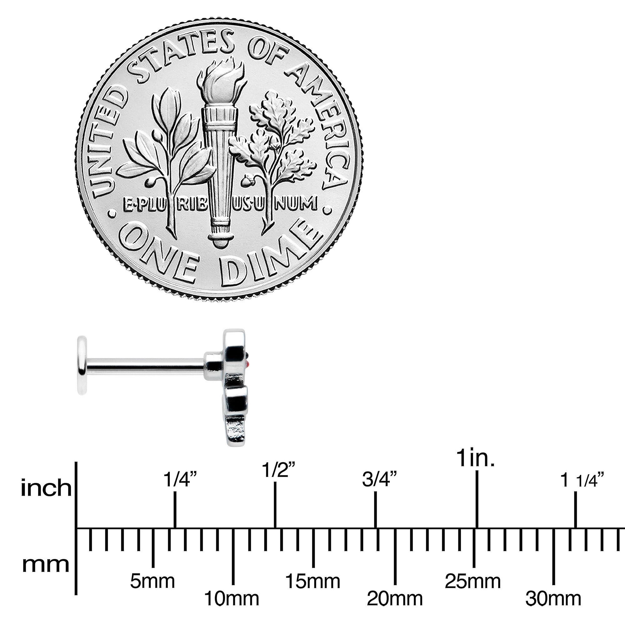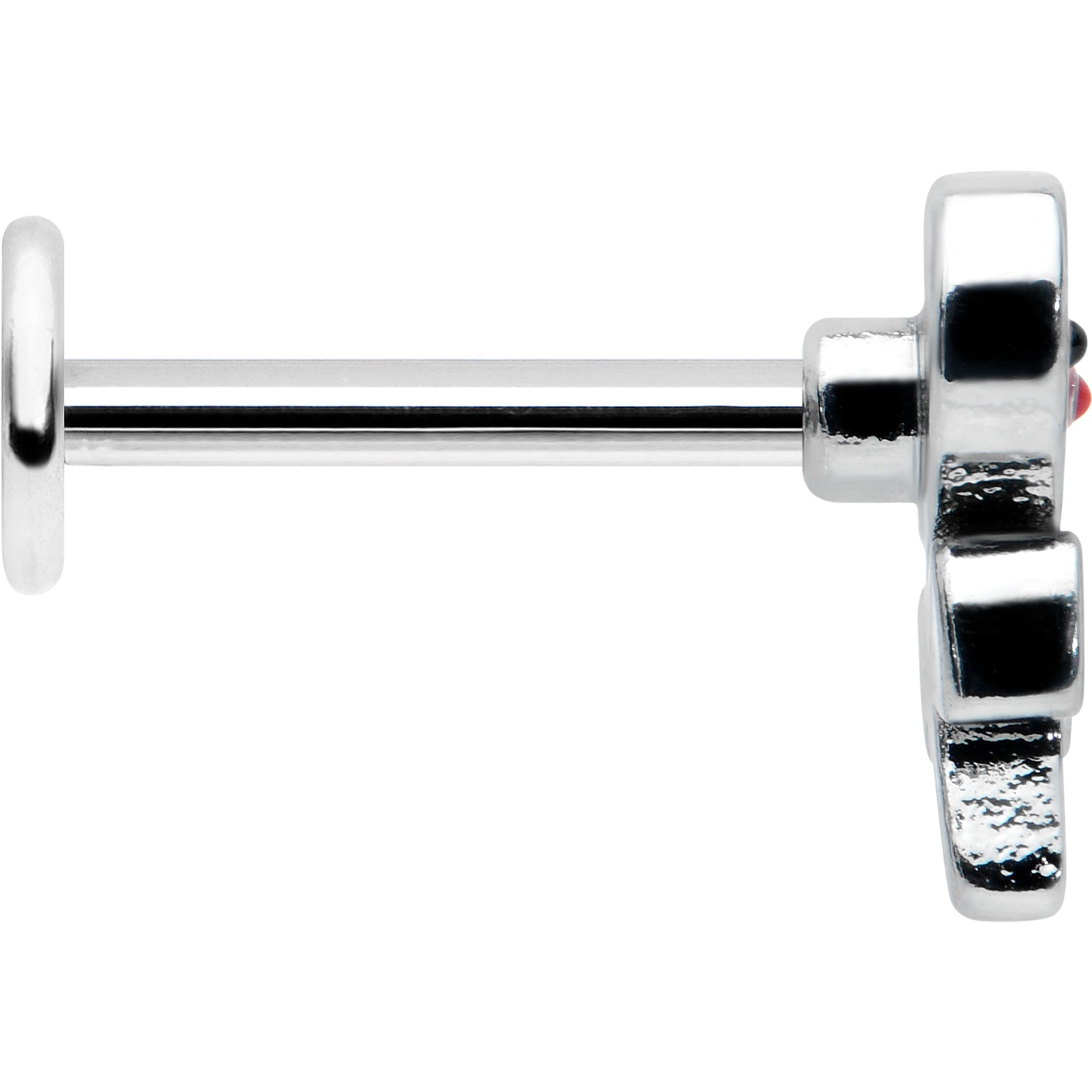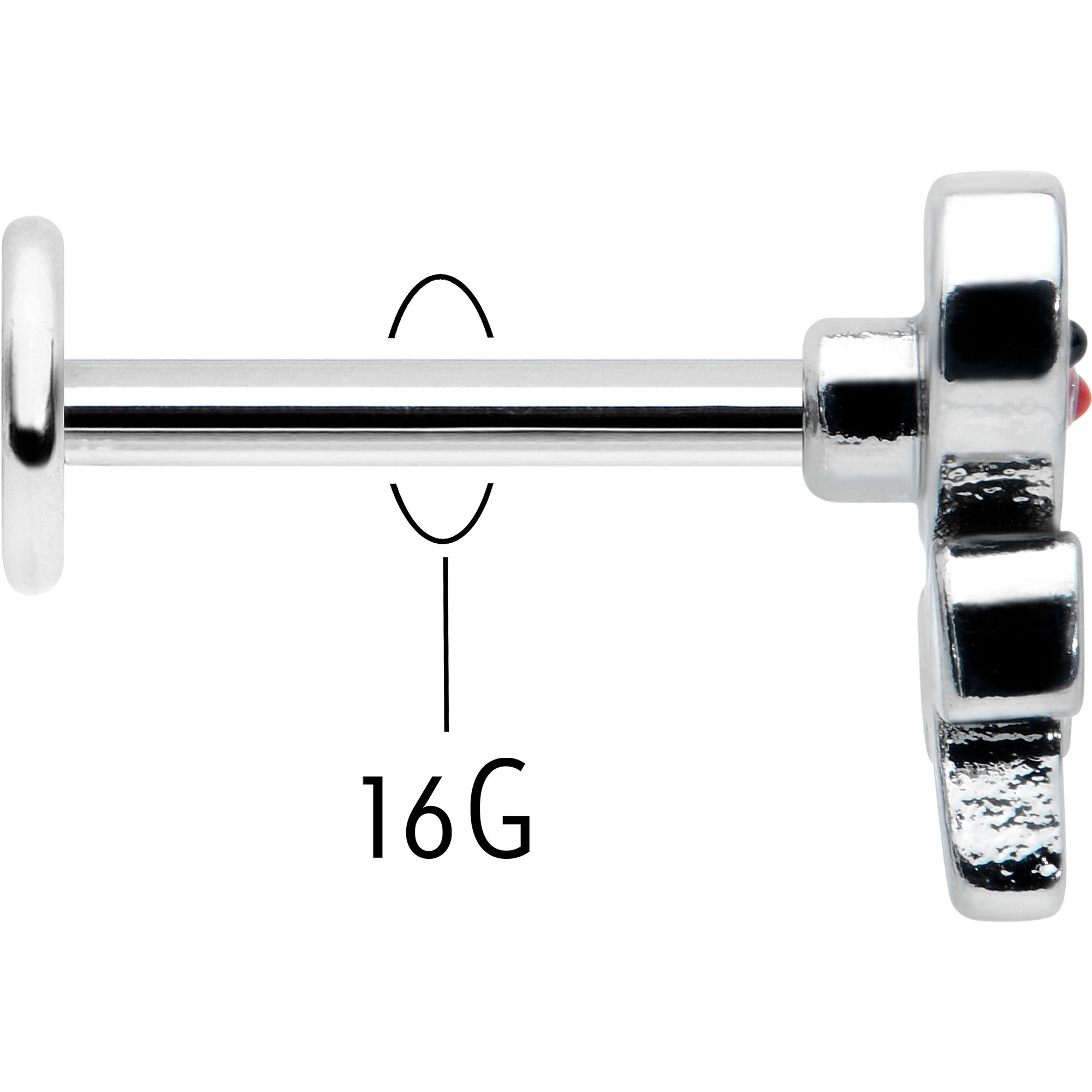 What could be sweeter than the loving lolly on this 16 gauge lip ring? It's made with an 8mm durable 316L surgical grade stainless steel straight post with a flat disc end. It features a lollipop charm, with the candy portion composed of a heart and wearing a cheery face. It's further embellished with a green bow at the top of the white-inlaid stick. You can even rock it in multiple piercings including lip, monroe, tragus, helix, and some conch piercings. You can't help but fall in love with with this sweet, candy-themed cartilage piercing ring!