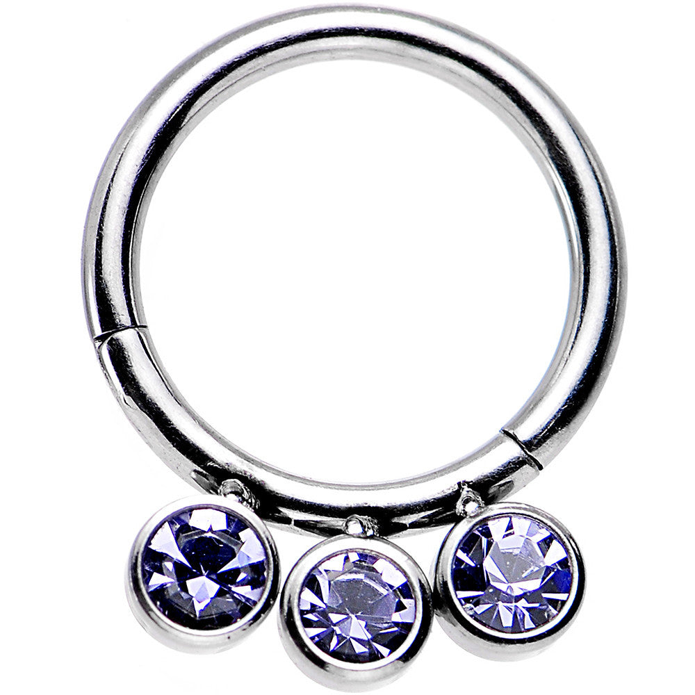 When you've become bored and tired of your drab segment ring, grab up one of these 16 gauge hinged segment rings to revolutionize your style. The 5/16" circular barbell made of 316L surgical grade stainless steel supports the three tanzanite colored gems attached to the hinge that snaps open and closed easily for hassle free insertion and removal.