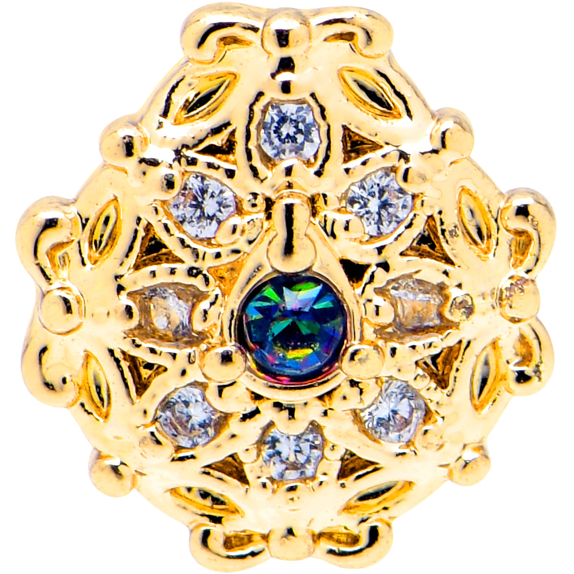 The elegant floral design on this 16 gauge tragus stud is absolutely eye-catching. It is made with a 6mm gold tone PVD over 316L surgical grade stainless steel straight barbell with a 4mm ball end. It features a flower charm with a vitrail gem center. It's further embellished with aurora gems along the edges to form a floral design. You can even rock it in multiple piercings including tragus, helix, and some conch piercings. You're sure to feel gorgeous when you're rocking this elegant, floral cartilage piercing jewelry.