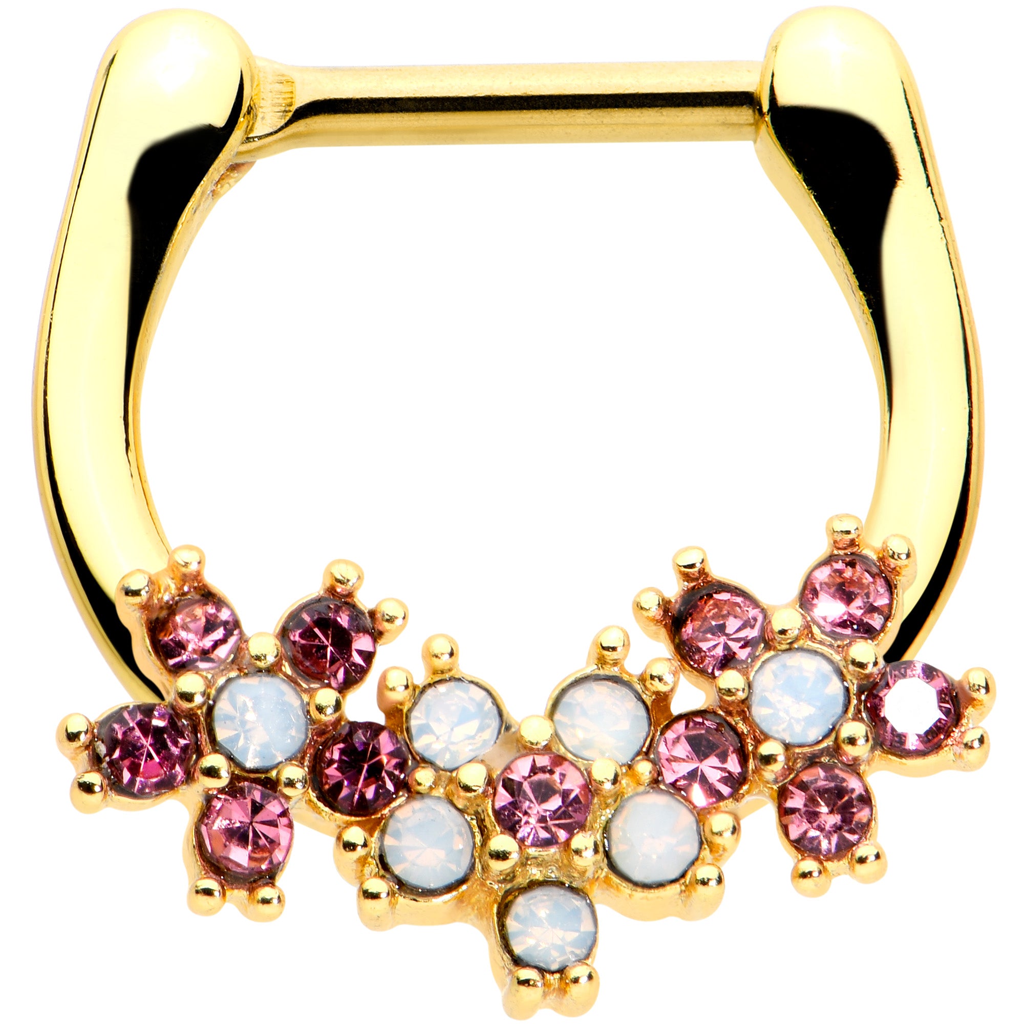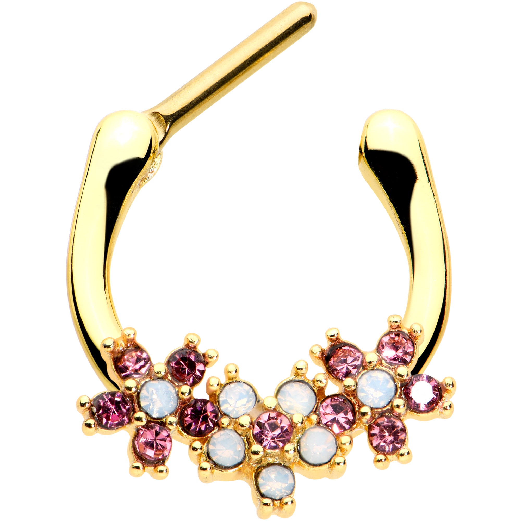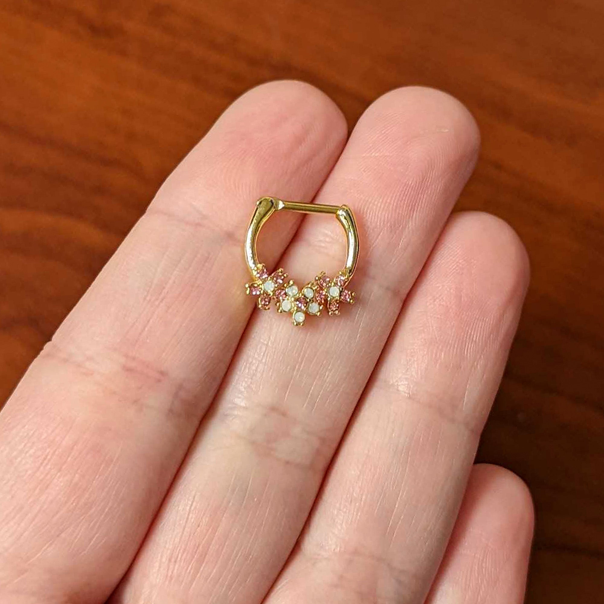 Let your cartilage piercings bloom like the lovely flowers on this 16 gauge cartilage ring! It's made with an 8mm gold tone PVD over 316L surgical grade stainless steel hinged straight barbell. It features a trio of blooming flowers charm, with the petals on the center flower composed of white faux opals and the center a pink gem. The flowers on the ends are the reverse, with white faux opal centers and pink gem petals. It also features a hinged clicker design that makes insertion and removal a snap and you can even rock it in multiple piercings including tragus, helix, and some conch piercings. You'll be feeling fabulously floral in this fetching flower cartilage jewelry!