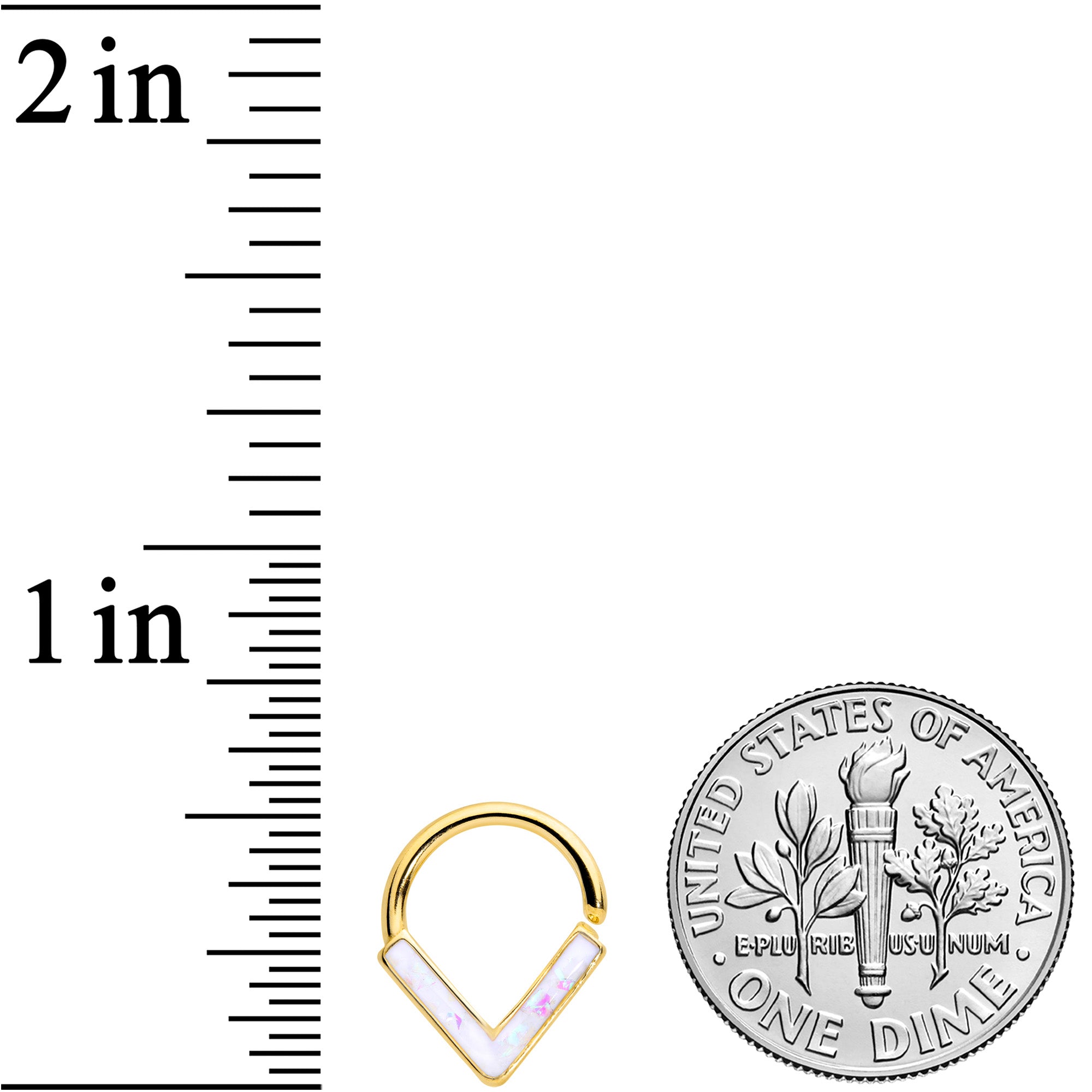 The vee on this 16 gauge cartilage jewelry will have you saying va-va-voom! It's made with an 8mm gold tone PVD over 316L surgical grade stainless steel circular ring. It features a chevron shape on the bottom curve, inlaid with white faux opal for a look that's both eye-catching and on trend. It's easy to insert and remove - simply twist the ring open, insert, and then twist gently shut again. You'll love this feature because this works so well in multiple cartilage piercings like the daith, helix, and tragus. This cartilage piercing ring has it all!