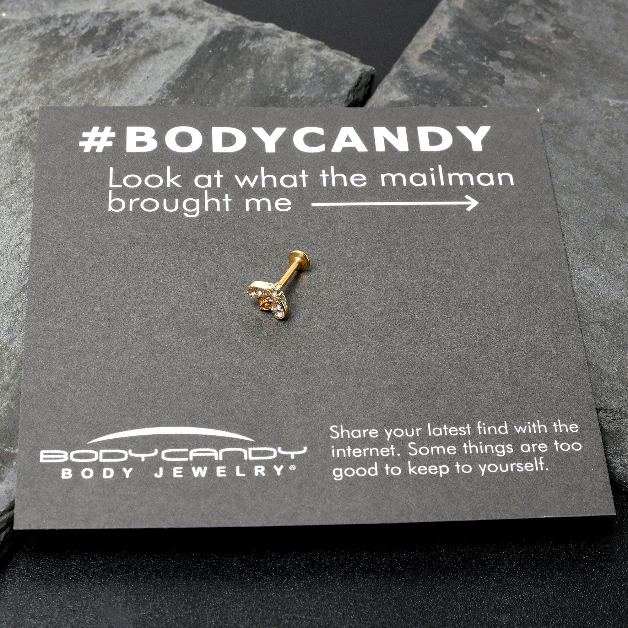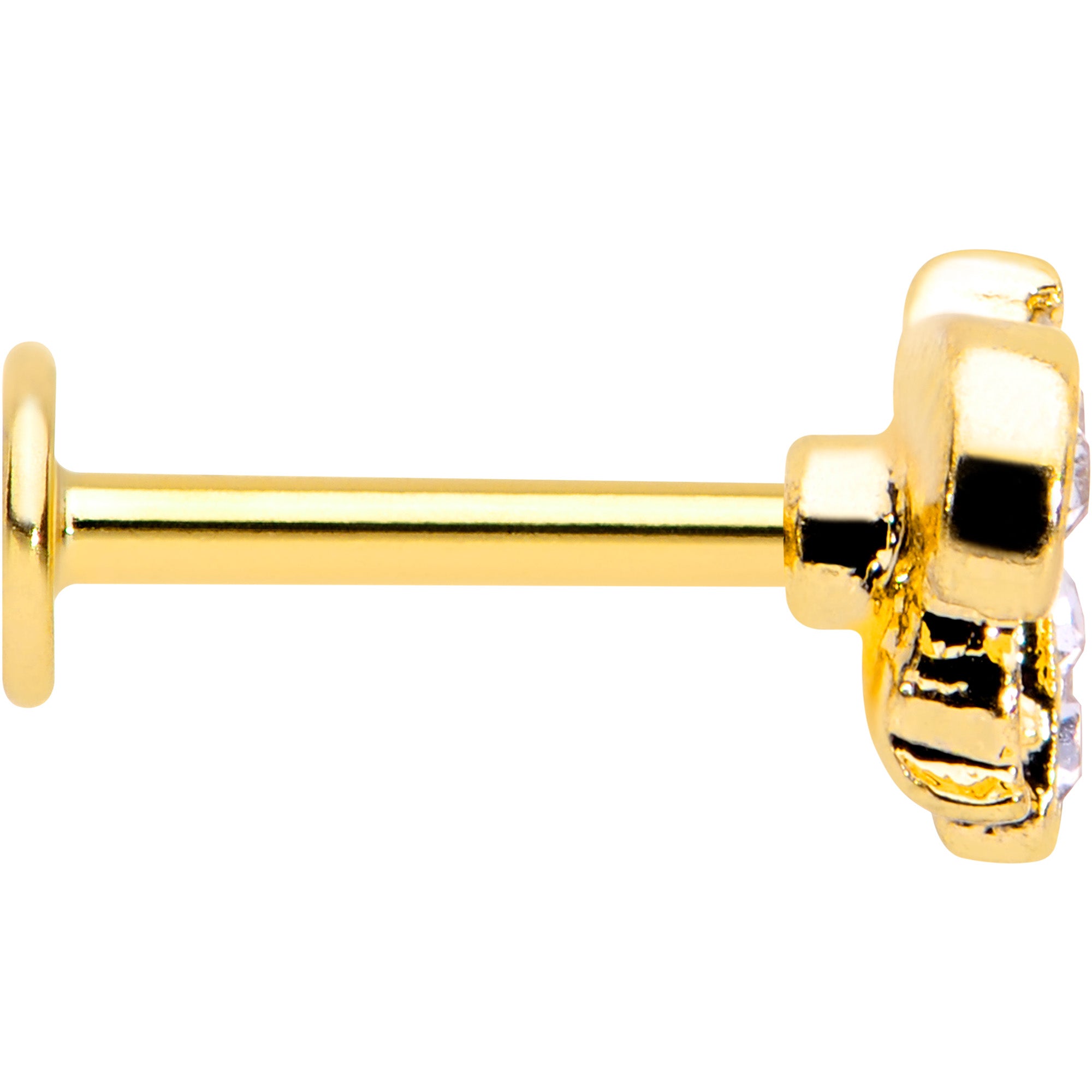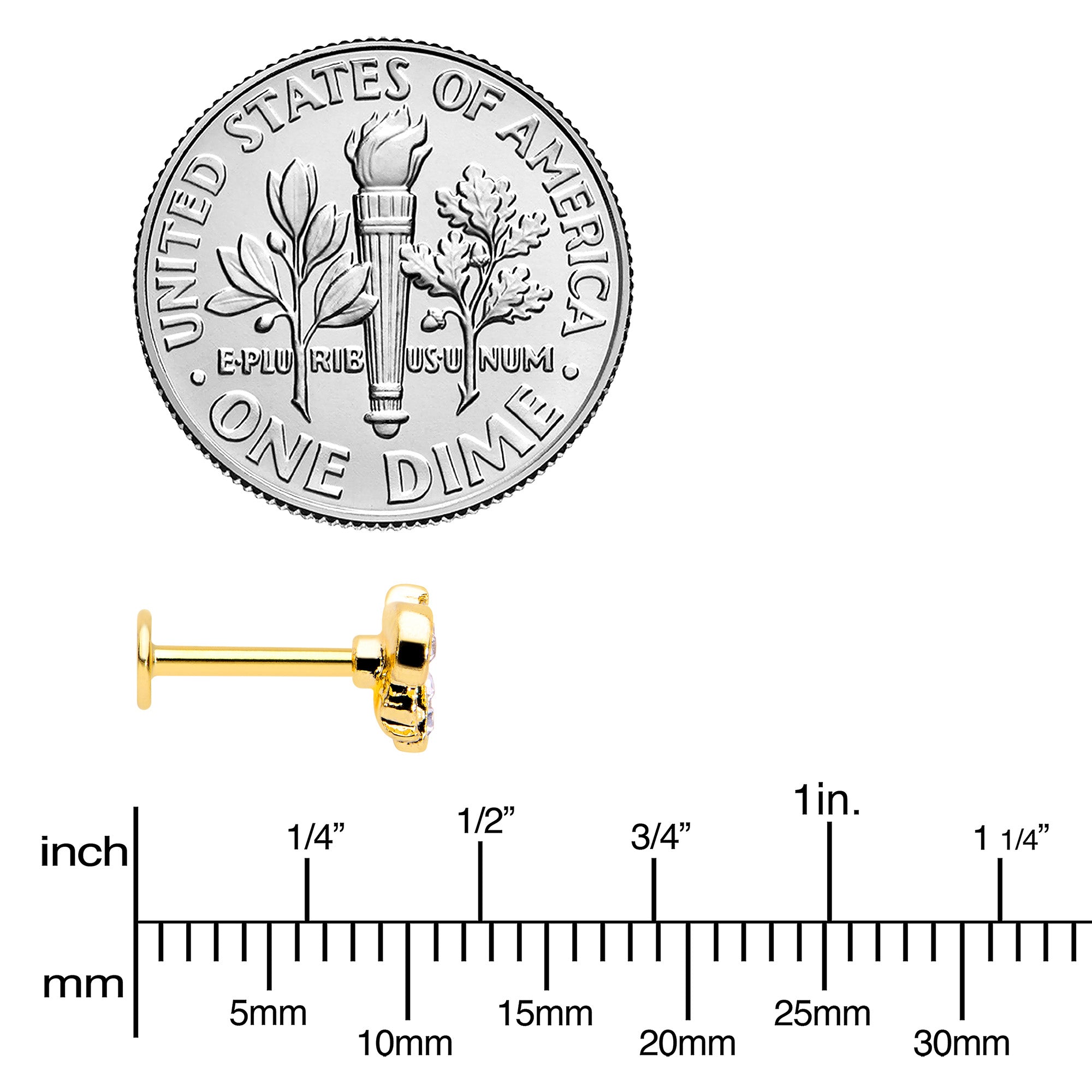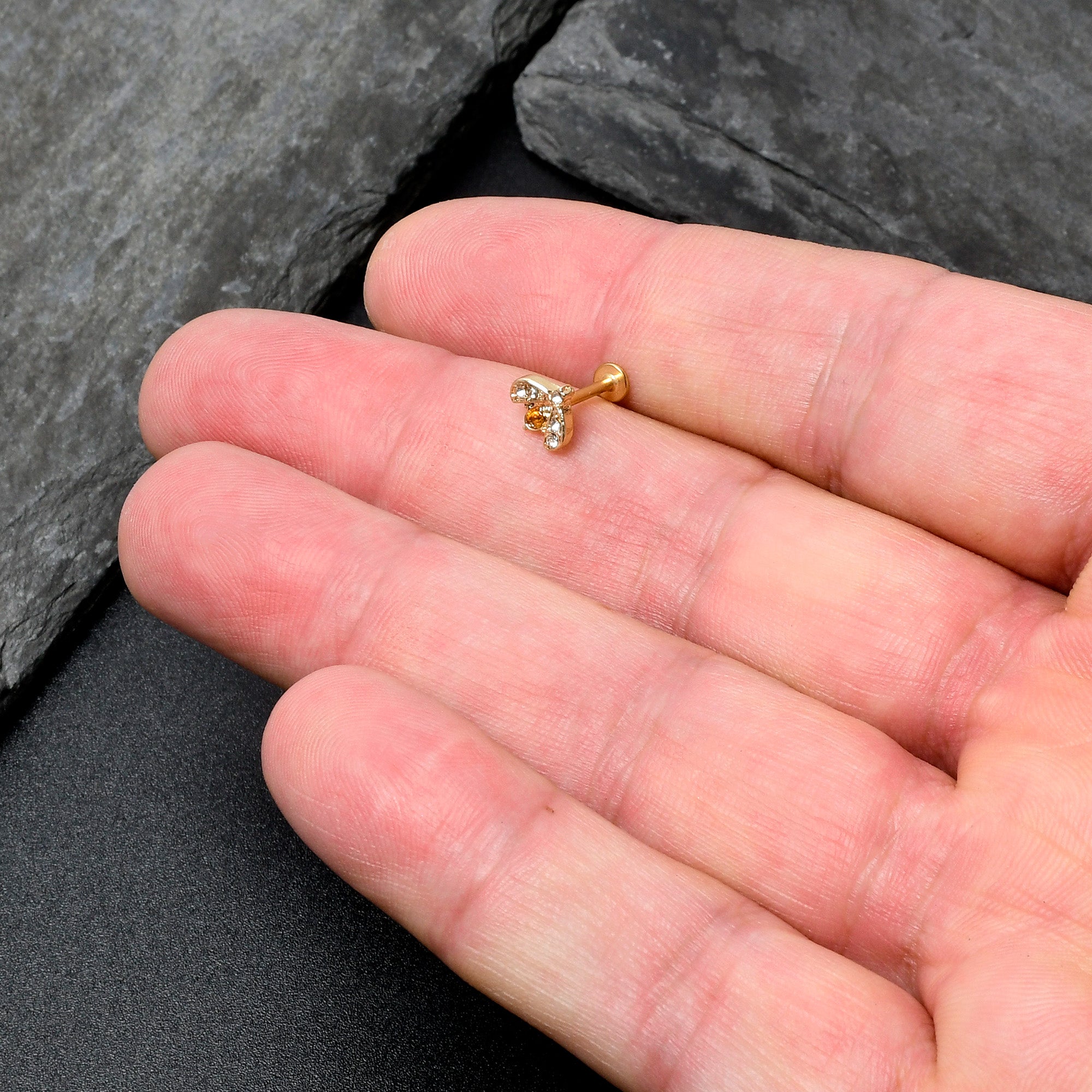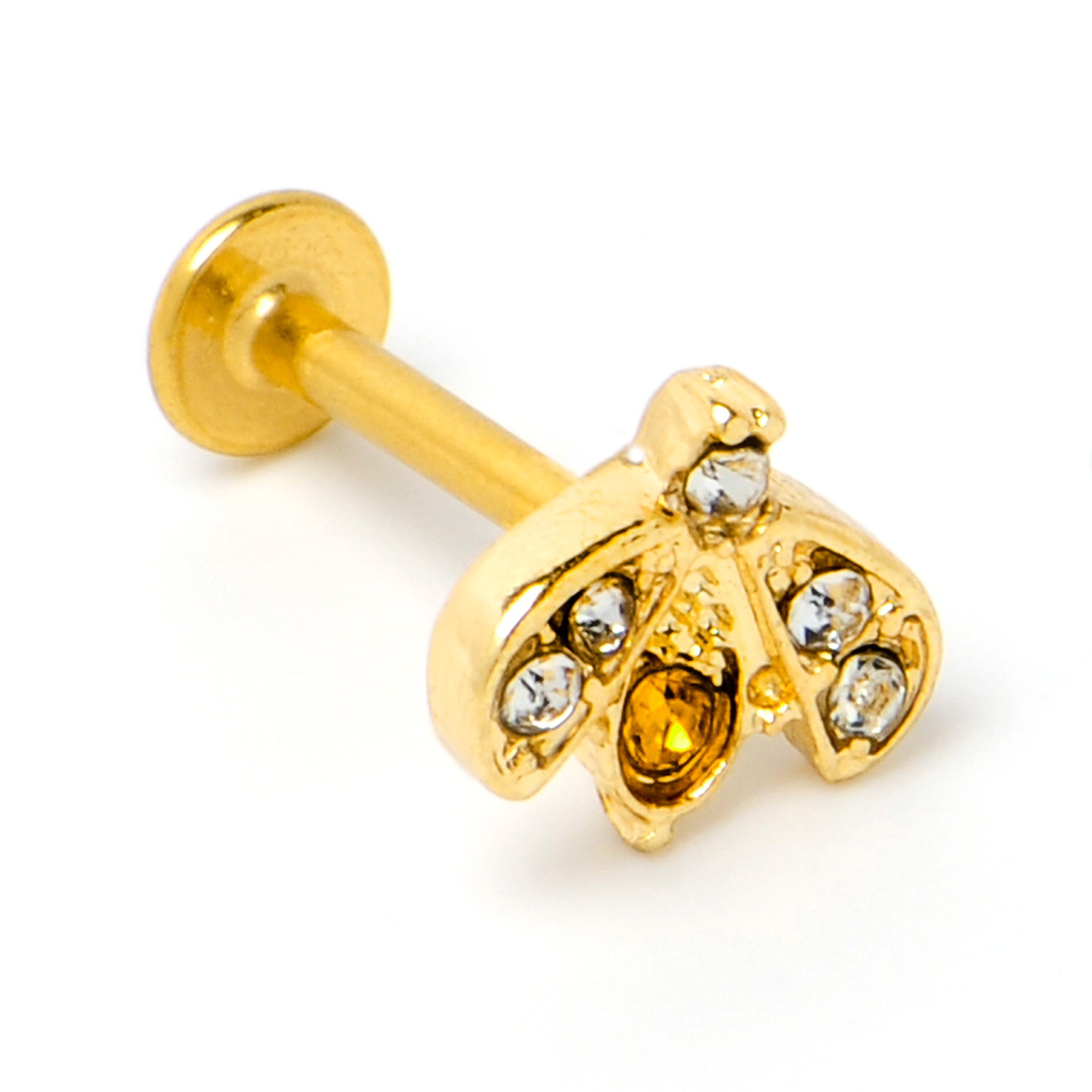 Get ready to catch the fashion bug with this stylish 16 gauge lip ring. It is made with an 8mm gold tone PVD over 316L surgical grade stainless steel straight post with a flat disc end. It features an insect charm, with the head composed of a single clear gem and the wings set with matching clear gems. The insect also features a yellow gem set in the body for added color and style. You can even rock it in multiple piercings including lip, monroe, tragus, helix, and some conch piercings. Don't let boring jewelry bug you when you're rocking this stylish cartilage piercing ring.