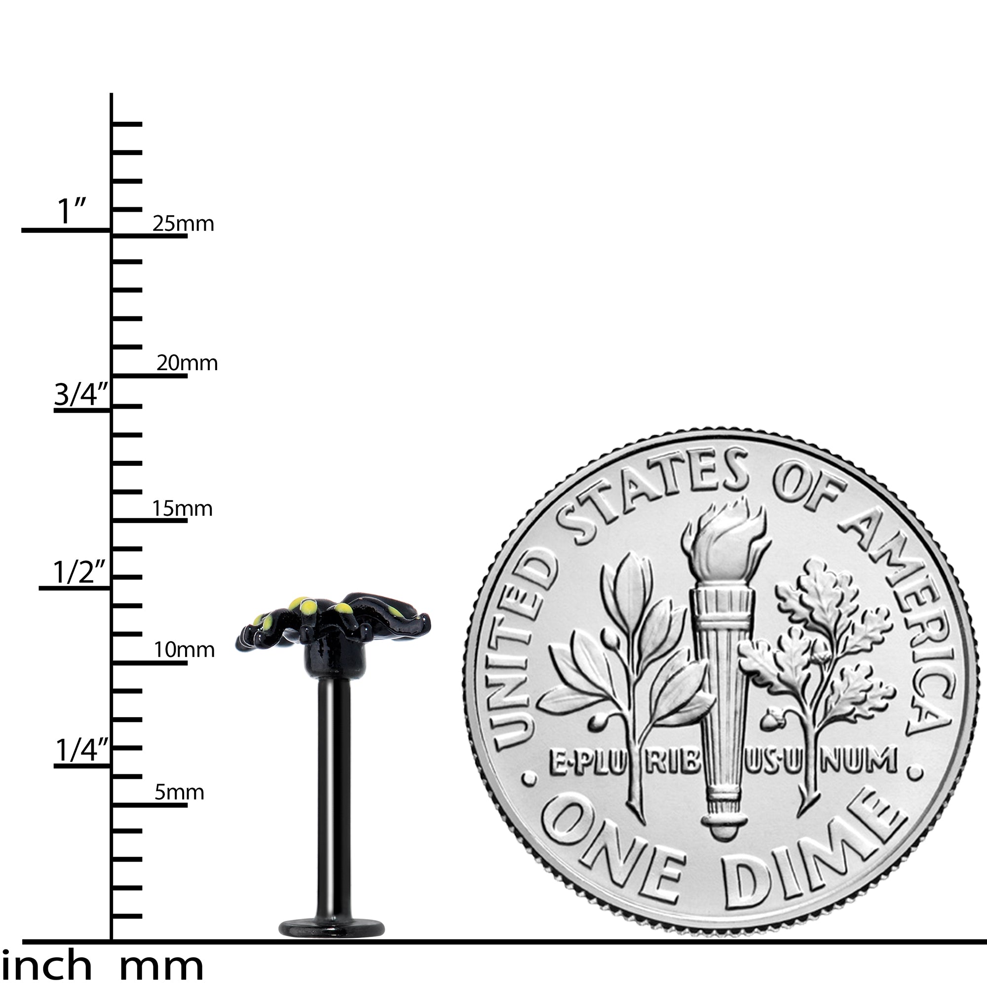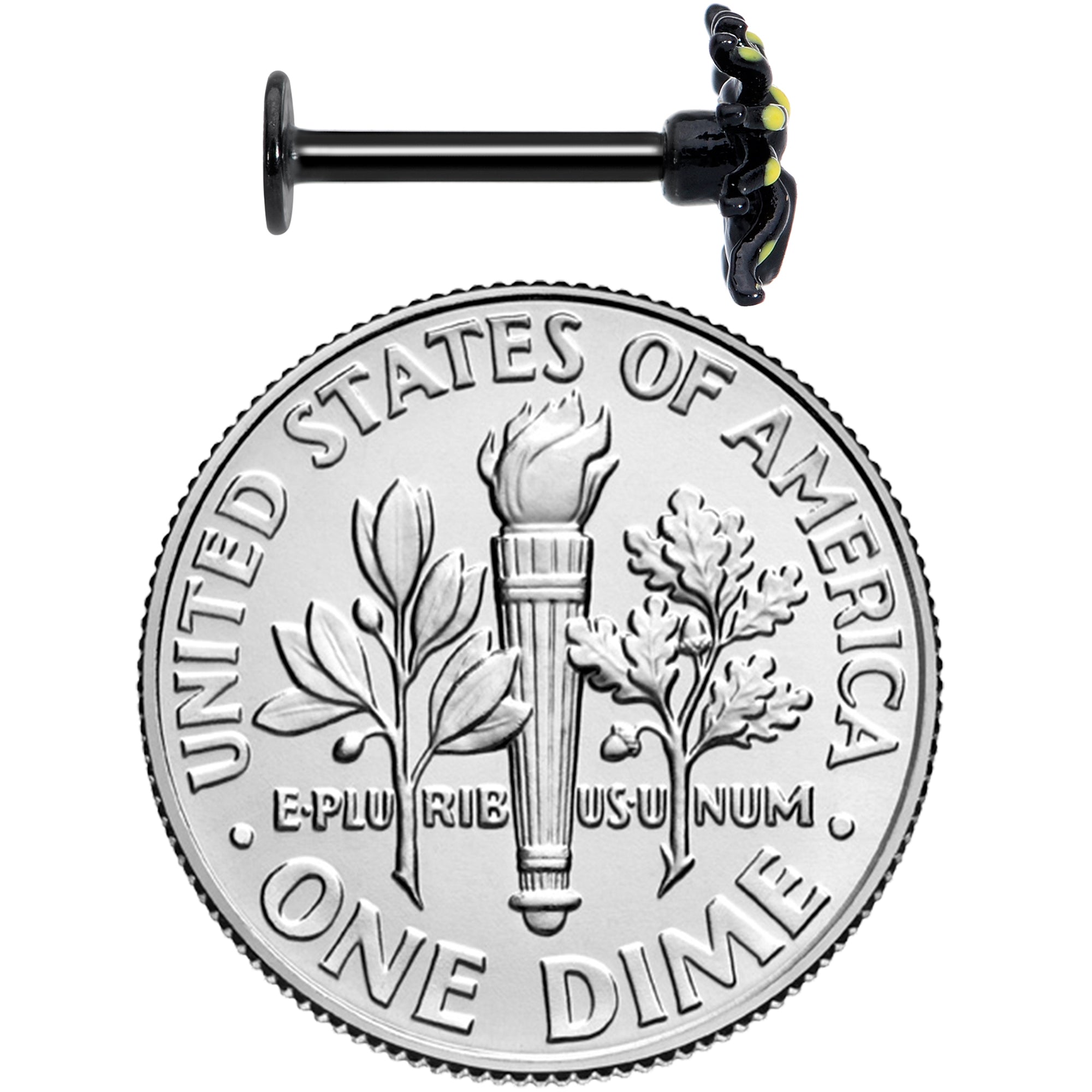 This is no itty-bitty spider! This 16 gauge cartilage jewelry is made with an 8mm black electroplated over 316L surgical grade stainless steel straight barbell with a flat disc end. The other end features a black spider charm with yellow embellishment that really makes it pop! The tarantula has individually detailed legs that offer added realism for an overall look that's perfect for Halloween! And it works well in multiple piercings including lip, monroe, conch, and helix. You're sure to adore this arachnid!