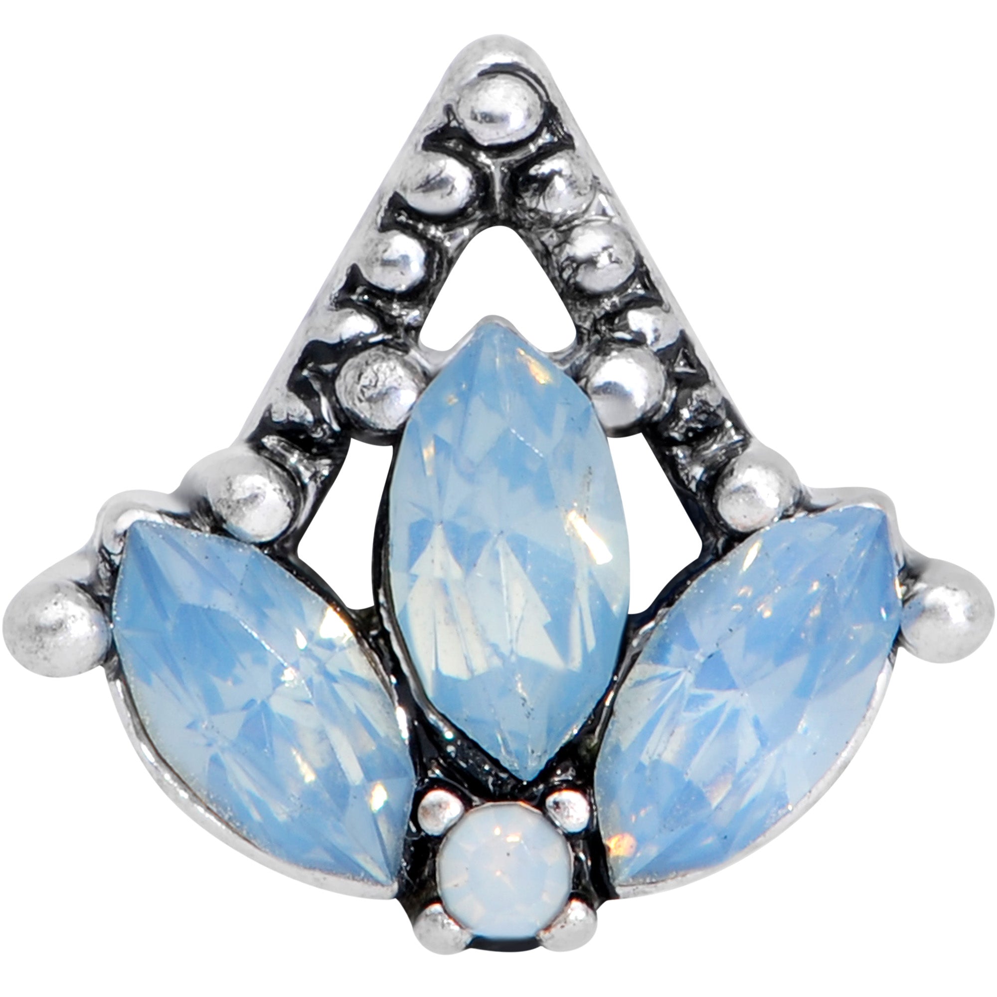 The best things come in threes, like on this 16 gauge lip ring! It's made with an 8mm durable 316L surgical grade stainless steel straight barbell with a flat disc end. It features a trio of oval blue faux opals, fanning out from a small clear gem. They're topped by a triangular embellishment with textured detailing. You can wear this trendy trio in multiple piercings, including lip, monroe, helix, tragus, and some conch piercings. With this classy cartilage jewelry, three will be your new lucky number!