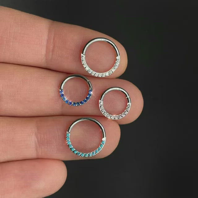 If you're looking for a clean, uncluttered look that's still chic and glamorous, we've got you covered with this 16 gauge cartilage earring! It's made with an 8mm durable 316L surgical grade stainless steel circular ring. It features ten small aqua gems, keeping it from being plain while not overwhelming the overall appearance. These cartilage rings are super easy to insert and remove - simply twist the ring open, insert, and then twist gently shut again. You'll love this feature because they work so well in multiple piercings including cartilage piercings like the daith, tragus, helix, and rook as well as the septum too!