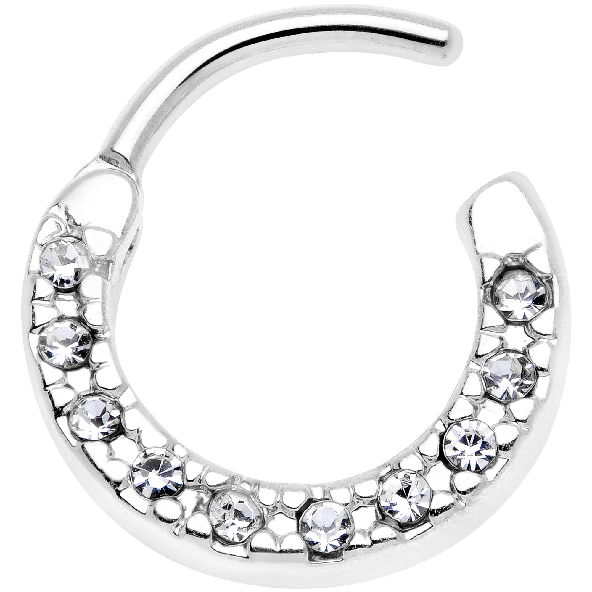 Add a look of sophistication to your ear piercings with this 16 gauge cartilage jewelry! It's made with an 8mm durable 316L surgical grade stainless steel hinged curved barbell. The bottom arc of this cartilage earring is paved with clear gems for a look that's totally attention-getting without being over-the-top. It works well in multiple piercings including cartilage piercings like your helix, daith, rook, and tragus as well as your septum piercing. So why be subtle when you can be ultra-glam with this fabulously extravagant cartilage ring?