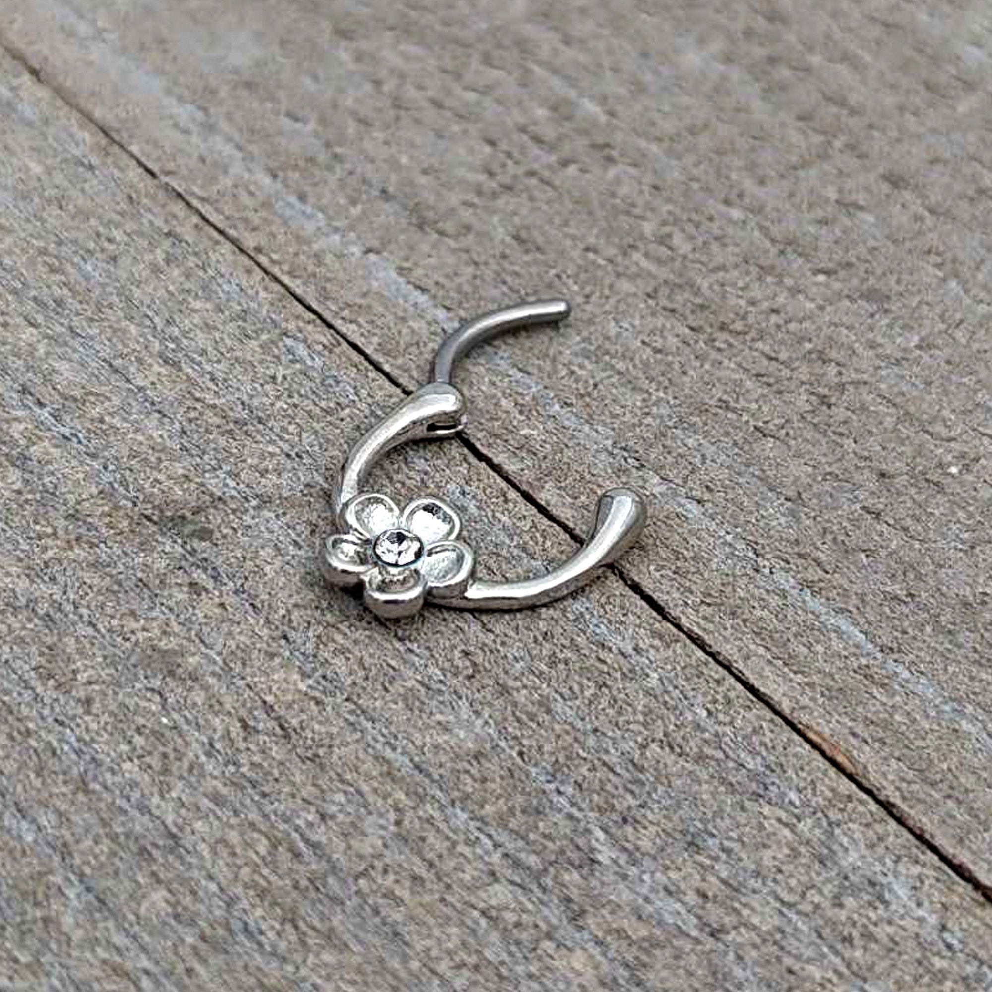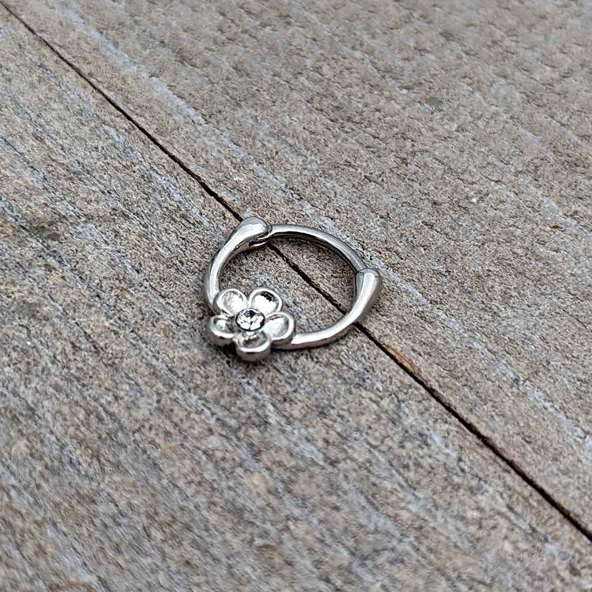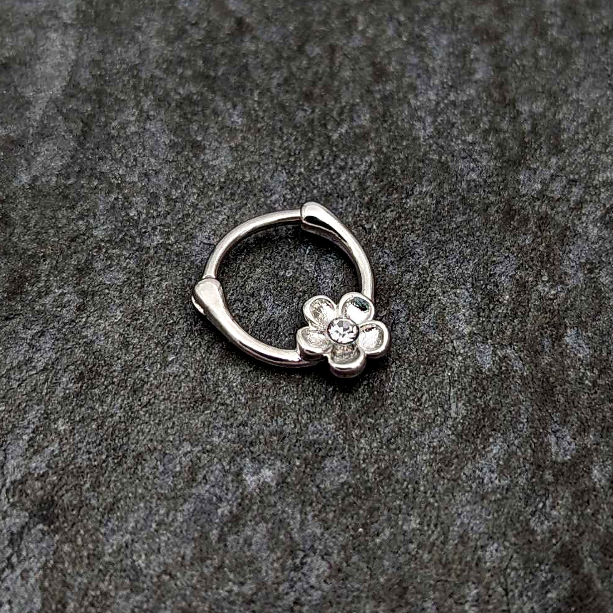What could feel more like Spring than this 16 gauge septum ring? It's made with an 8mm durable 316L surgical grade stainless steel hinged curved barbell. It features a simply styled flower charm, set with a clear gem embellishment at the center. The hinged, clicker design makes insertion and removal a snap and you can even rock this ring in multiple piercings including tragus, helix, and some daith piercings. Let your cartilage piercings sport some sweet springtime style with this charming and stylish cartilage piercing ring!