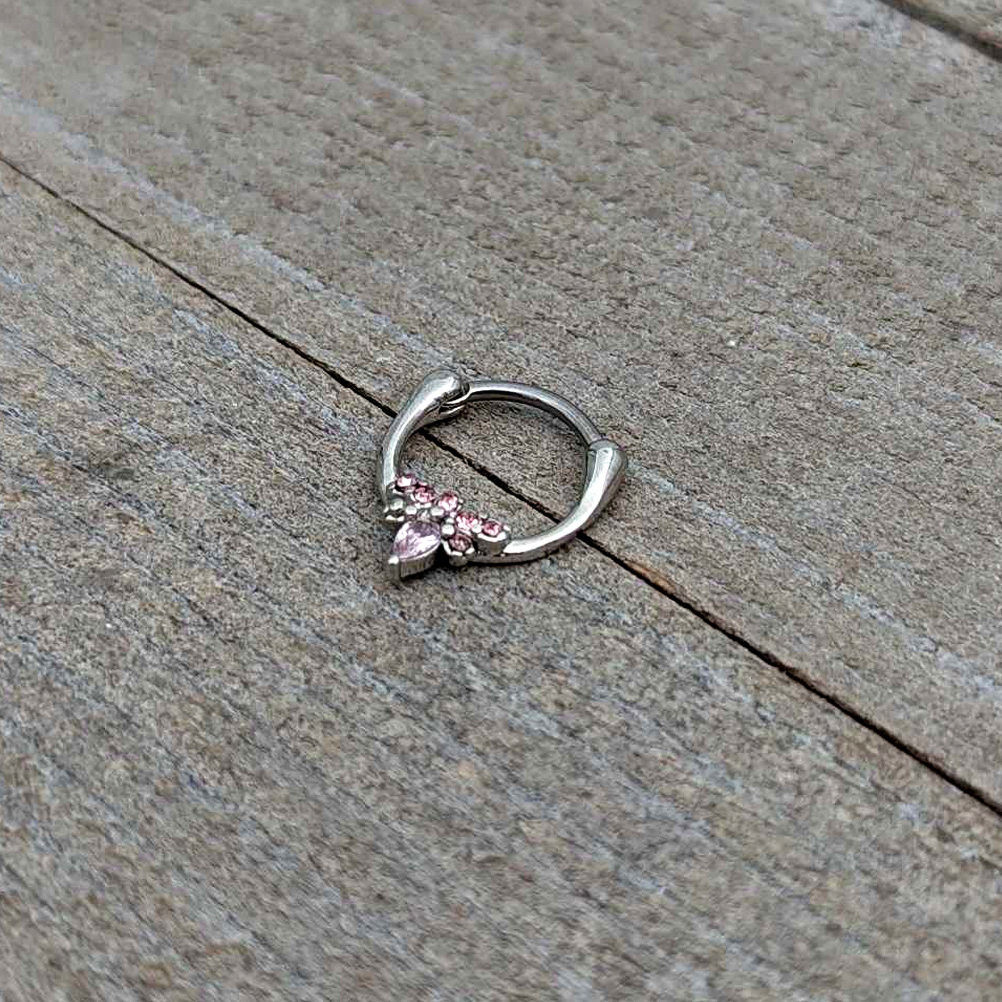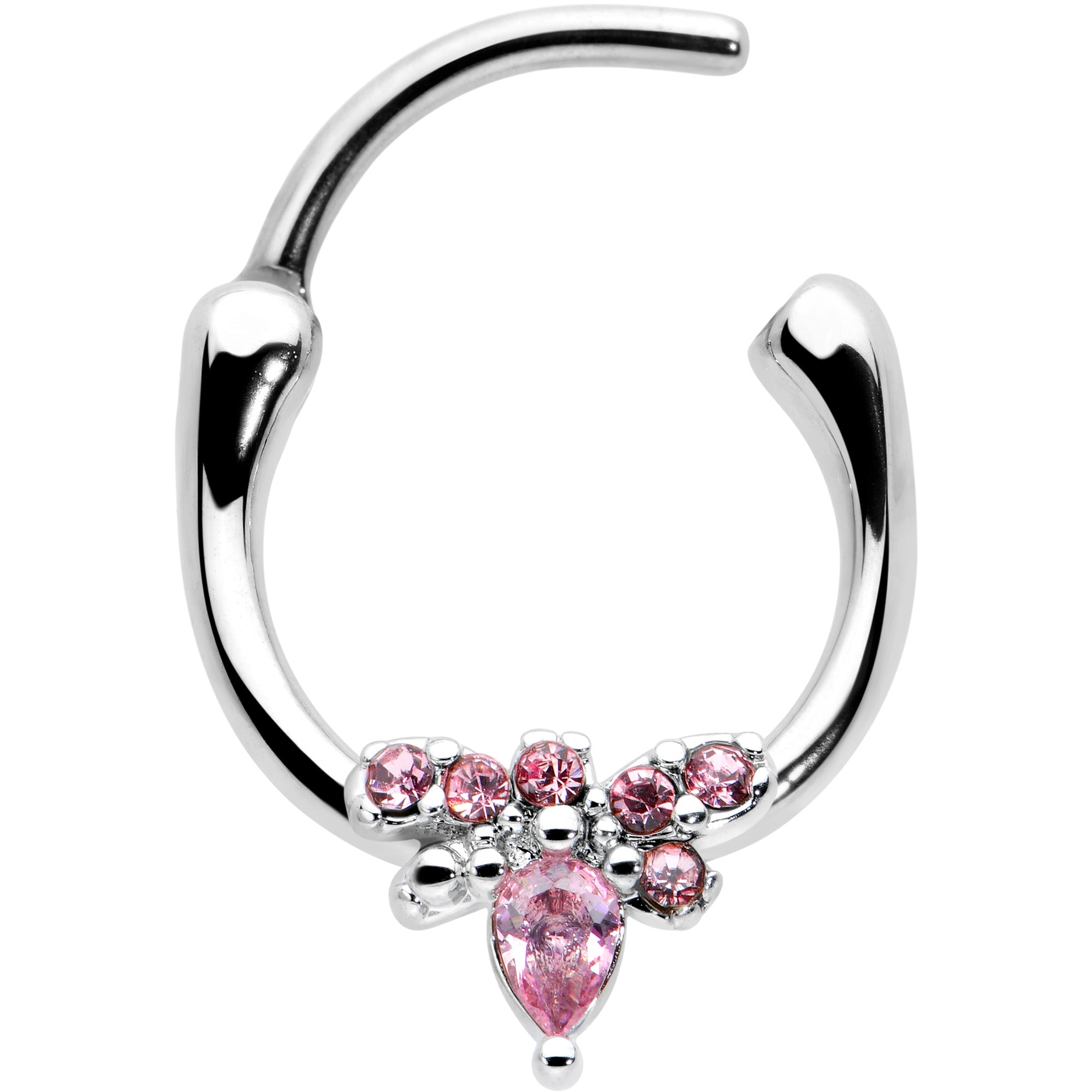 The gorgeous style of this 16 gauge septum ring is sure to have everyone buzzing! It's made with an 8mm durable 316L surgical grade stainless steel hinged curved barbell. It features a bee charm with the wings set with pink gems and a pink gem body for added eye-catching flair. The hinged clicker design makes it a snap to insert and remove and you can also rock this bee in multiple piercings including tragus, helix, and some daith piercings. This honey of a cartilage ring will make your piercings the sweetest in the hive!