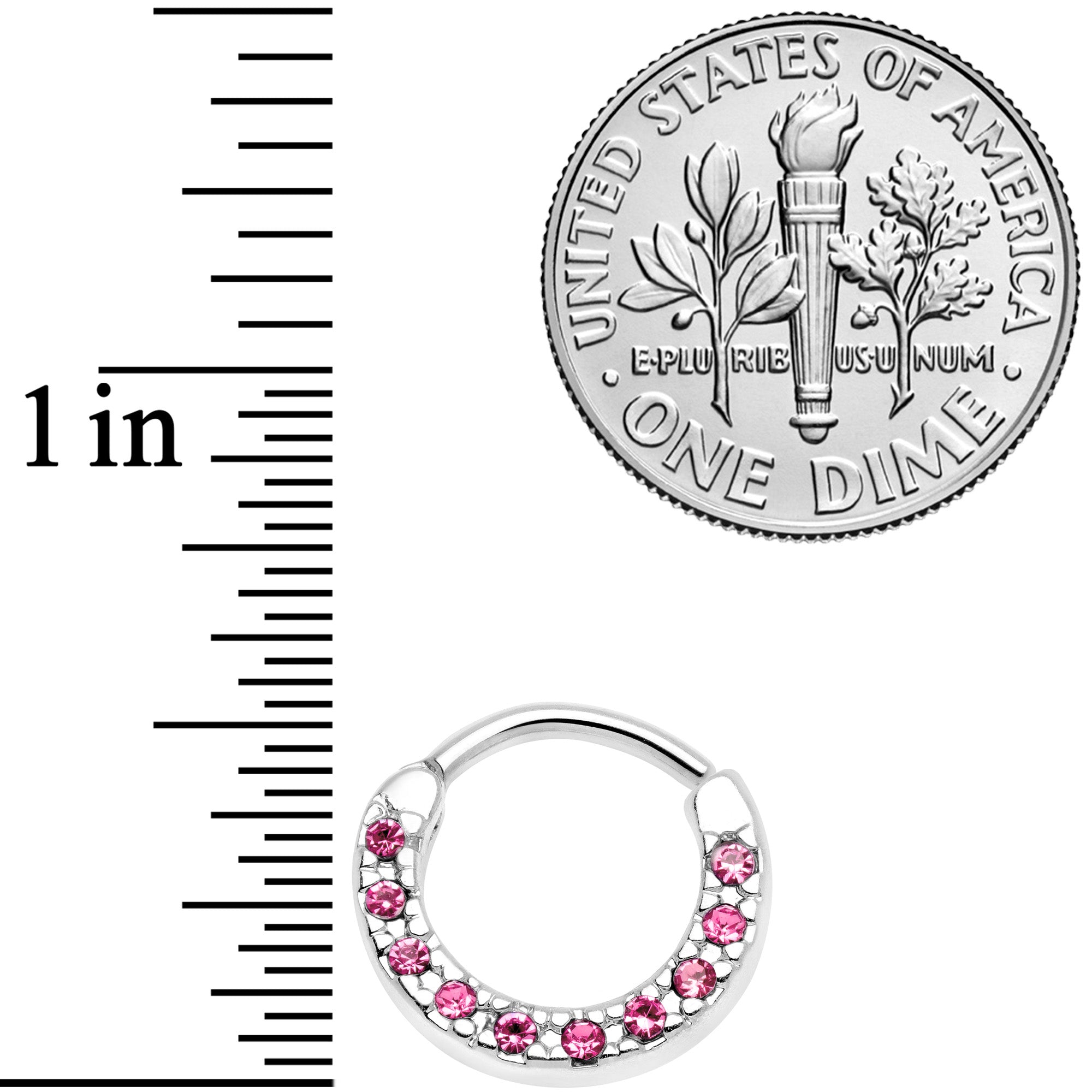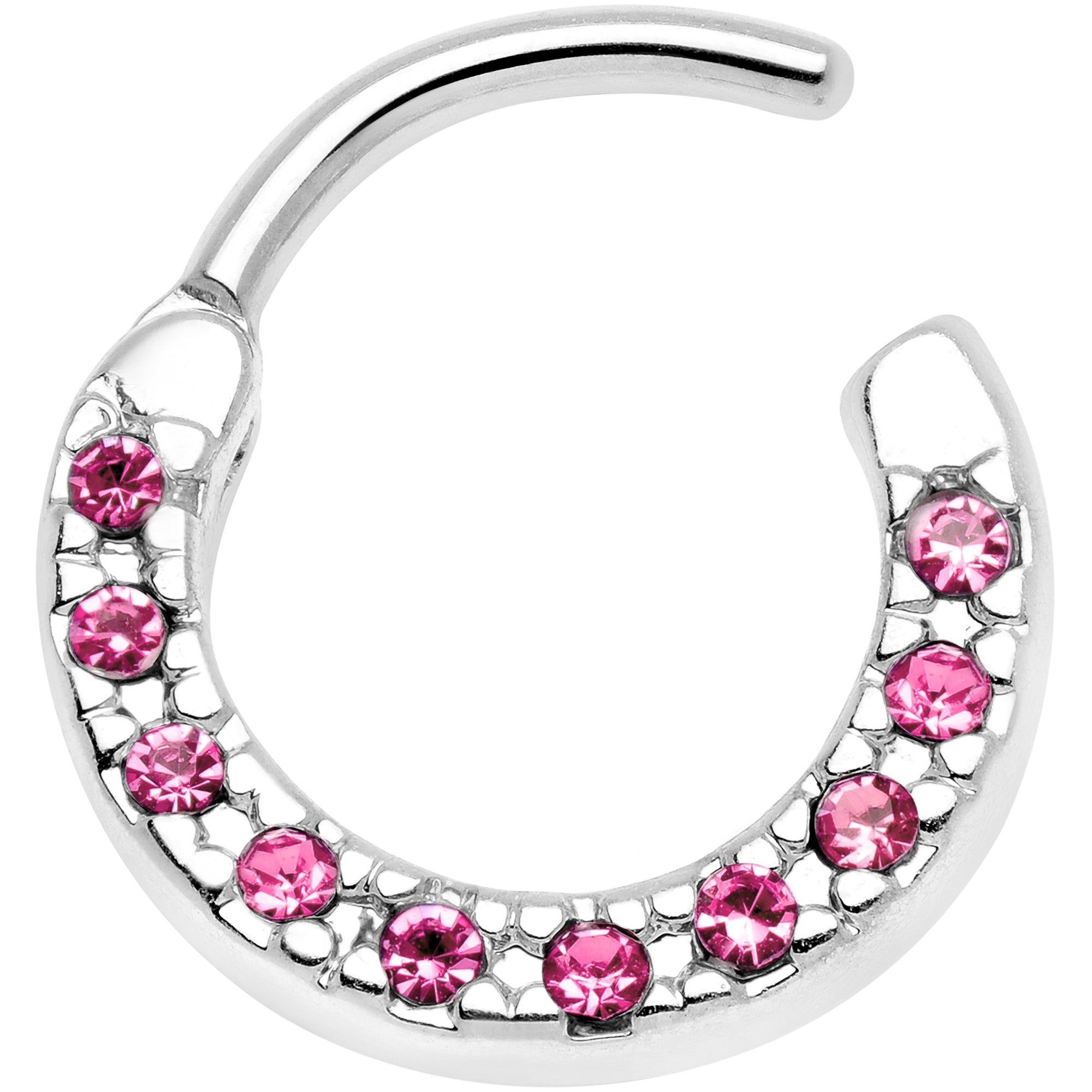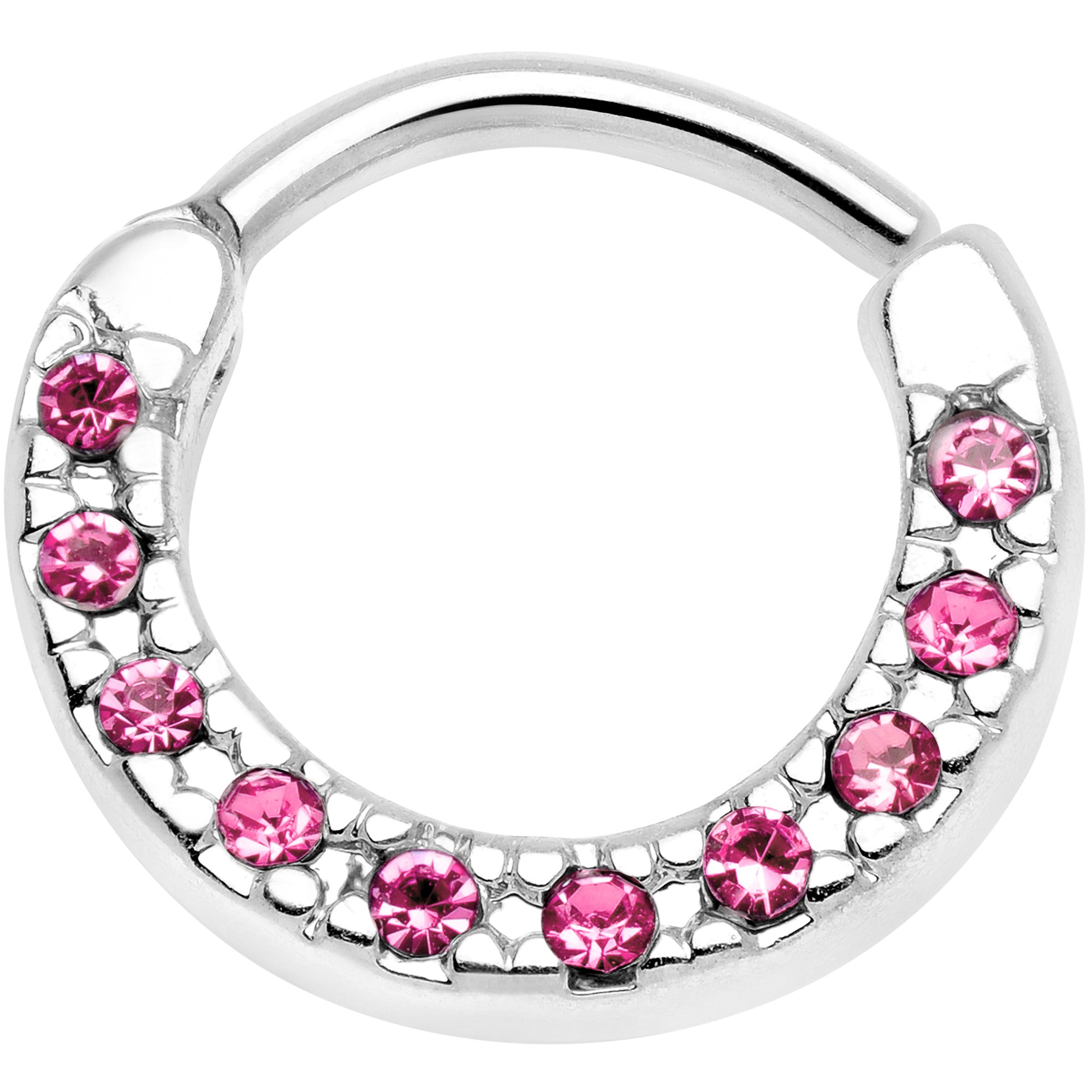 Add a look of sophistication to your ear piercings with this 16 gauge cartilage jewelry! It's made with an 8mm durable 316L surgical grade stainless steel hinged curved barbell. The bottom arc of this cartilage earring is paved with pink gems for a look that's totally attention-getting without being over-the-top. It works well in multiple piercings including cartilage piercings like your helix, daith, rook, and tragus as well as your septum piercing. So why be subtle when you can be ultra-glam with this fabulously extravagant cartilage ring?