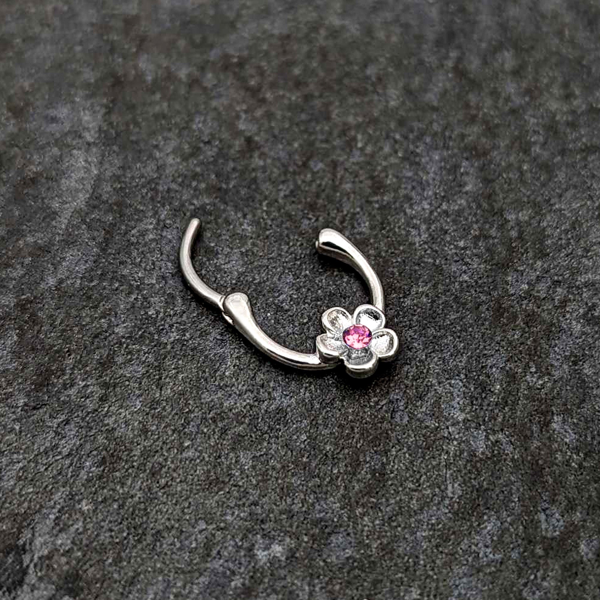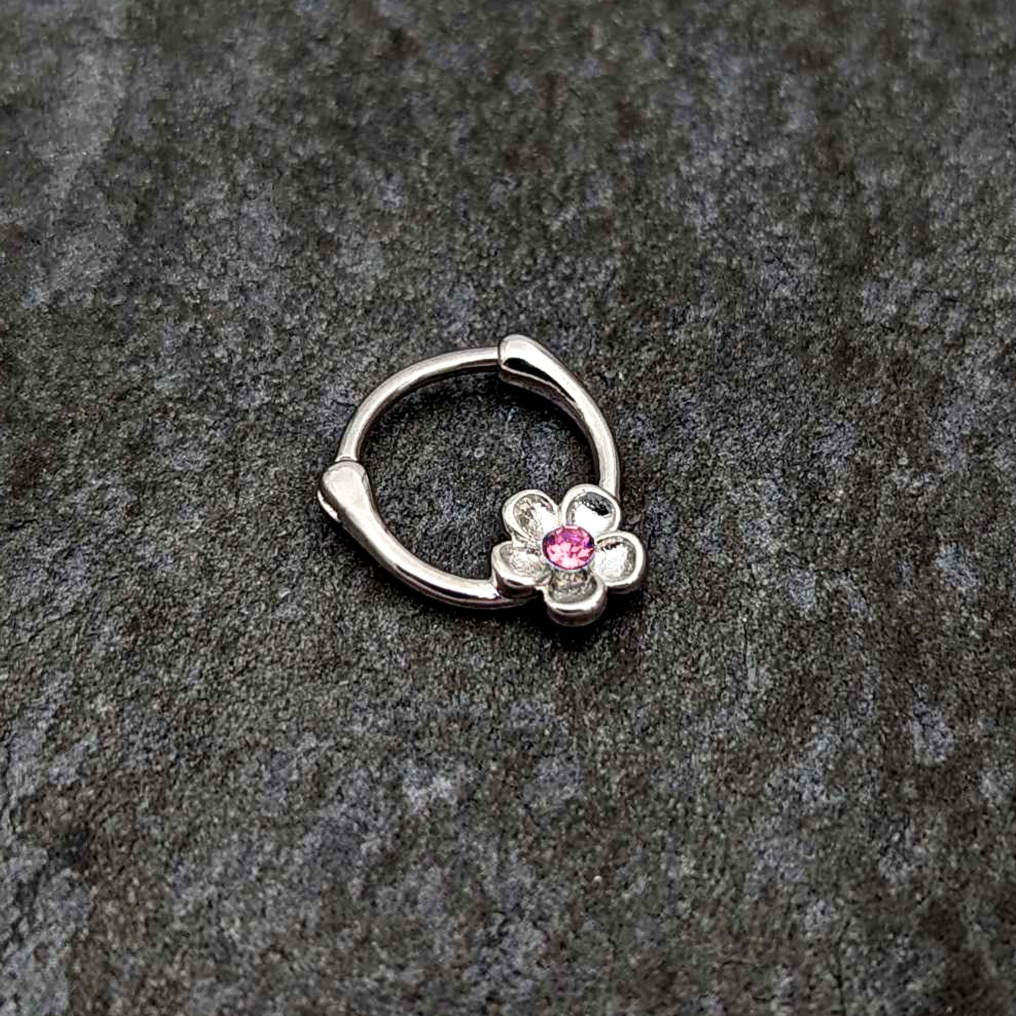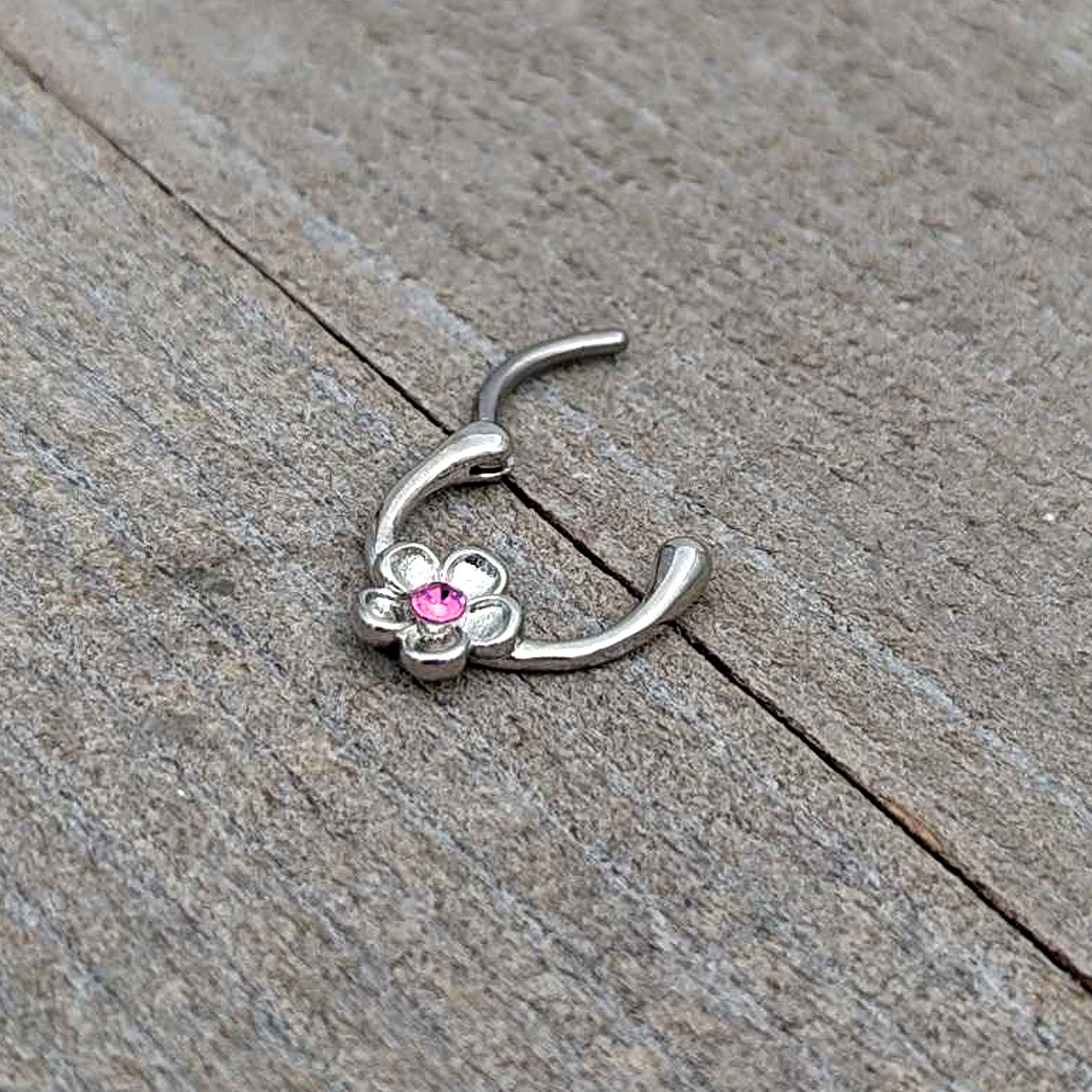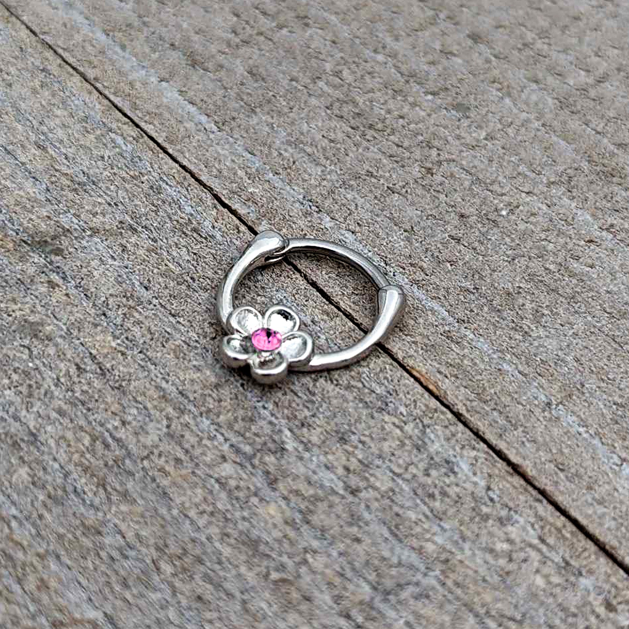 What could feel more like Spring than this 16 gauge septum ring? It's made with an 8mm durable 316L surgical grade stainless steel hinged curved barbell. It features a simply styled flower charm, set with a pink gem embellishment at the center. The hinged, clicker design makes insertion and removal a snap and you can even rock this ring in multiple piercings including tragus, helix, and some daith piercings. Let your cartilage piercings sport some sweet springtime style with this charming and stylish cartilage piercing ring!