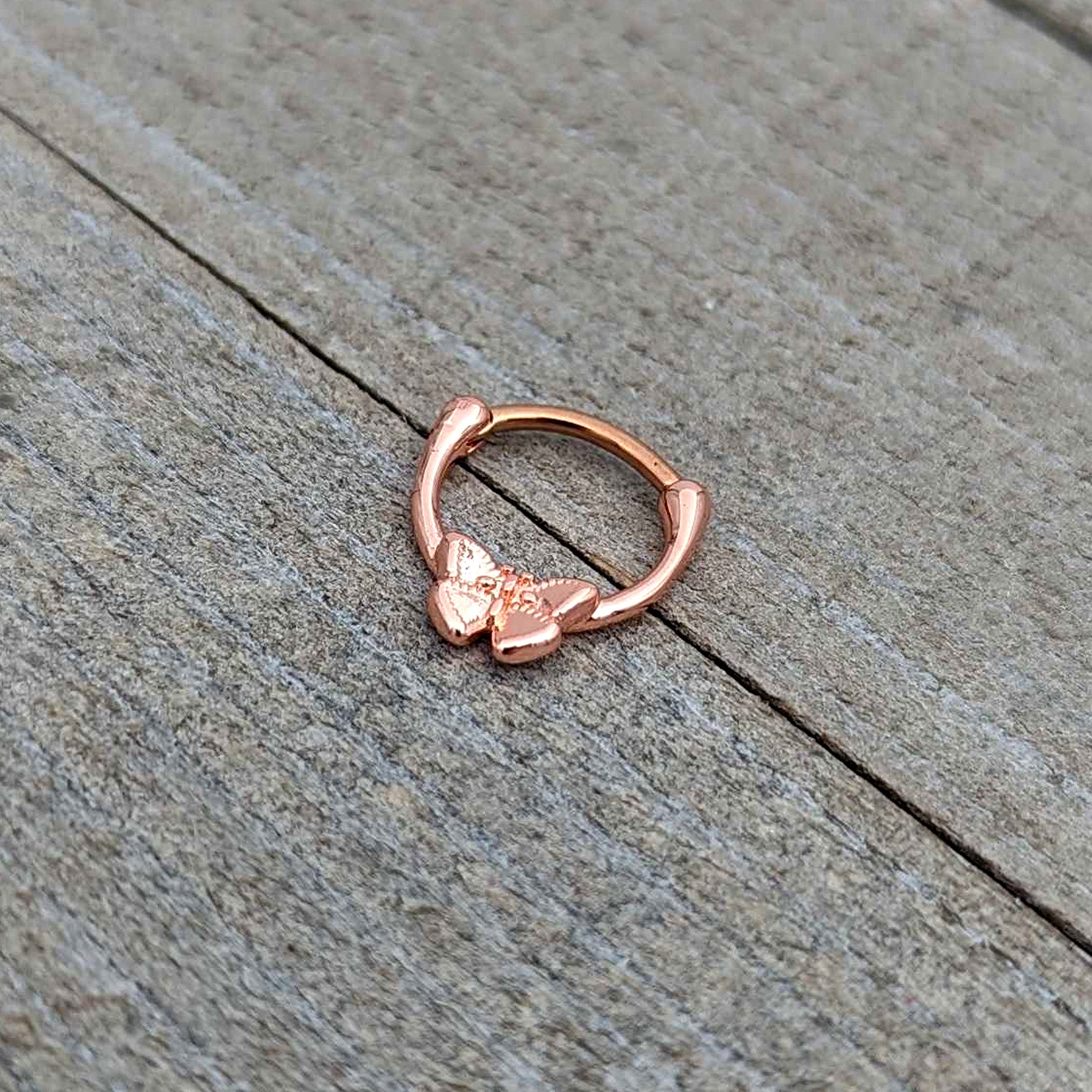This 16 gauge septum ring isn't just a beauty, it's a beautiful butterfly! It's made with an 8mm rose gold tone PVD over 316L surgical grade stainless steel hinged curved barbell. It features an elegantly simple butterfly charm, with understated textured detailing. It also features a hinged clicker design that makes insertion and removal a snap and you can rock it in multiple piercings including tragus, helix, and some daith piercings. Thoughtful details, style, and plenty of purposes.....this cartilage piercing jewelry really does have it all!