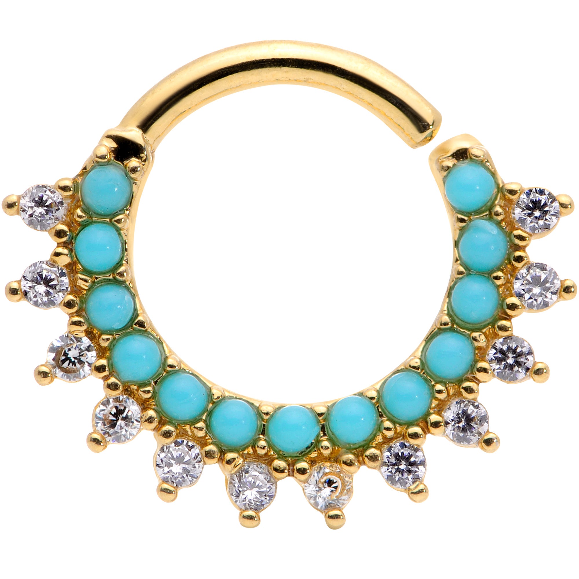 This 16 gauge cartilage jewelry is reminiscent of the sun coming up over the southwestern desert! The 8mm tragus earring is made with gold tone plated over brass. It features a row of small synthetic turquoise stones which are further embellished with a row of triangular clear cubic zirconia gems. This cartilage ring is super easy to insert and remove - simply twist the ring open, insert, and then twist gently shut again. You'll love this feature because this works so well in multiple piercings including the septum as well as cartilage piercings like the tragus, helix, daith, helix, and rook. Let the sun shine on all of your piercings...or from them with this beautiful southwestern-styled cartilage earring!