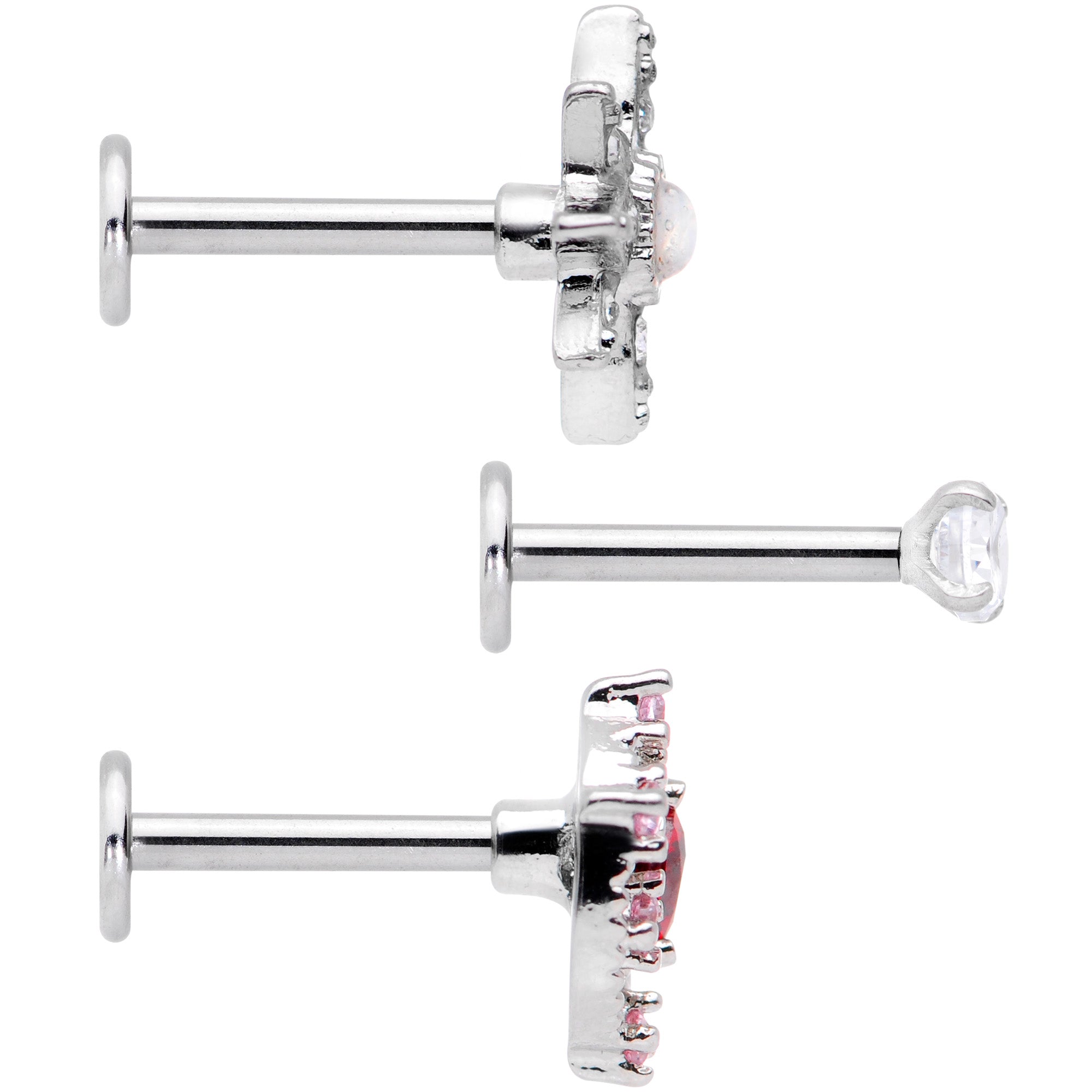 You can have the moon, stars, and more with this set of 16 gauge cartilage jewelry! Each one is made with an 8mm durable 316L surgical grade stainless steel post. You get one featuring an eight-pointed star set with clear cubic zirconia gems and set with a white faux opal at the center. You get a second one in the shape of a crescent moon with a large red gem at its center and small pink gems around the outer textured edge. The third one features a simple clear cubic zirconia and is internally threaded, for an elegantly timeless appearance. These work well in multiple piercings including facial piercings like the lip and monroe as well as cartilage piercings like the tragus, helix, and conch. Give your piercings a heavenly glow with this set of celestial labrets! Sold as a set of three.