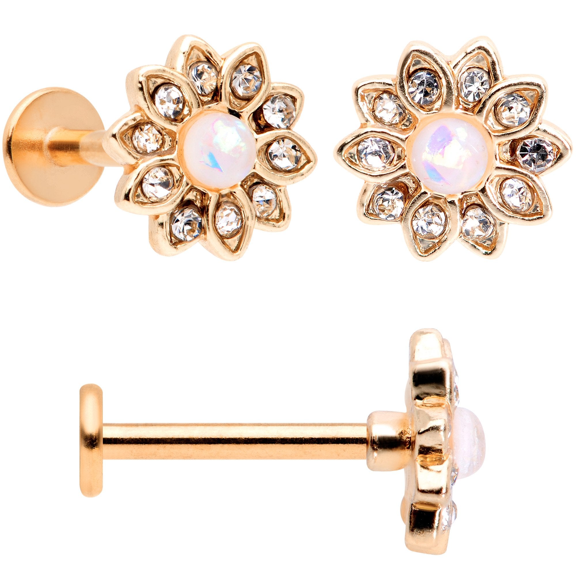 Now your piercings can blossom however you want with this set of 16 gauge labret studs! All three tragus earrings are made with 8mm rose gold tone plated over 316L surgical grade stainless steel posts. You get one with a simple 3mm ball end for a classic, timeless look. You get one which is internally threaded for comfortable wear, with a simple flat end composed of a clear gem. The third is a stunning sunflower with clear gems embellishing the petals and a large white faux opal in the center. Perfect for Springtime! This lip jewelry also works well in multiple piercings such as the monroe and cartilage piercings like the conch, helix and tragus. With this set, you're ready for anything - no matter the reason or the season! Sold as a set of three.