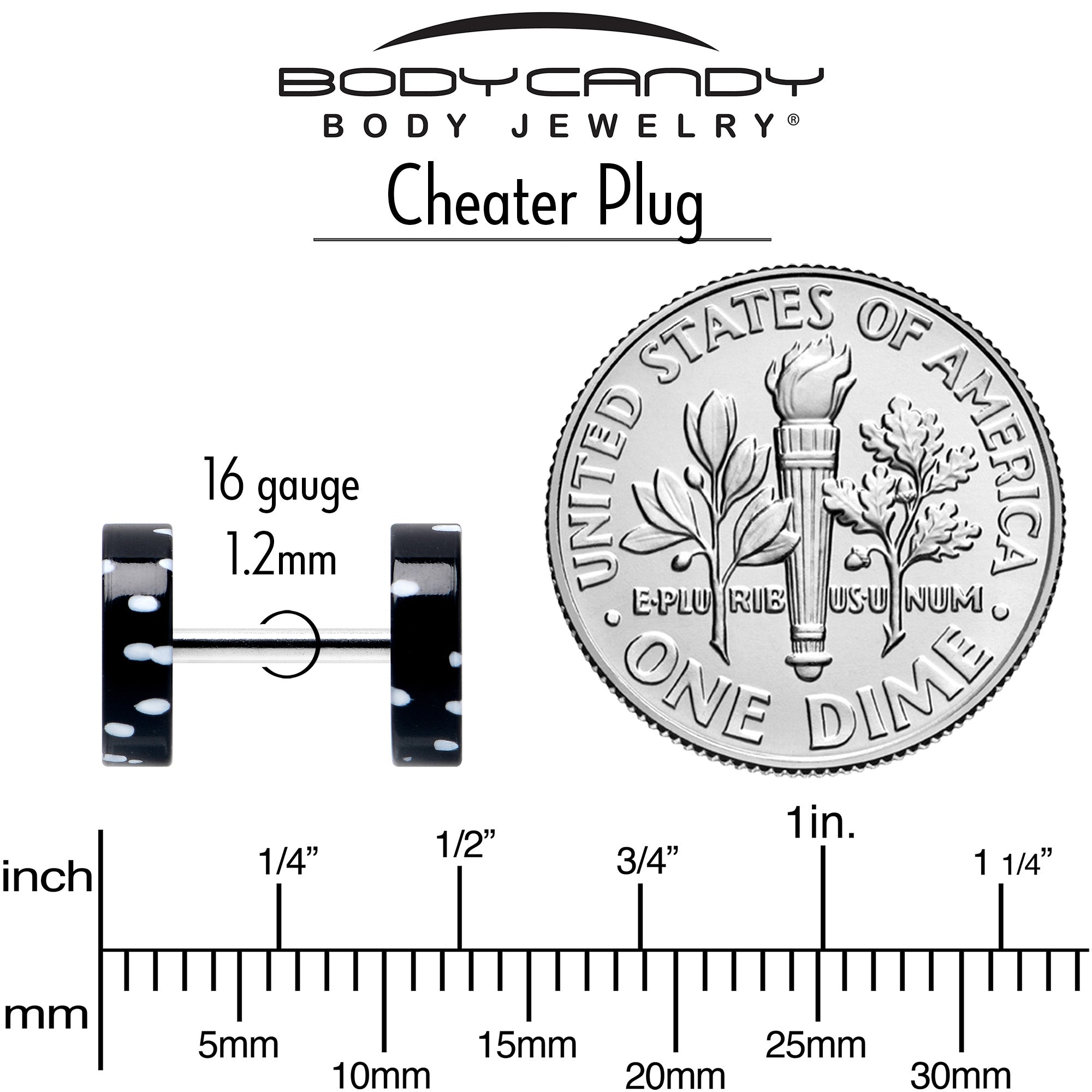 Get the look without the commitment with these trompe l'oeil cheater plugs! They're made with 16 gauge stainless steel posts to fit standard or slightly larger sized pierced ear lobes. The front and back feature 0 gauge round segments to give the look of plugs with no stretching required. The front and back portions are black and feature a white polka dot pattern that it totally pin-up perfect. Get the look without committing to stretched lobes with these uncomplicated cheater plugs. Sold as a set of two.