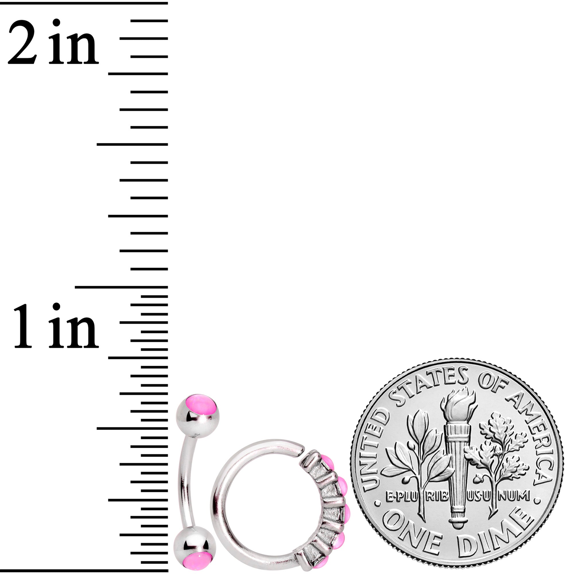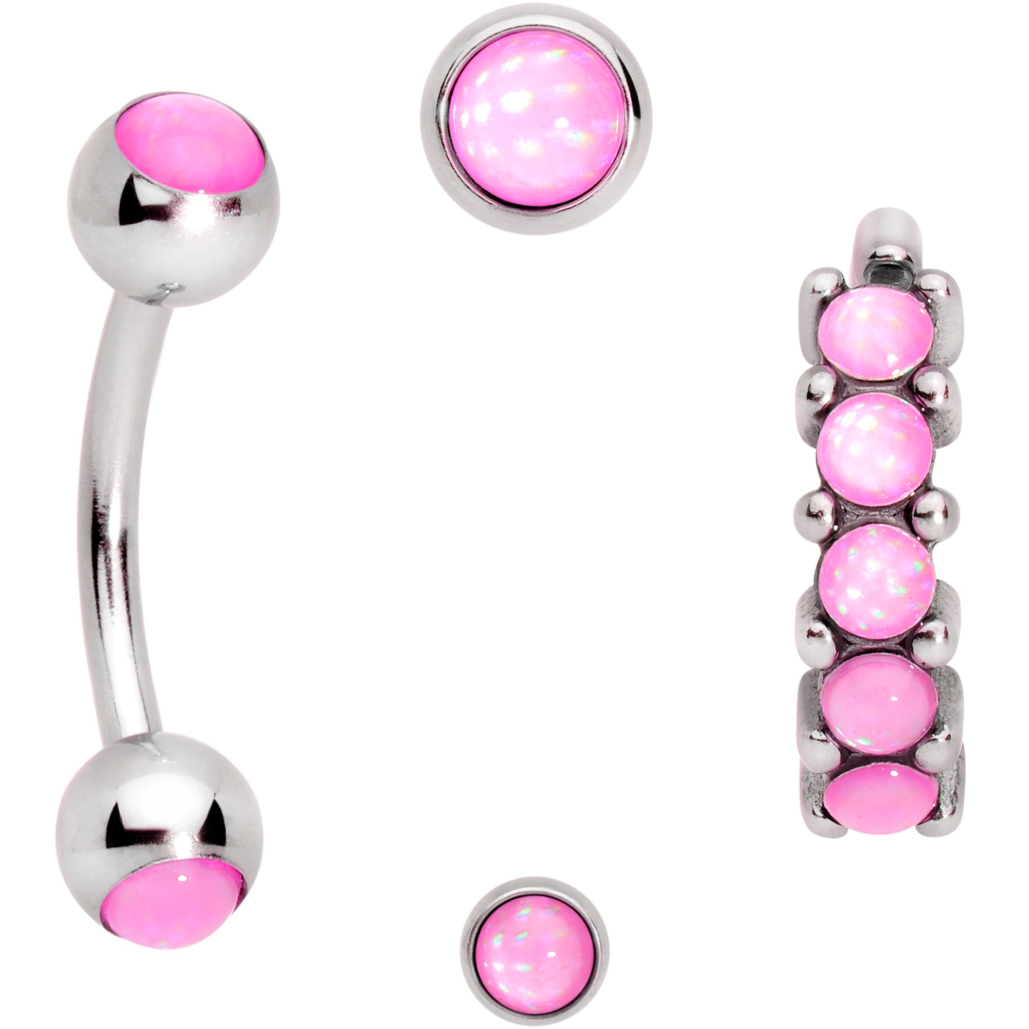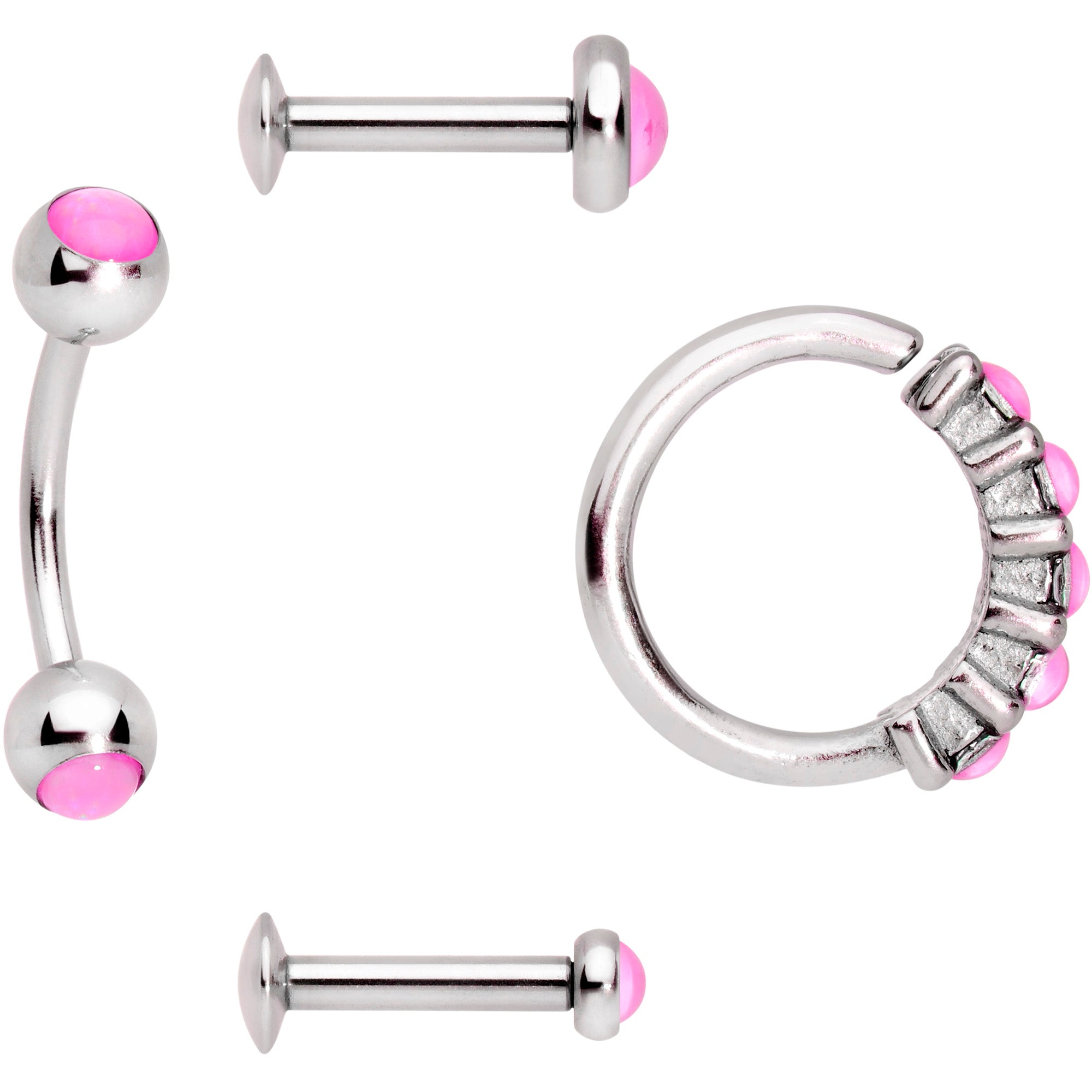 Whether you want a matching, curated look or simply have a hard time making up your mind, this set of 16 gauge cartilage jewelry has a style for everything and everyone! First, are a pair of 1/4" durable 316L surgical grade stainless steel straight barbells with flat disc ends. One has a 2mm pink orb end for a subtle look and one has a 4mm pink orb end. These can be worn in labret and monroe piercings as well as cartilage piercings like the helix, tragus, and conch. Next you get a 5/16" durable 316L surgical grade curved barbell with 4mm pink orb ends. This is a perfect fit for rook and eyebrow piercings. Finally, you get a 5/16" durable 316L surgical grade stainless steel circular ring, set on one side with 5 pink orbs. This ring is super easy to insert and remove - simply twist the ring open, insert, and then twist gently shut again. And it's perfect for piercings like septum as well as cartilage like the daith, helix, rook, and tragus. Get all your facial piercings covered....in style! Sold as a set of four.