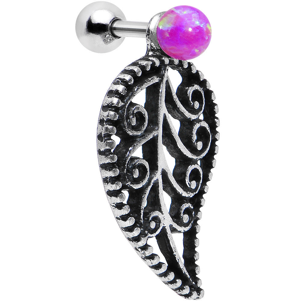 Float into vintage-style fashion with this pink synthetic opal falling leaf cartilage tragus earring. A removable scrolled leaf charm dangles from a 16 gauge stainless steel straight barbell. This cartilage ring can be used for upper ear, lobes, tragus, conch and helix piercings. Sold individually.