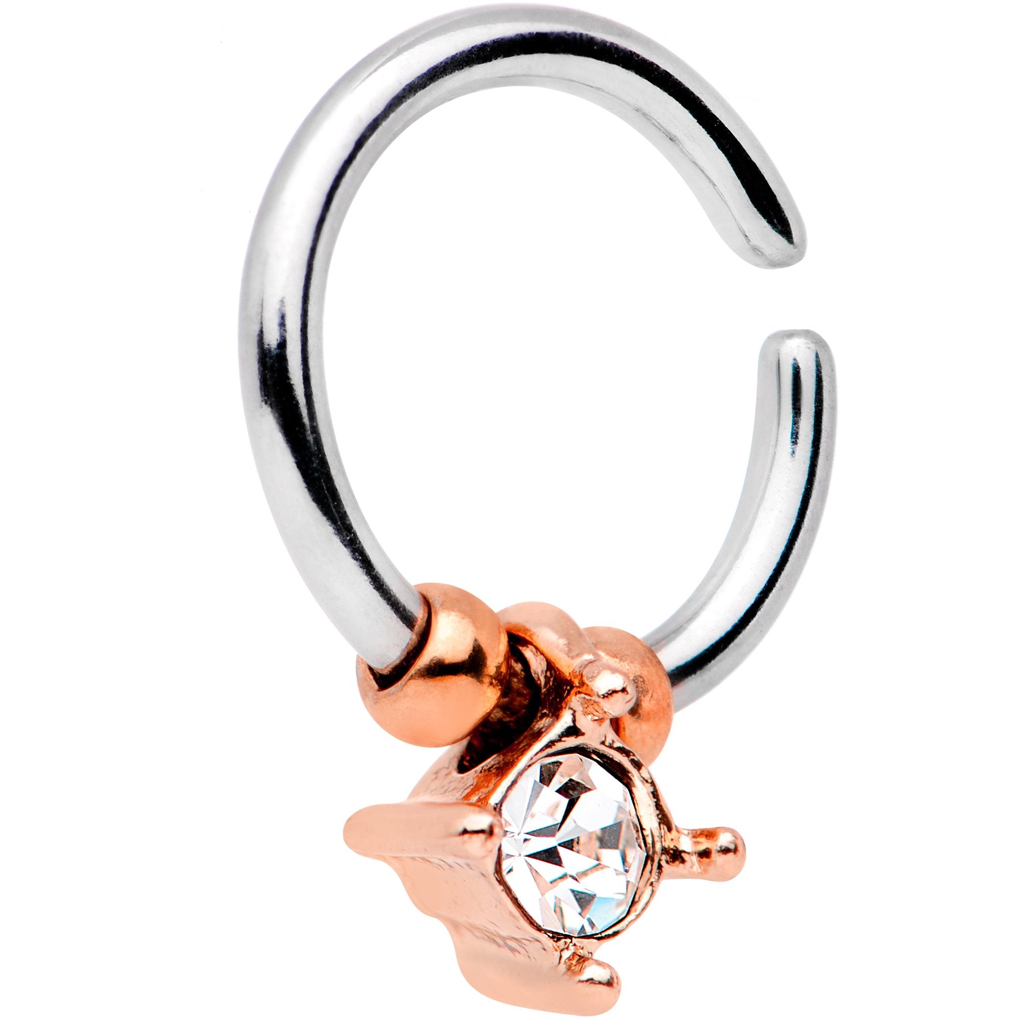 Elegant and fashionable, this 16 gauge seamless circular septum ring features a clear gem dangle set on a rose gold tone prong set dangle charm. The dangle charm is mounted on a 8mm annealed seamless circular ring made with 316L durable surgical grade stainless steel, which can be twisted open easily to fit into your nose piercing and then twisted shut again. This nose jewelry can be used for multiple piercings including your septum, cartilage, or any other place that is a perfect fit for you!
