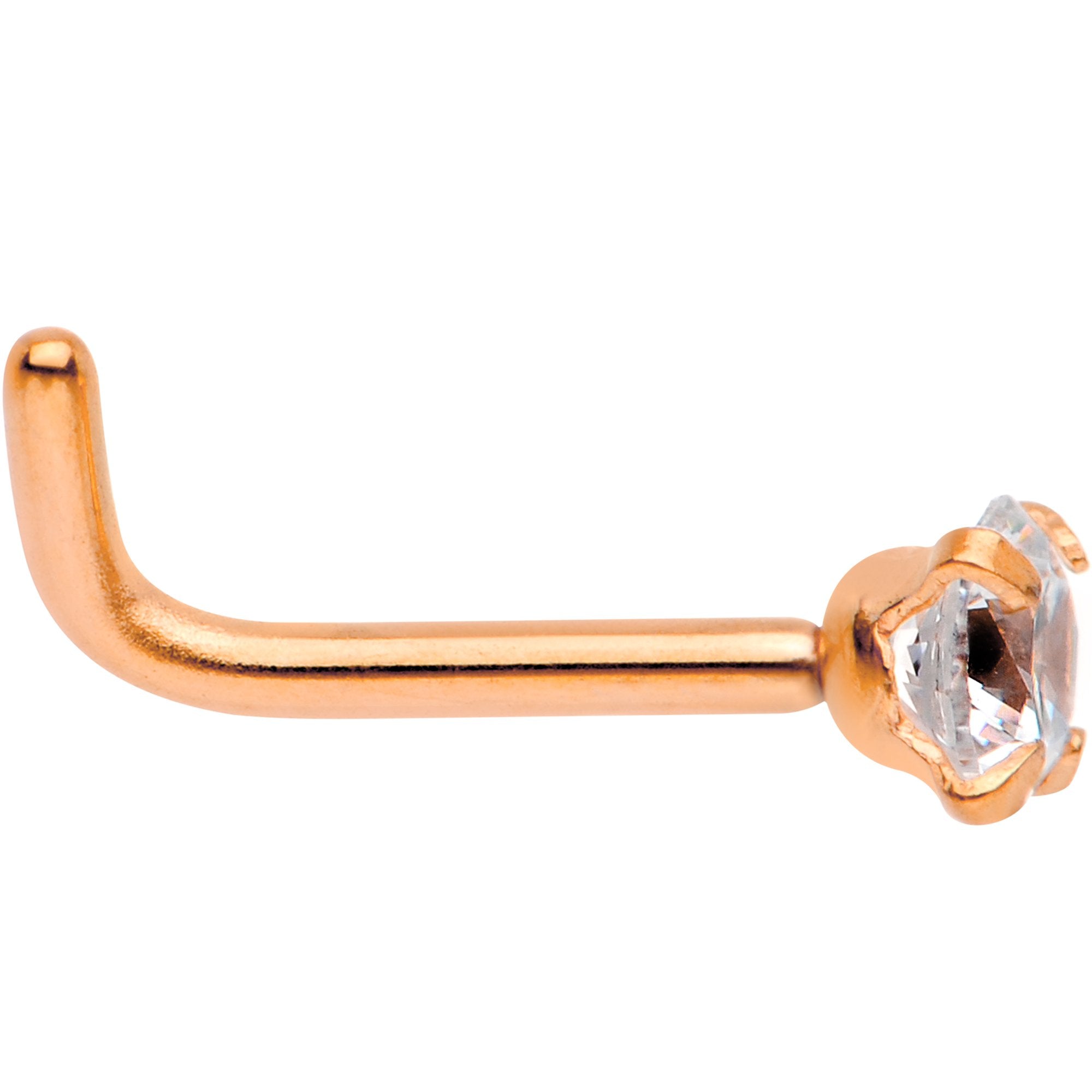 18 Gauge 1/4" Clear 3mm CZ Gem Rose Gold IP L-Shape Nose Ring