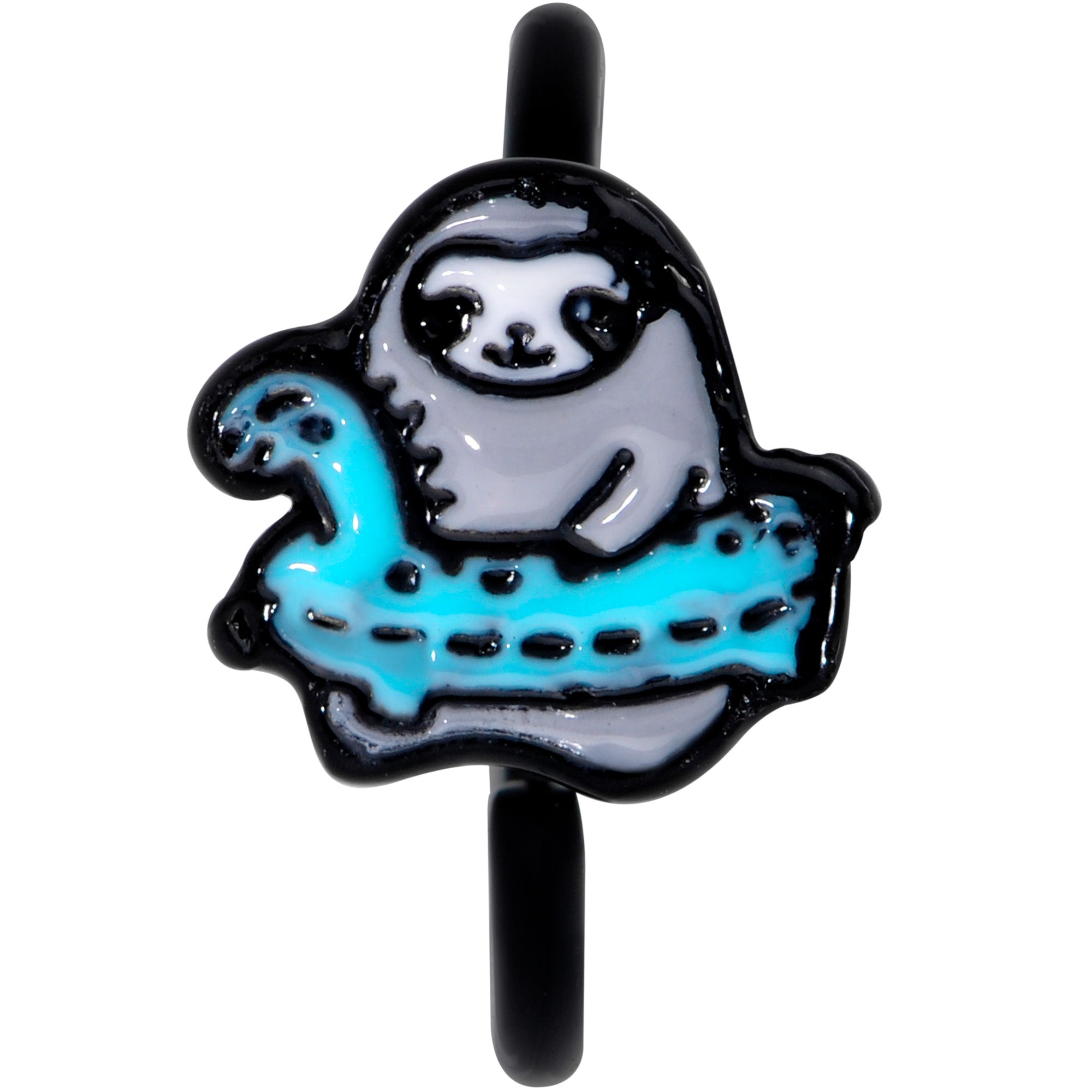 Sloths usually hang out in trees but the one on this 18 gauge nostril ring is off to take a swim! It's made with a 10mm black PVD over 316L surgical grade stainless steel circular ring. It features a an adorable grey and black sloth charm, sitting inside an aqua pool float, complete with a tiny dinosaur head detail! Take your nostril piercing for a deep dive into adorable with this sweet sloth nose ring.