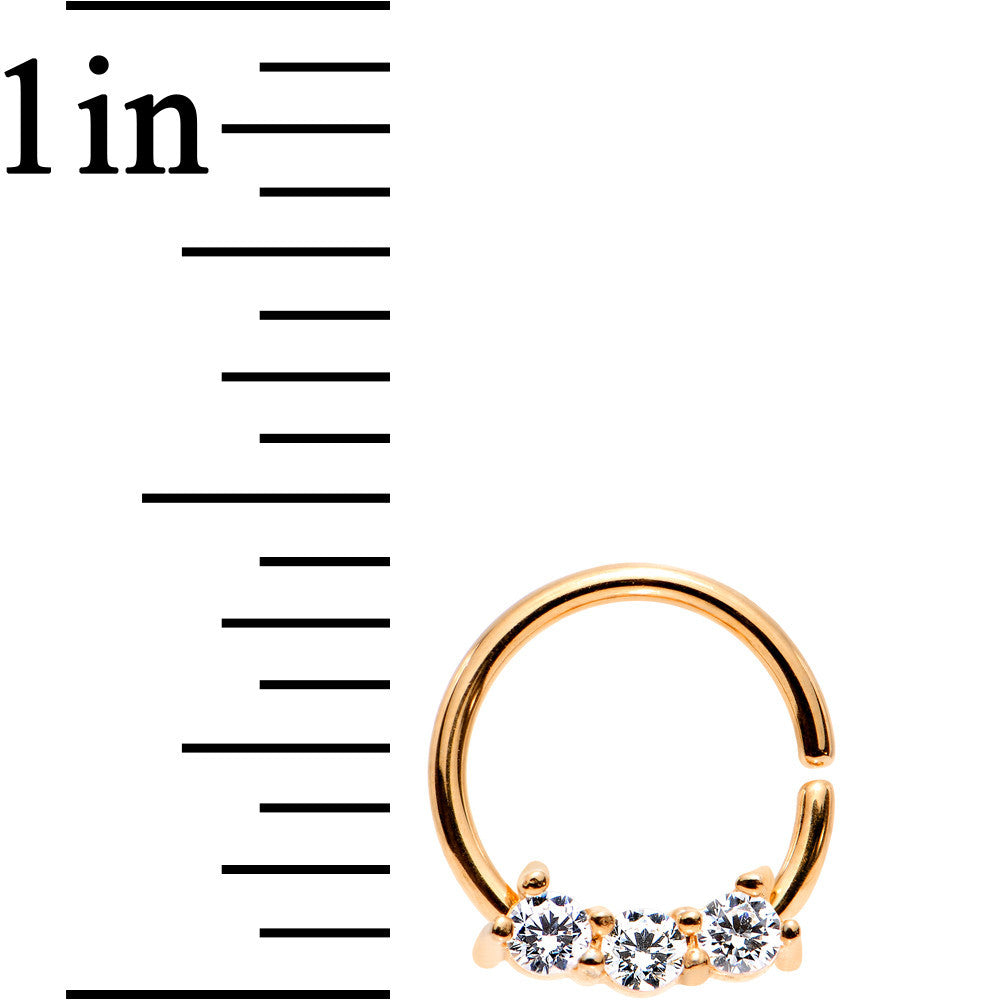 The popularity of the daith piercing has led to a surge of new options and styles to decorate the infamous cartilage piercing, and this 18 gauge circular ring is no exception to the high-style daith earring fashion you need and want. The 8mm diameter ring is made from rose gold IP over durable 316L surgical grade stainless steel. The trio of eye-catching clear cubic zirconia gems that are set along the bottom rim of this cartilage earring set the standard for ear candy sparkle. The best part of all? This body jewelry can be worn in a variety of different cartilage ear piercings and is perfect for achieving that dainty look for your septum piercing if it's already healed from its initial gauge size it was pierced at!