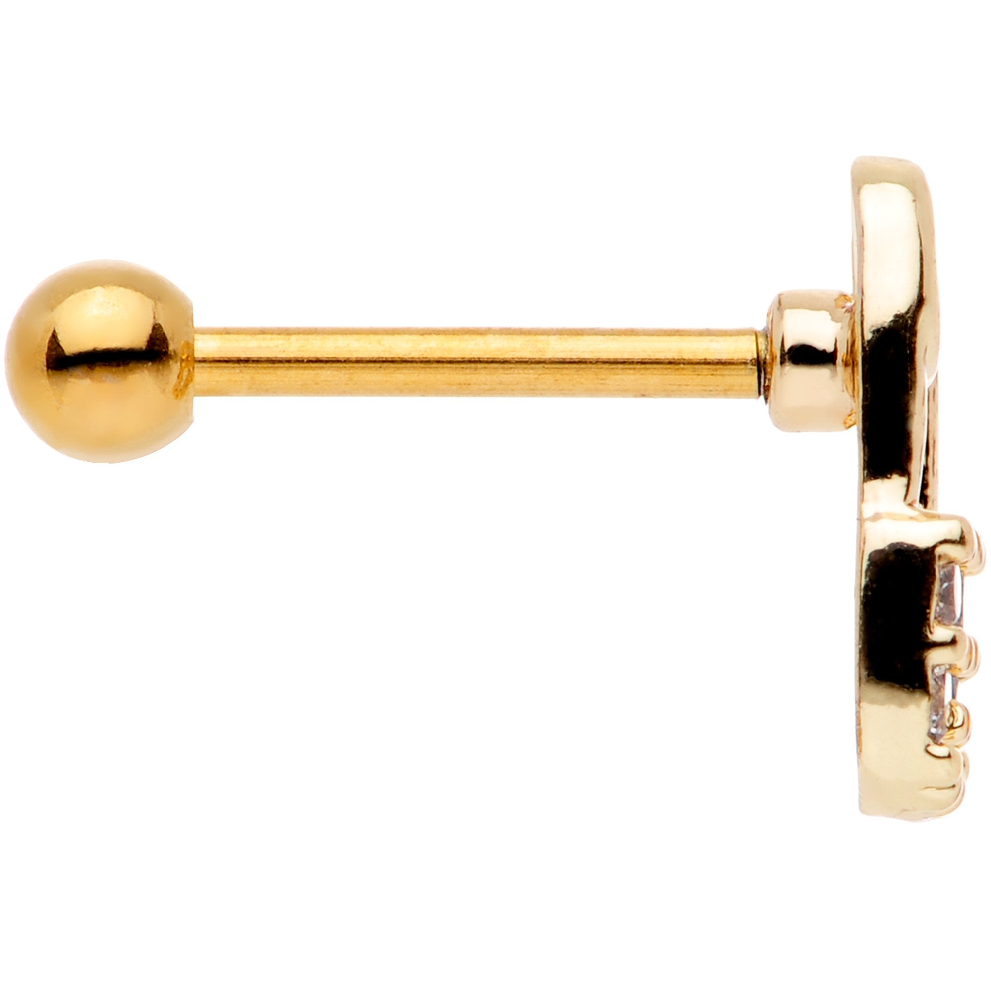 Rock on! Not only does this 18 gauge cartilage earring owe some of its safety pin style to the early days of punk rock, it's also encrusted with five clear gems for some rock and roll glam! At 8mm in length, it's hard to miss the luxuriousness of this gold tone plated over durable 316L surgical grade stainless steel straight barbell. Show off your wild side without breaking the bank with this punk inspired tragus earring.